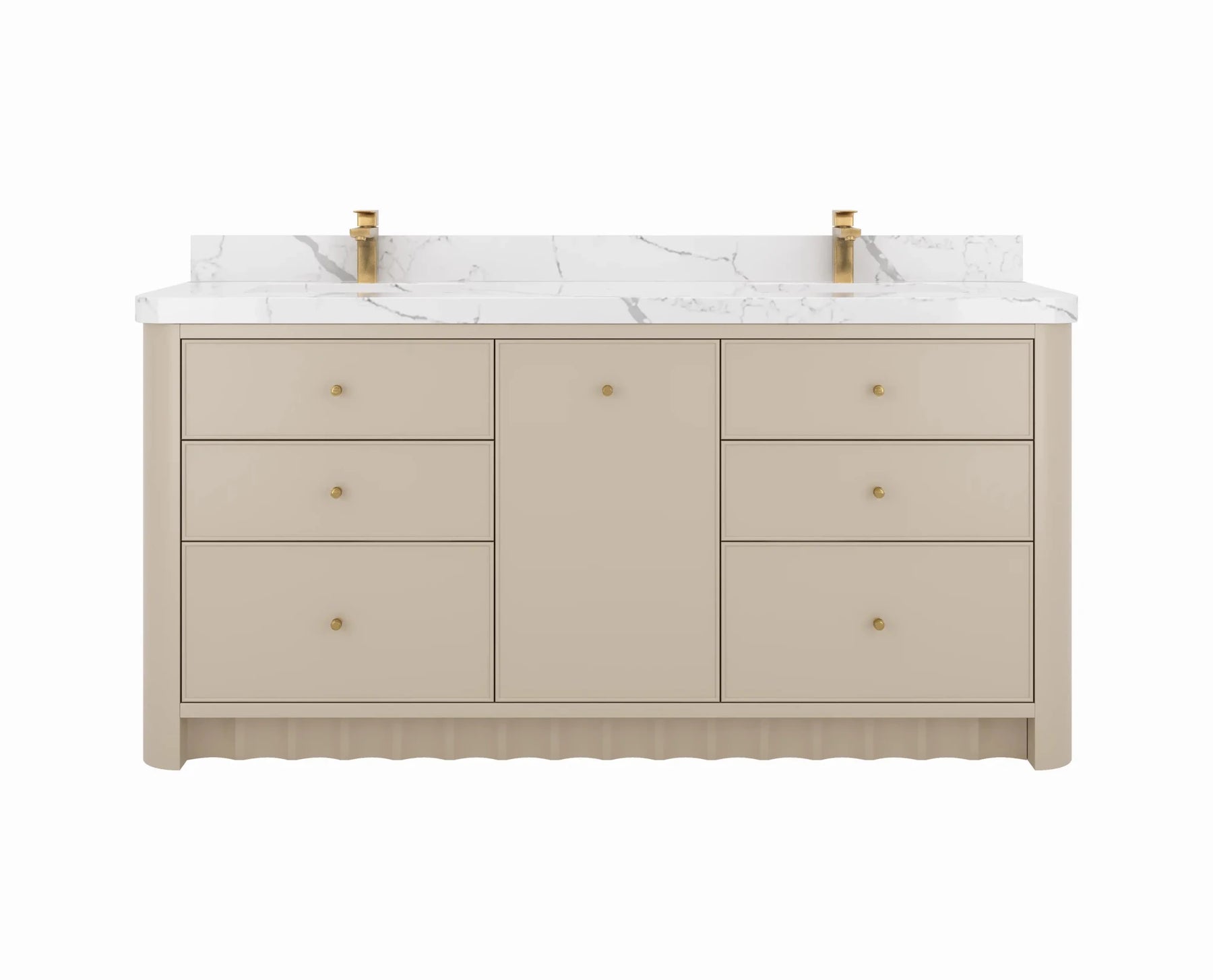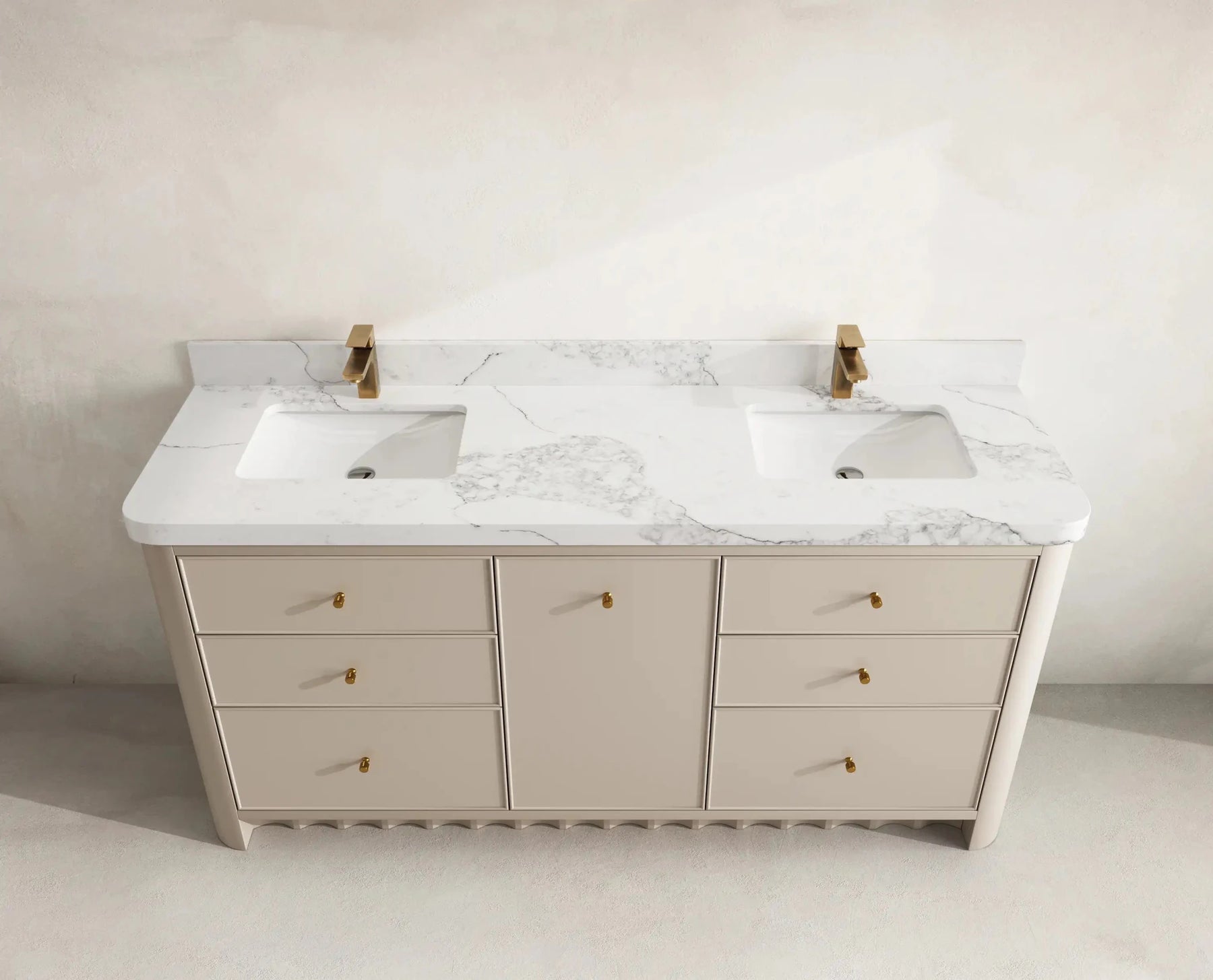The Orlando Vanity features clean contemporary lines, natural wood-tone interiors, and smooth-glide joinery built for exceptional durability. Its rounded-edge countertop enhances comfort while adding a refined, high-end visual appeal. Gold hardware accents complete the sophisticated aesthetic, making this vanity a true statement piece in any bathroom setting.