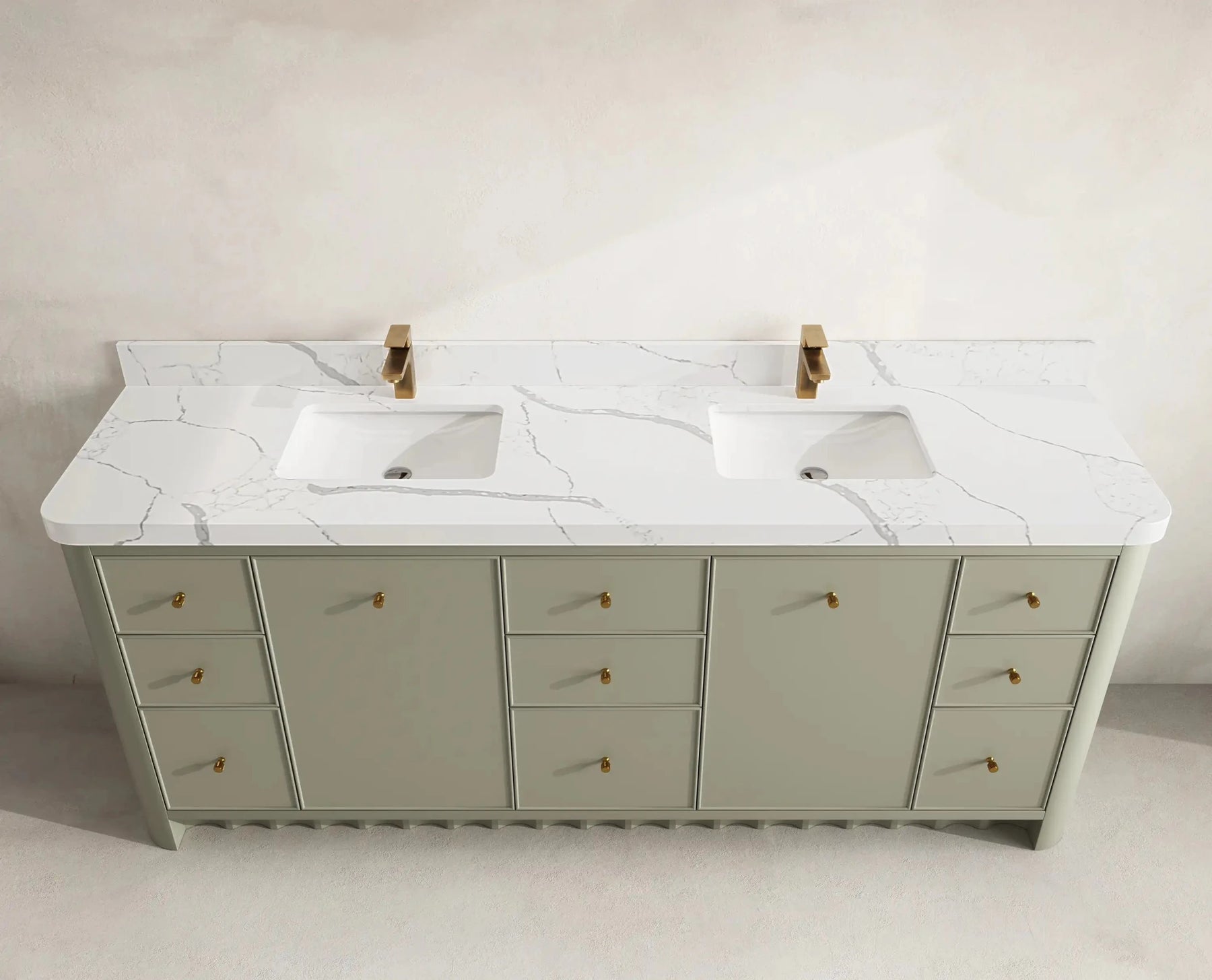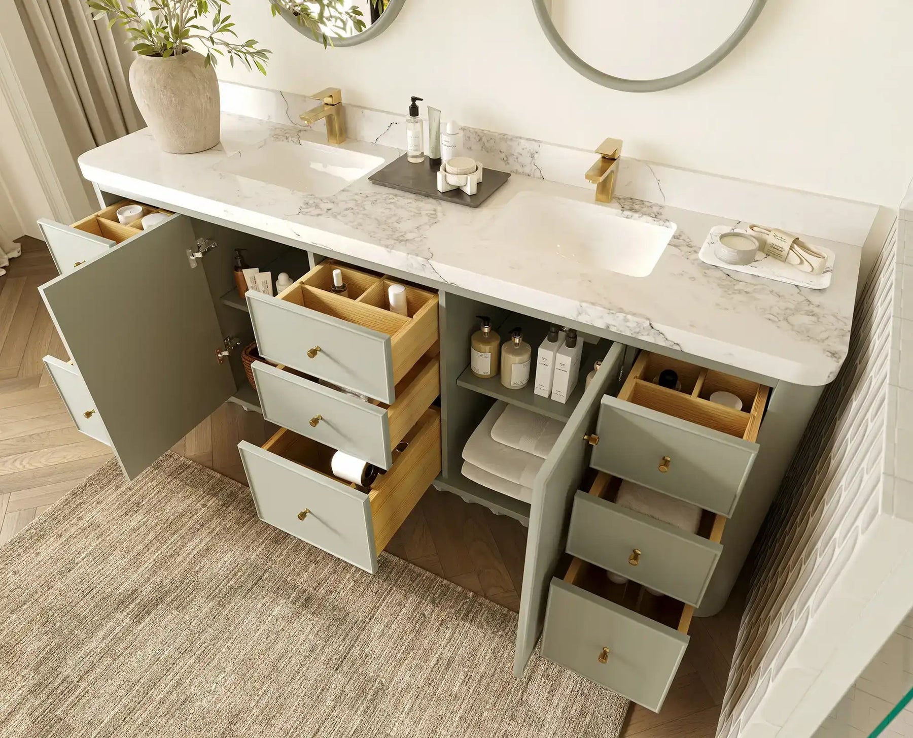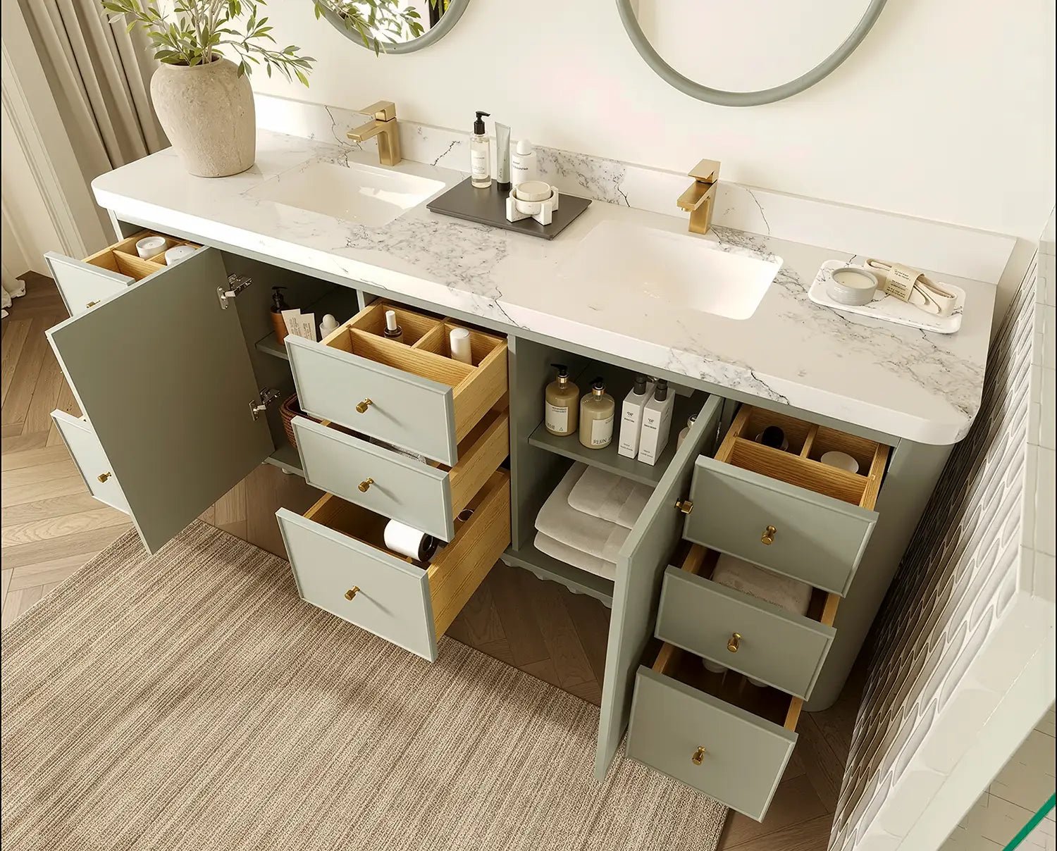 Inside, the vanity delivers generous storage with multiple drawers, open shelving, and spacious cabinet compartments—ideal for organizing towels, toiletries, skincare essentials, and grooming items. Its symmetrical, well-balanced layout keeps your bathroom neat, organized, and clutter-free while elevating both functionality and style.