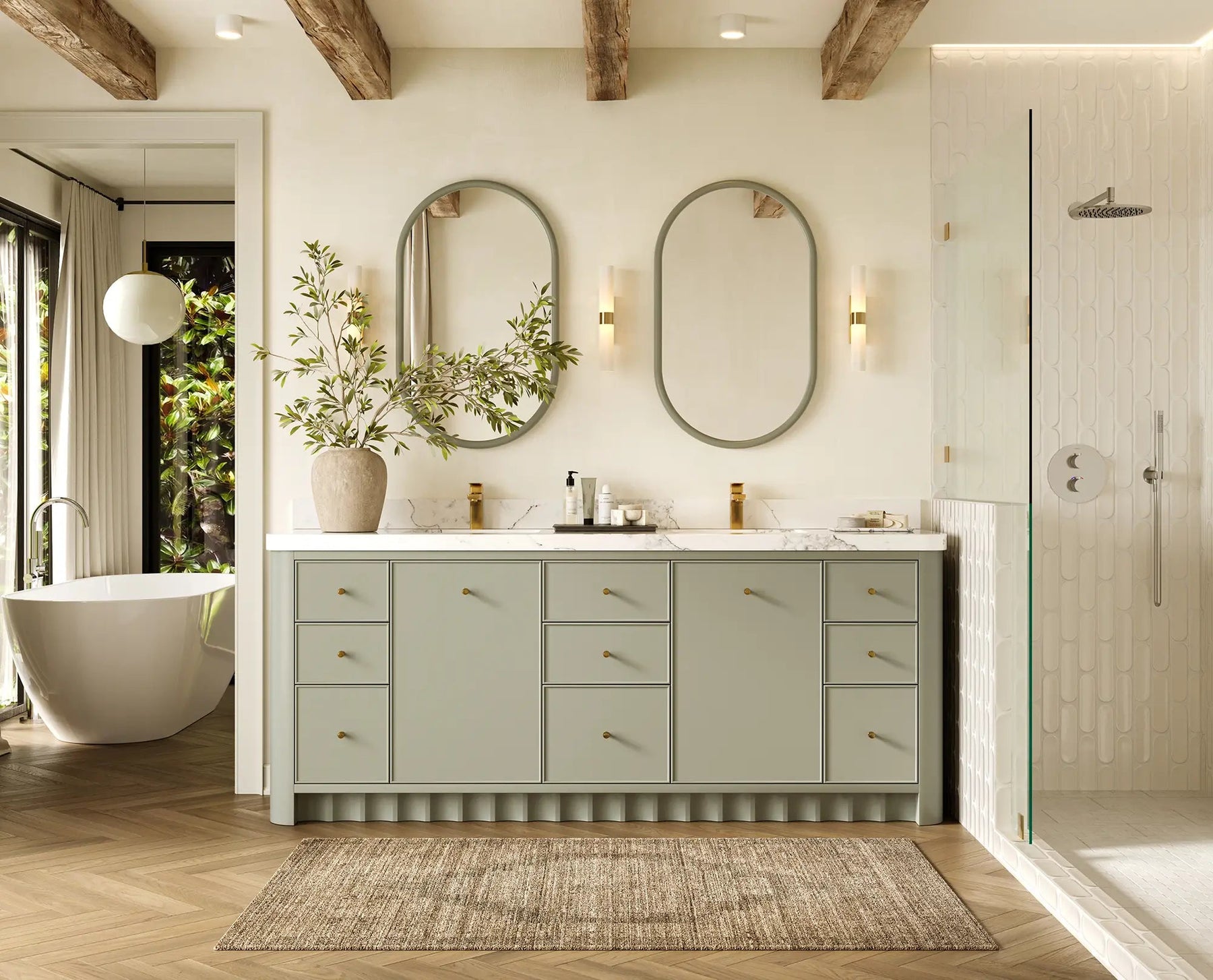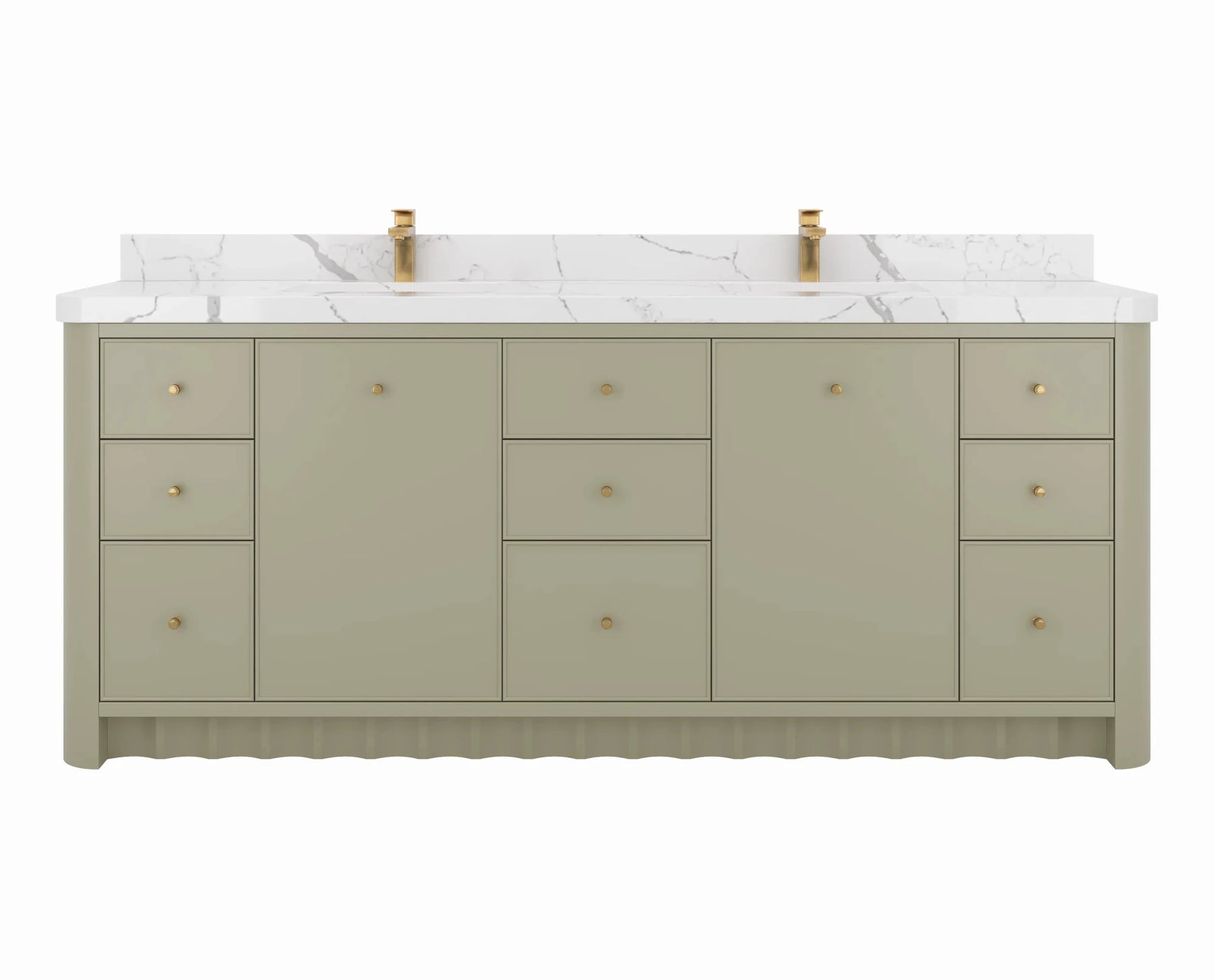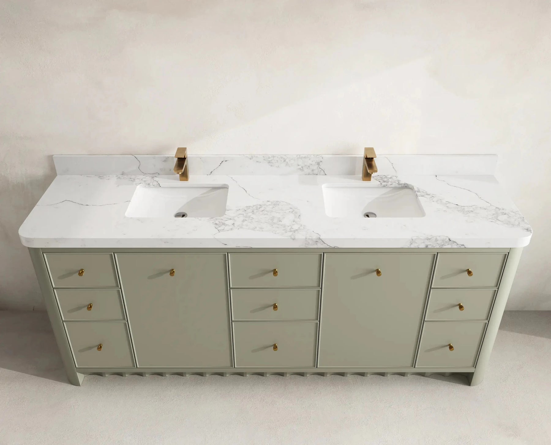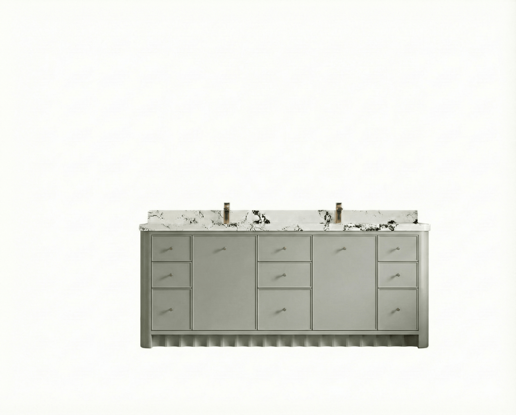 Inside, the vanity delivers generous storage with multiple drawers, open shelving, and spacious cabinet compartments—ideal for organizing towels, toiletries, skincare essentials, and grooming items. Its symmetrical, well-balanced layout keeps your bathroom neat, organized, and clutter-free while elevating both functionality and style.