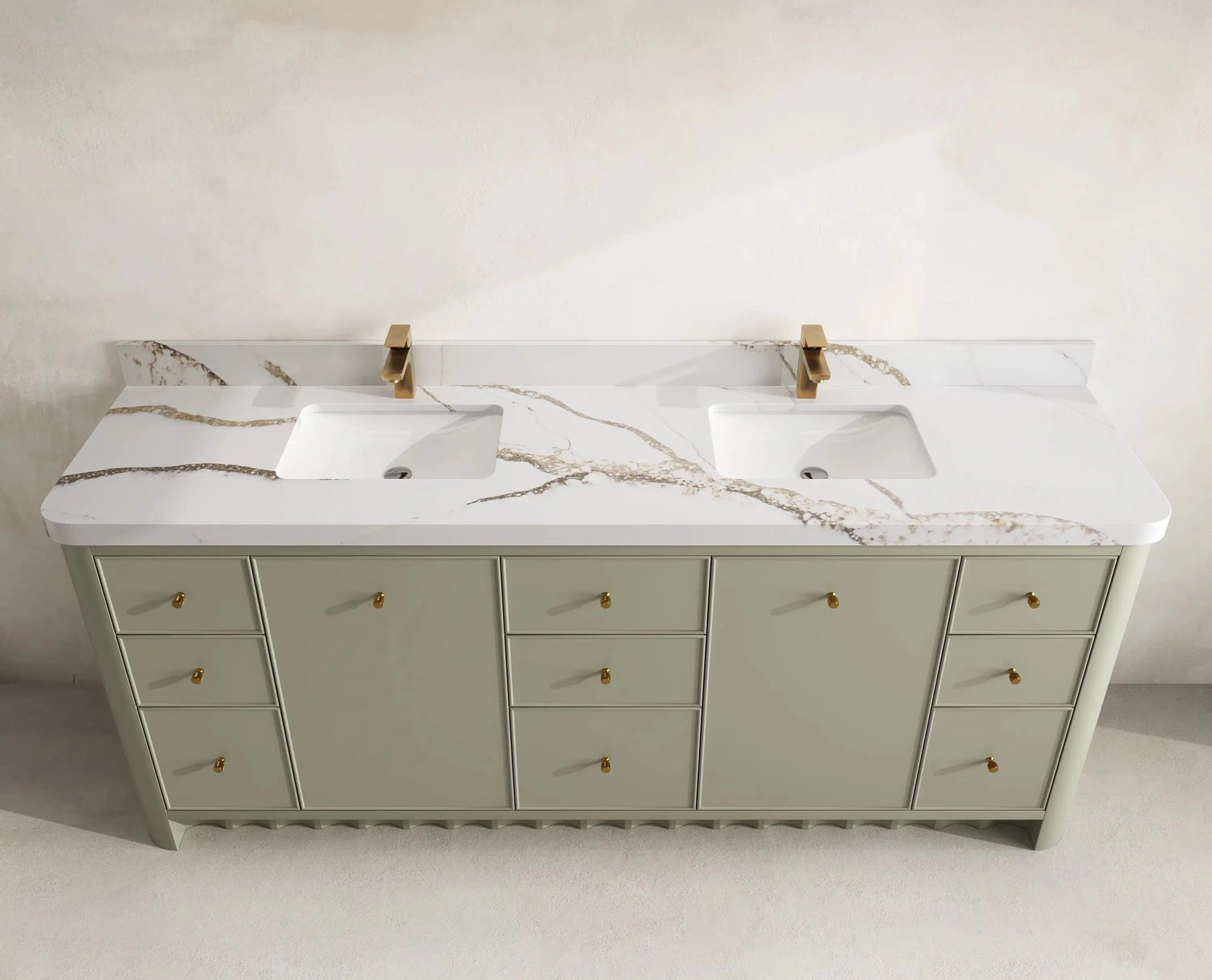 The Orlando Vanity features clean contemporary lines, natural wood-tone interiors, and smooth-glide joinery built for exceptional durability. Its rounded-edge countertop enhances comfort while adding a refined, high-end visual appeal. Gold hardware accents complete the sophisticated aesthetic, making this vanity a true statement piece in any bathroom setting.