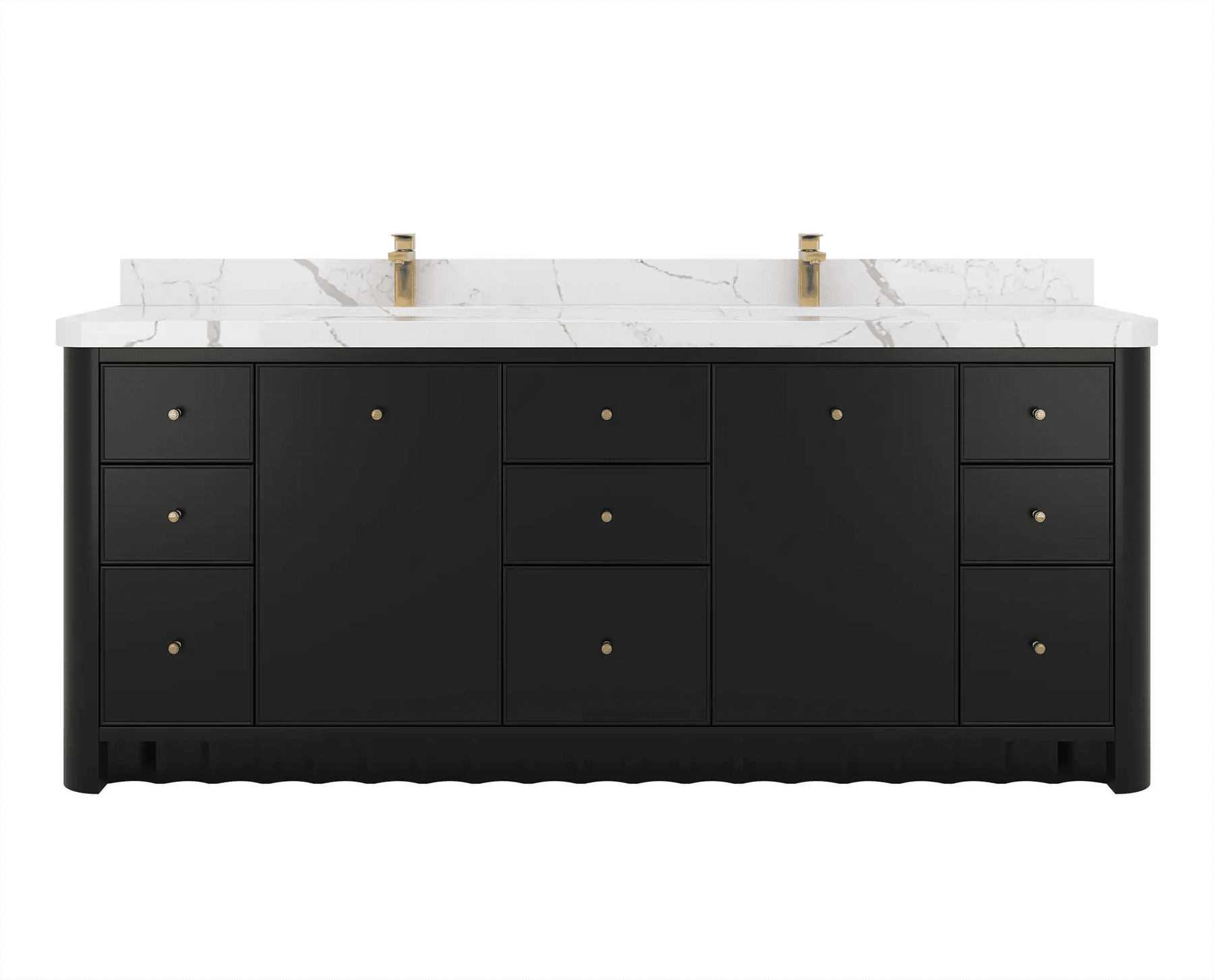 Inside, the vanity delivers generous storage with multiple drawers, open shelving, and spacious cabinet compartments—ideal for organizing towels, toiletries, skincare essentials, and grooming items. Its symmetrical, well-balanced layout keeps your bathroom neat, organized, and clutter-free while elevating both functionality and style.
