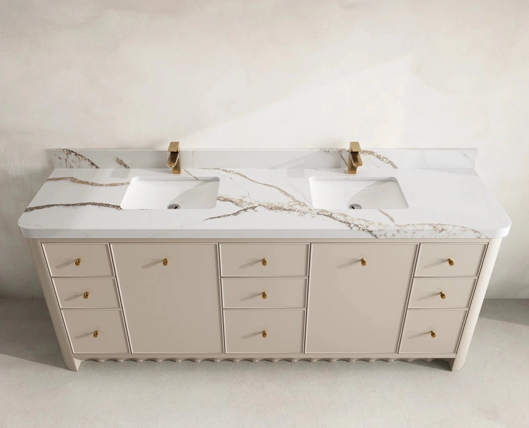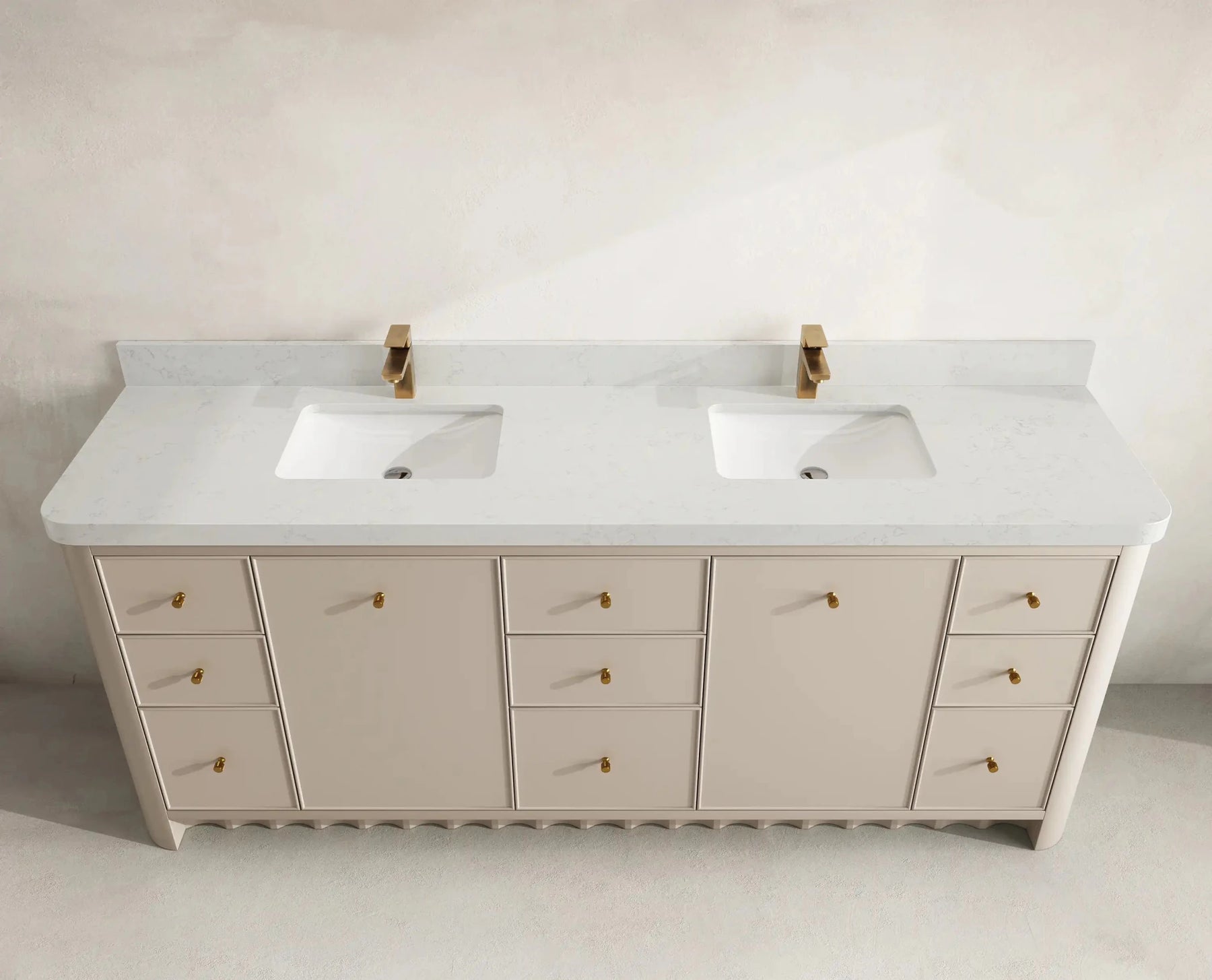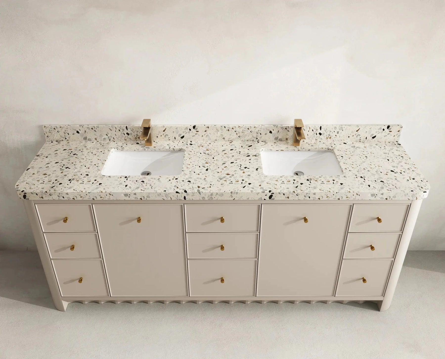 Vanity Countertops options: For Calacatta Laza Quartz, Calacatta Gold Quartz, Empira White Quartz, Pure White Quartz, Palissandro Quartz, Calacatta Nuvo Quartz, Carrara Marble, Carrara Quartz, Calacatta Sienna Quartz, Terrazzo Arctic Breeze, Terrazzo Golden Dusk we have Rounded - Edge option.