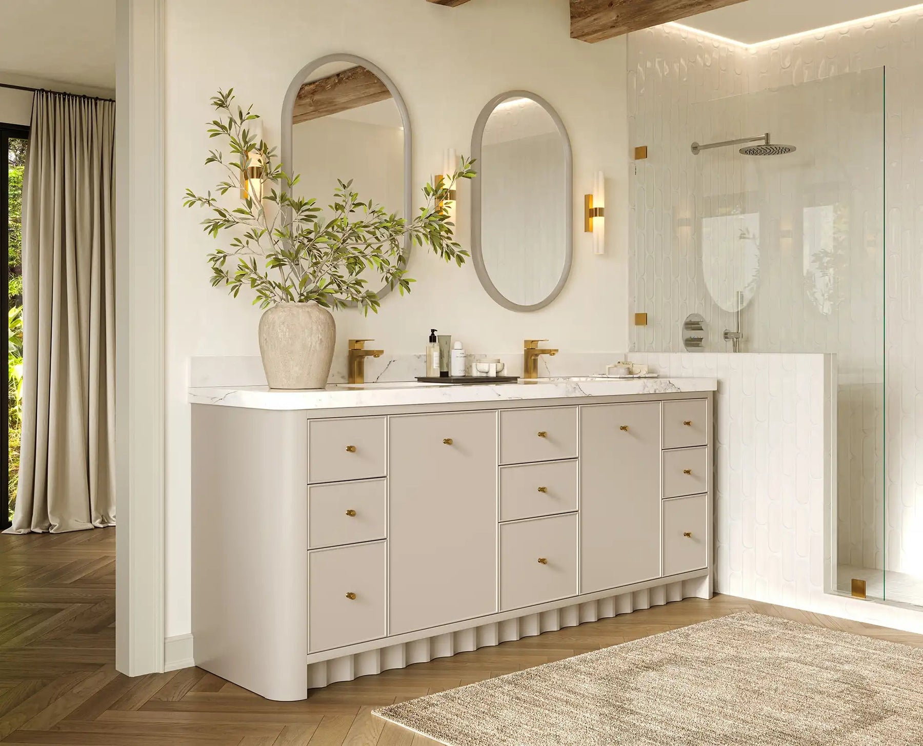 The Orlando Vanity features clean contemporary lines, natural wood-tone interiors, and smooth-glide joinery built for exceptional durability. Its rounded-edge countertop enhances comfort while adding a refined, high-end visual appeal. Gold hardware accents complete the sophisticated aesthetic, making this vanity a true statement piece in any bathroom setting.