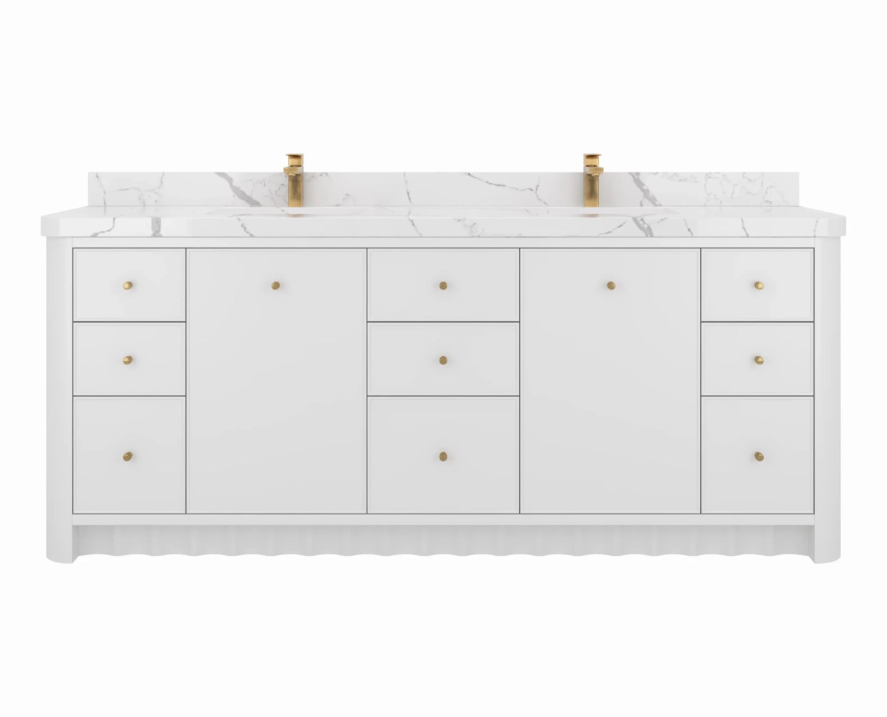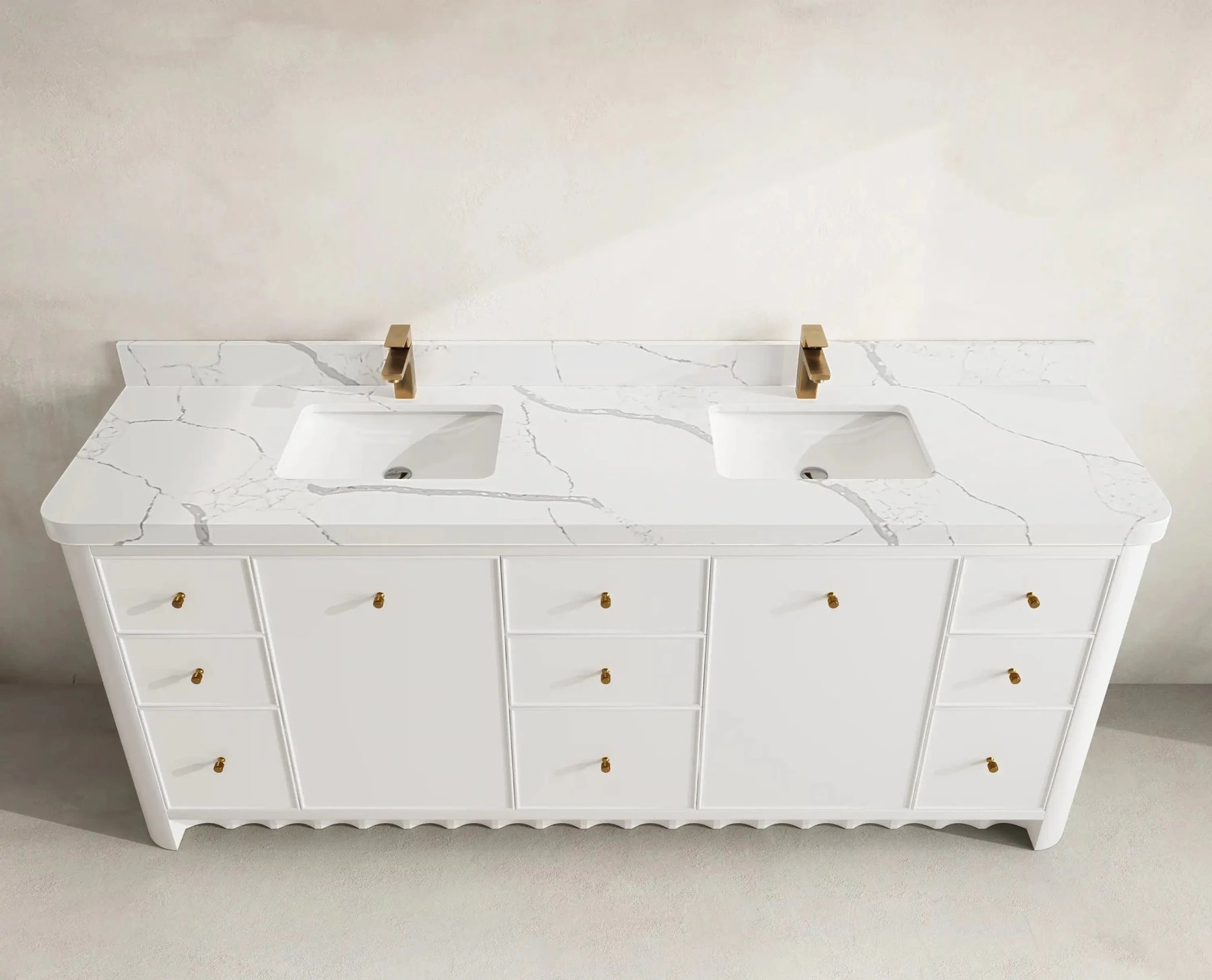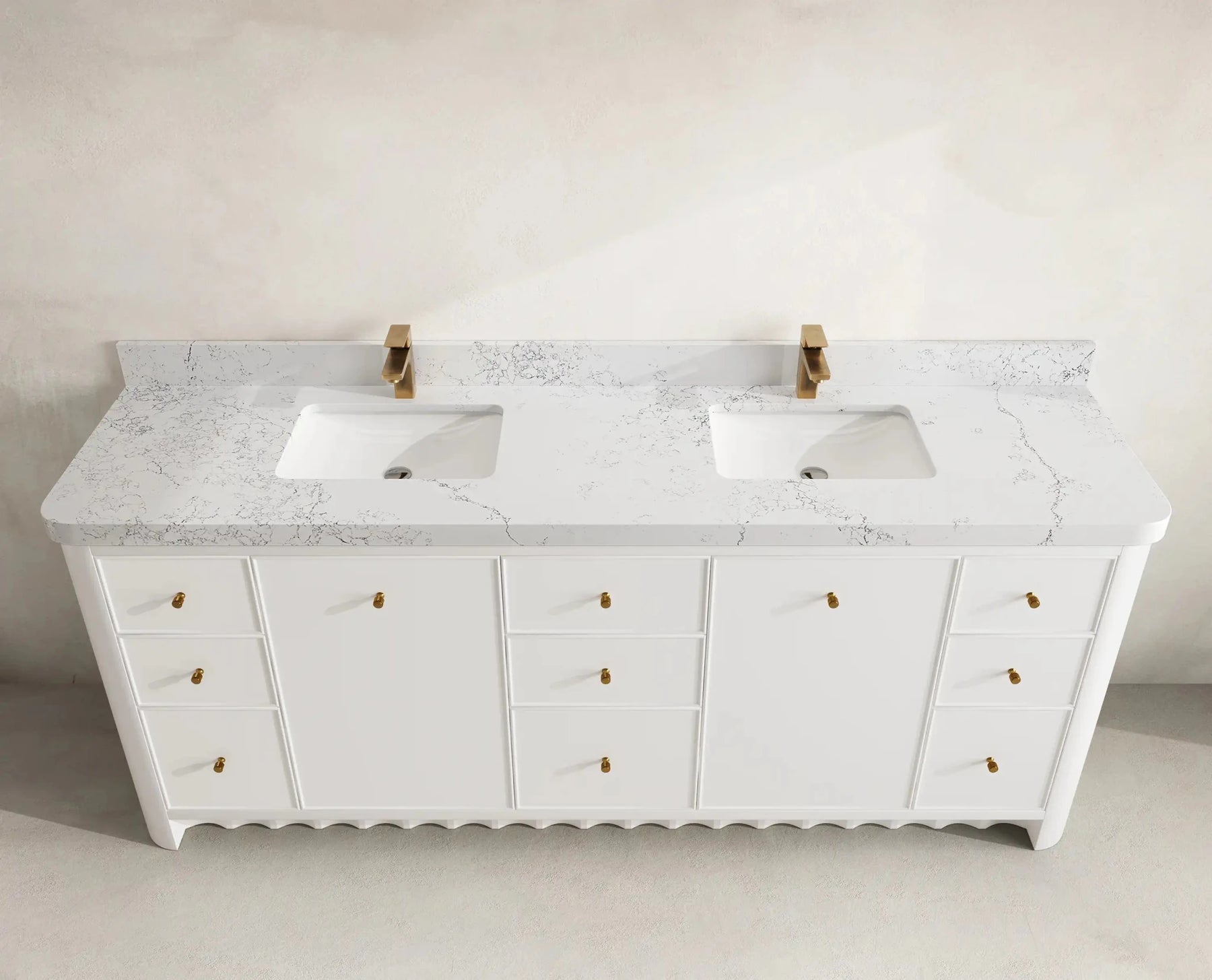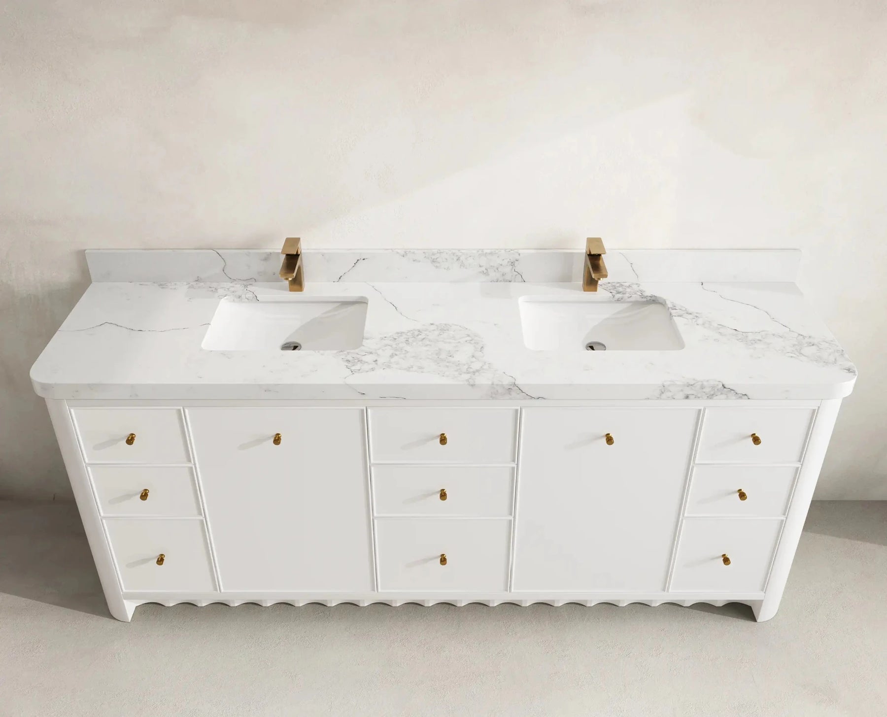 Vanity Countertops options: For Calacatta Laza Quartz, Calacatta Gold Quartz, Empira White Quartz, Pure White Quartz, Palissandro Quartz, Calacatta Nuvo Quartz, Carrara Marble, Carrara Quartz, Calacatta Sienna Quartz, Terrazzo Arctic Breeze, Terrazzo Golden Dusk we have Rounded - Edge option.