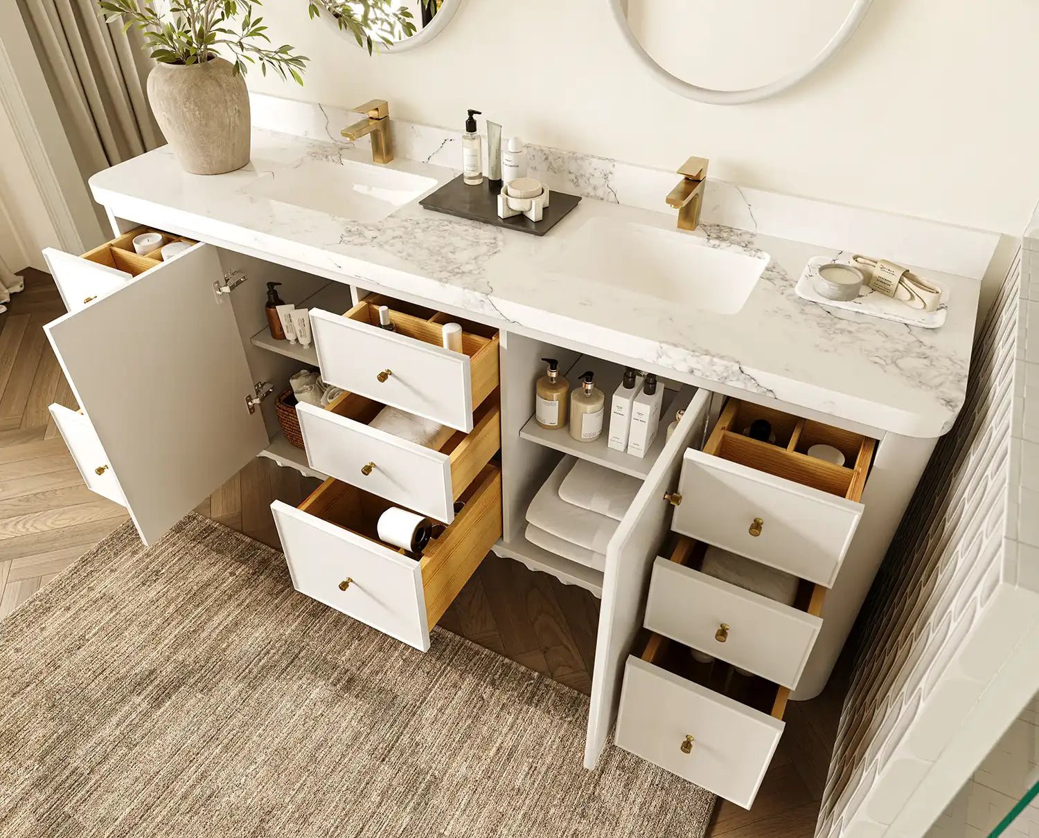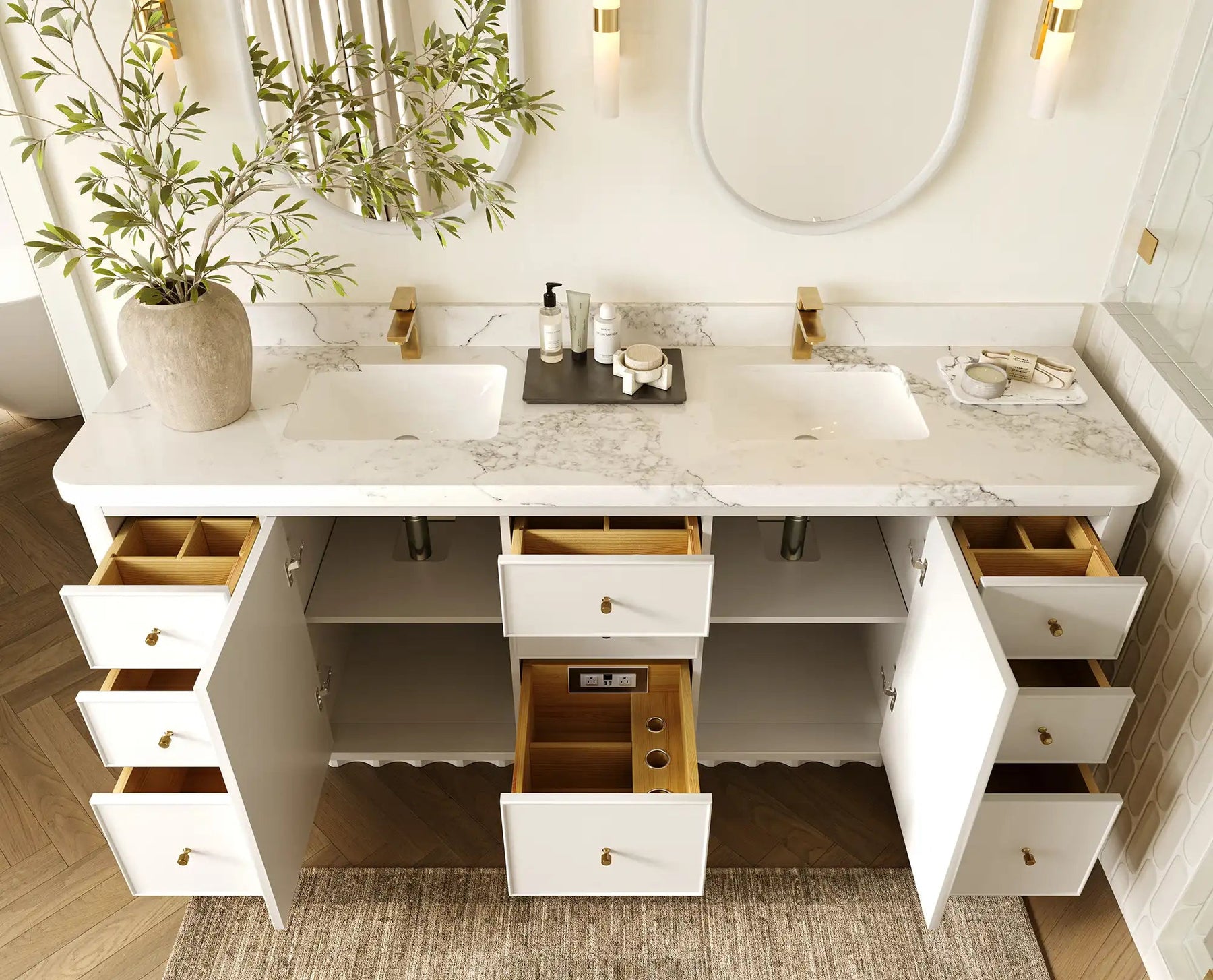 Inside, the vanity delivers generous storage with multiple drawers, open shelving, and spacious cabinet compartments—ideal for organizing towels, toiletries, skincare essentials, and grooming items. Its symmetrical, well-balanced layout keeps your bathroom neat, organized, and clutter-free while elevating both functionality and style.