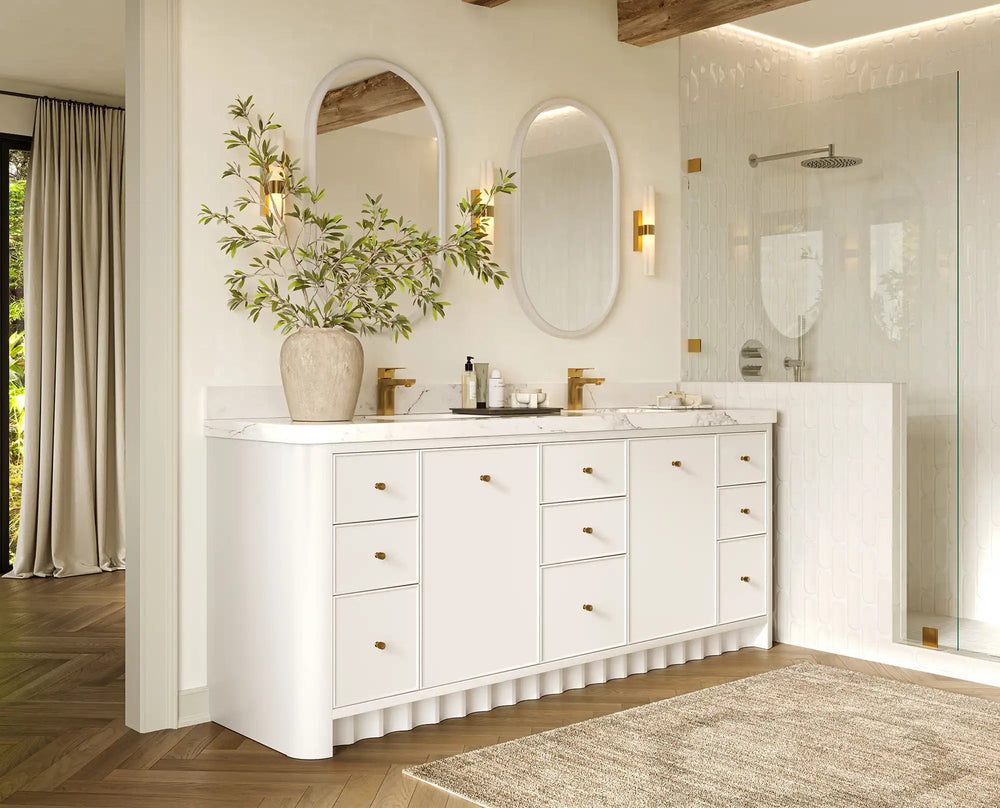 The Orlando Vanity features clean contemporary lines, natural wood-tone interiors, and smooth-glide joinery built for exceptional durability. Its rounded-edge countertop enhances comfort while adding a refined, high-end visual appeal. Gold hardware accents complete the sophisticated aesthetic, making this vanity a true statement piece in any bathroom setting.