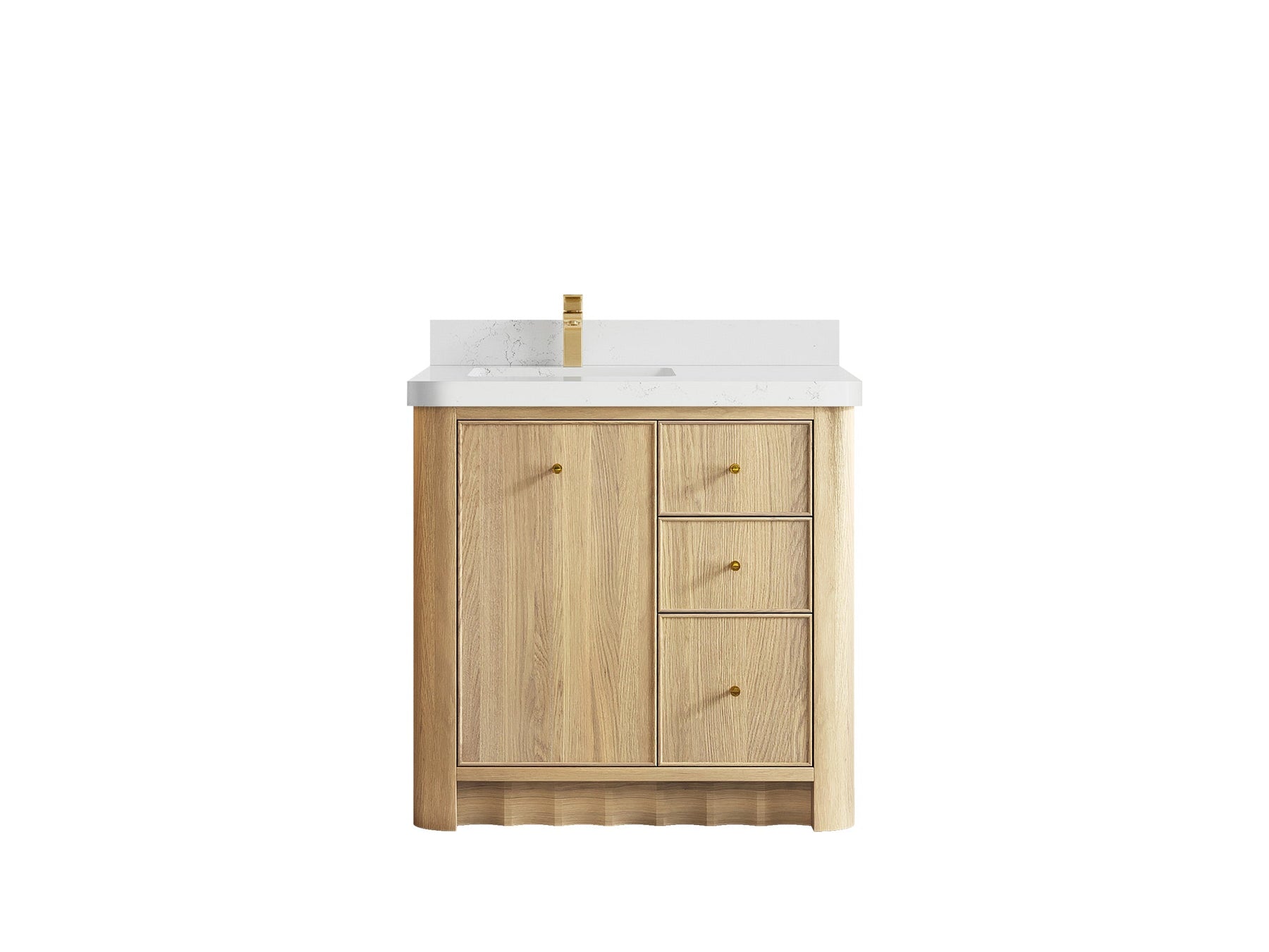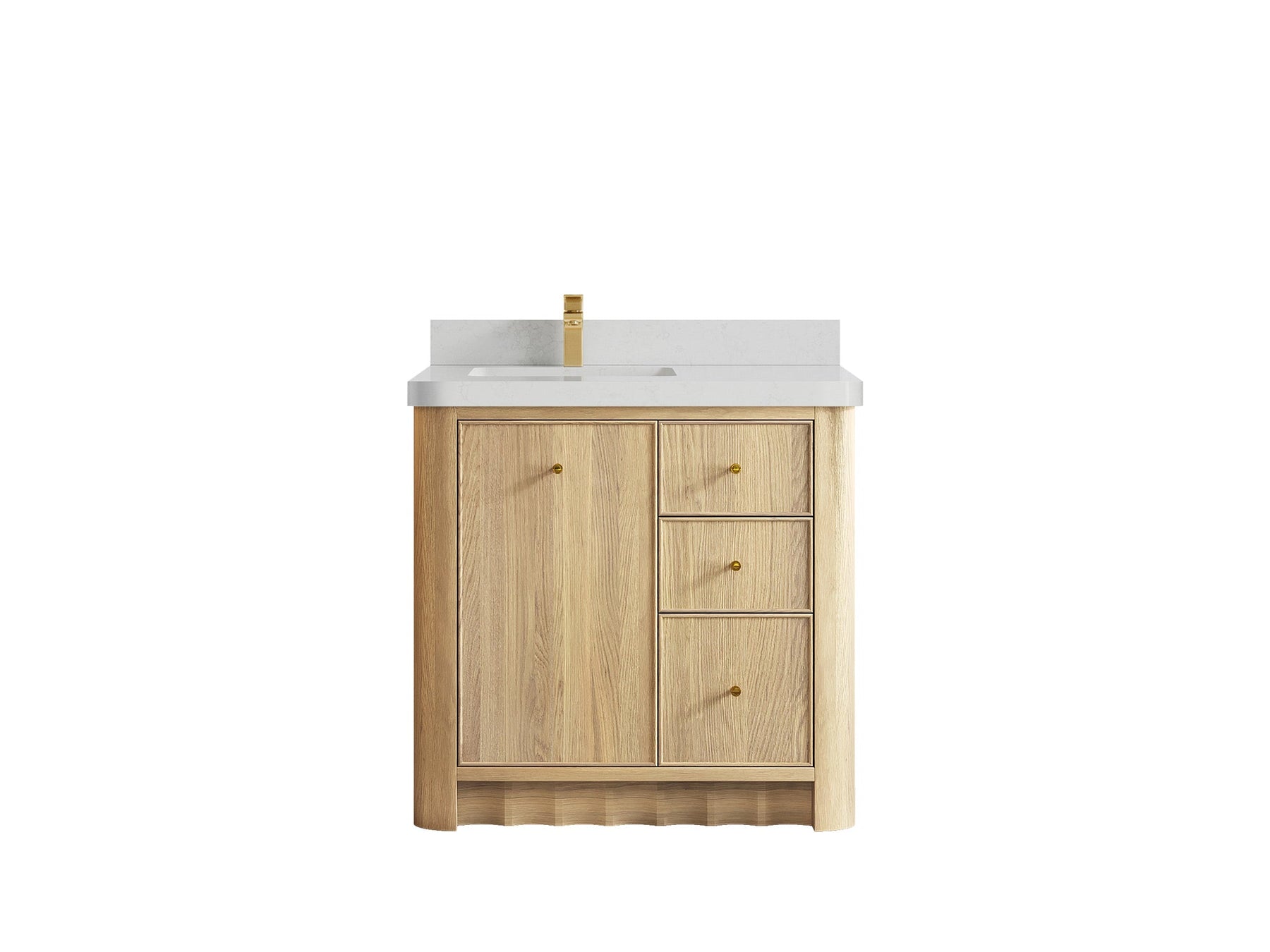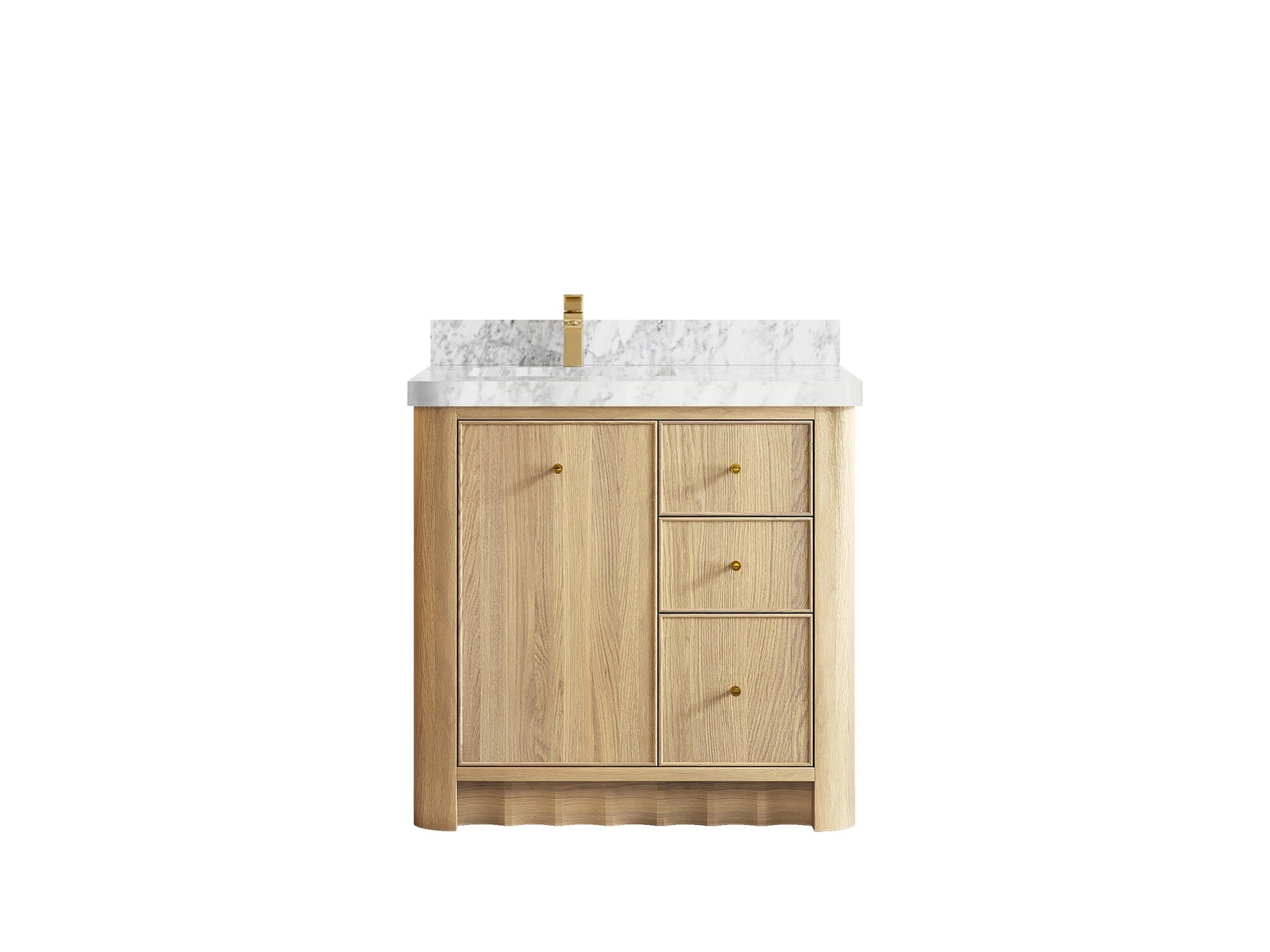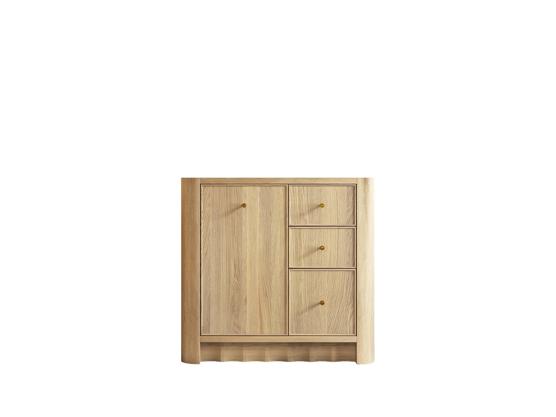 Built from solid white oak in a warm Nordic White Oak finish, Orlando highlights natural wood beauty with curved cabinet edges and a rounded countertop profile that bring a soft, organic flow to the design. Its dovetail joint construction ensures long-lasting durability, while the fluted kick plate adds a refined architectural detail.