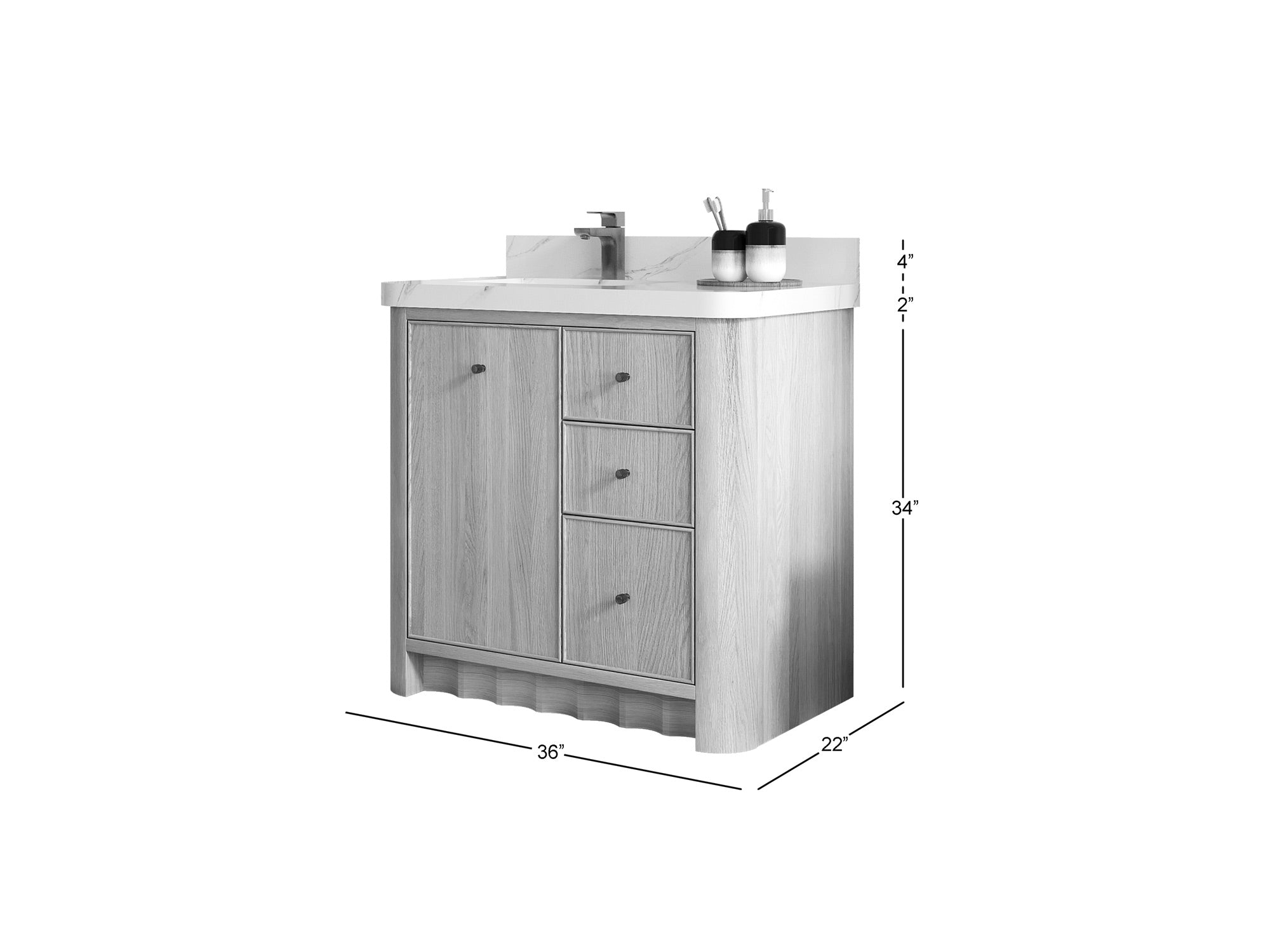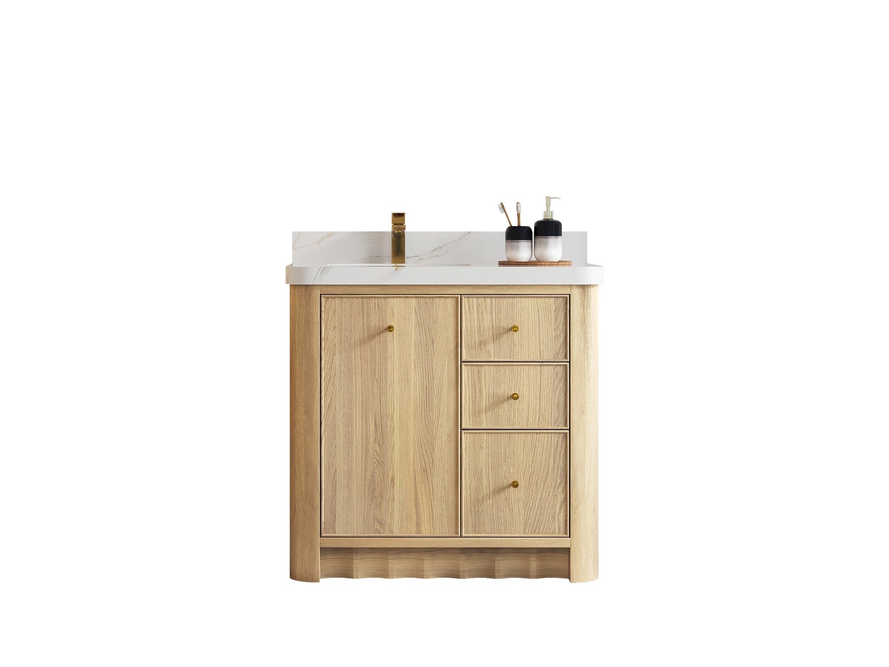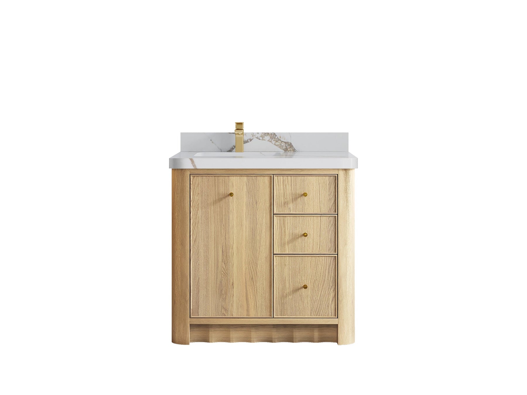 Built from solid white oak in a warm Nordic White Oak finish, Orlando highlights natural wood beauty with curved cabinet edges and a rounded countertop profile that bring a soft, organic flow to the design. Its dovetail joint construction ensures long-lasting durability, while the fluted kick plate adds a refined architectural detail.