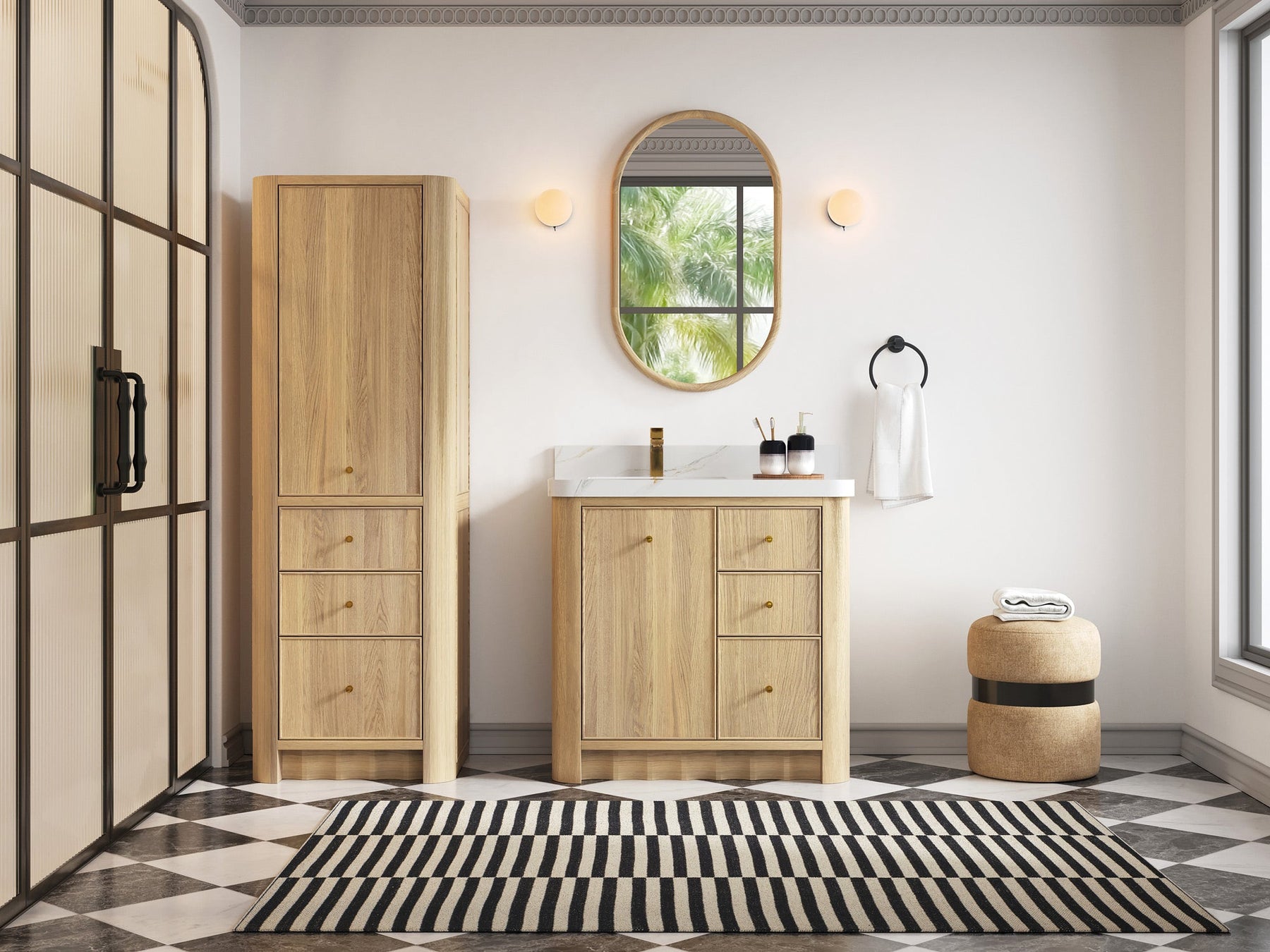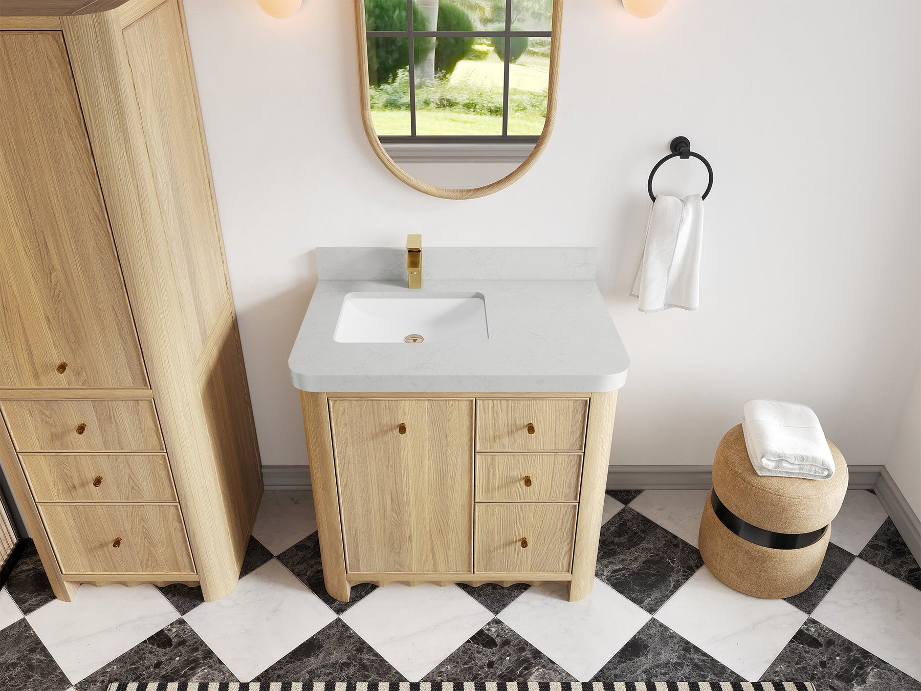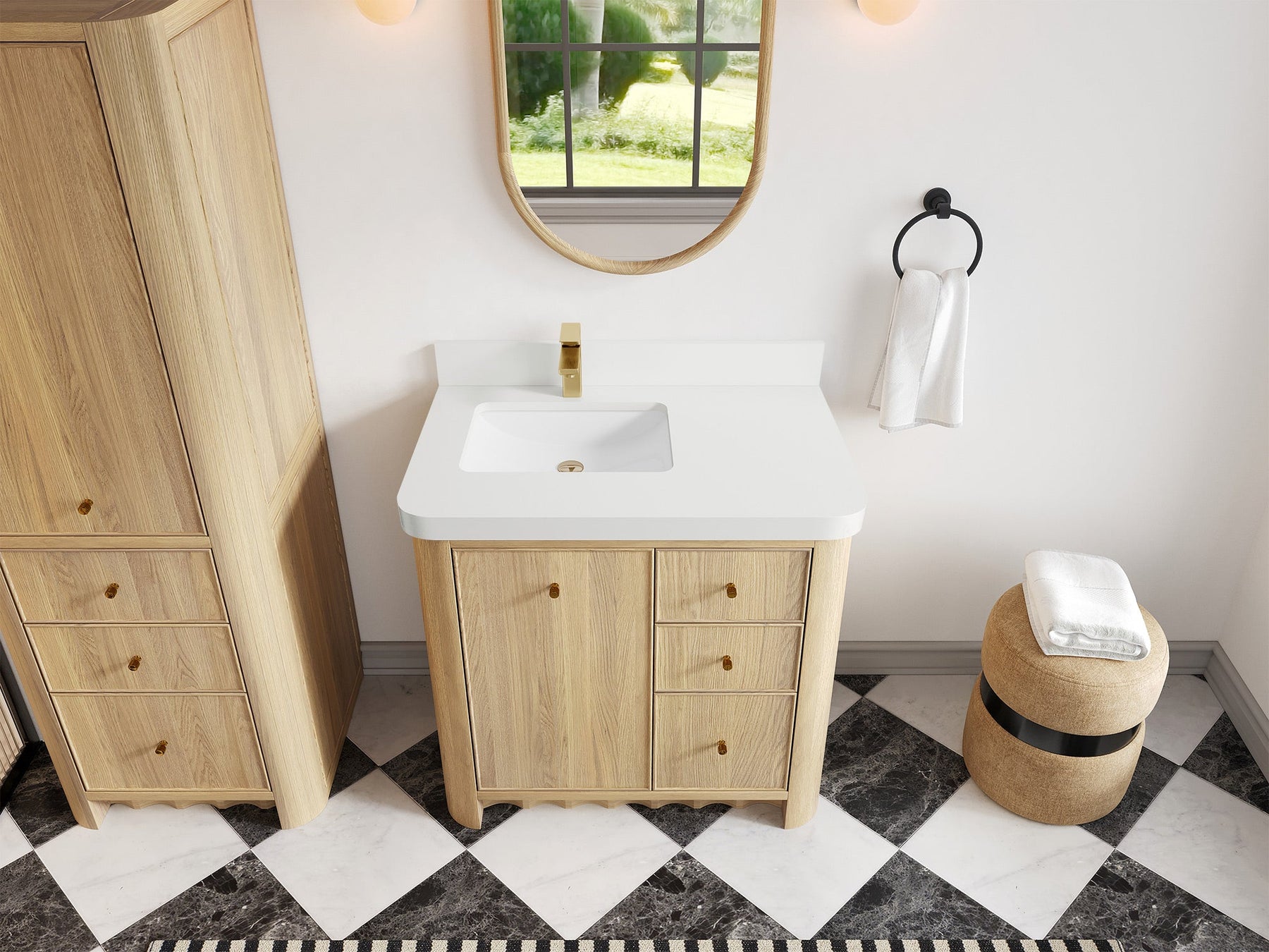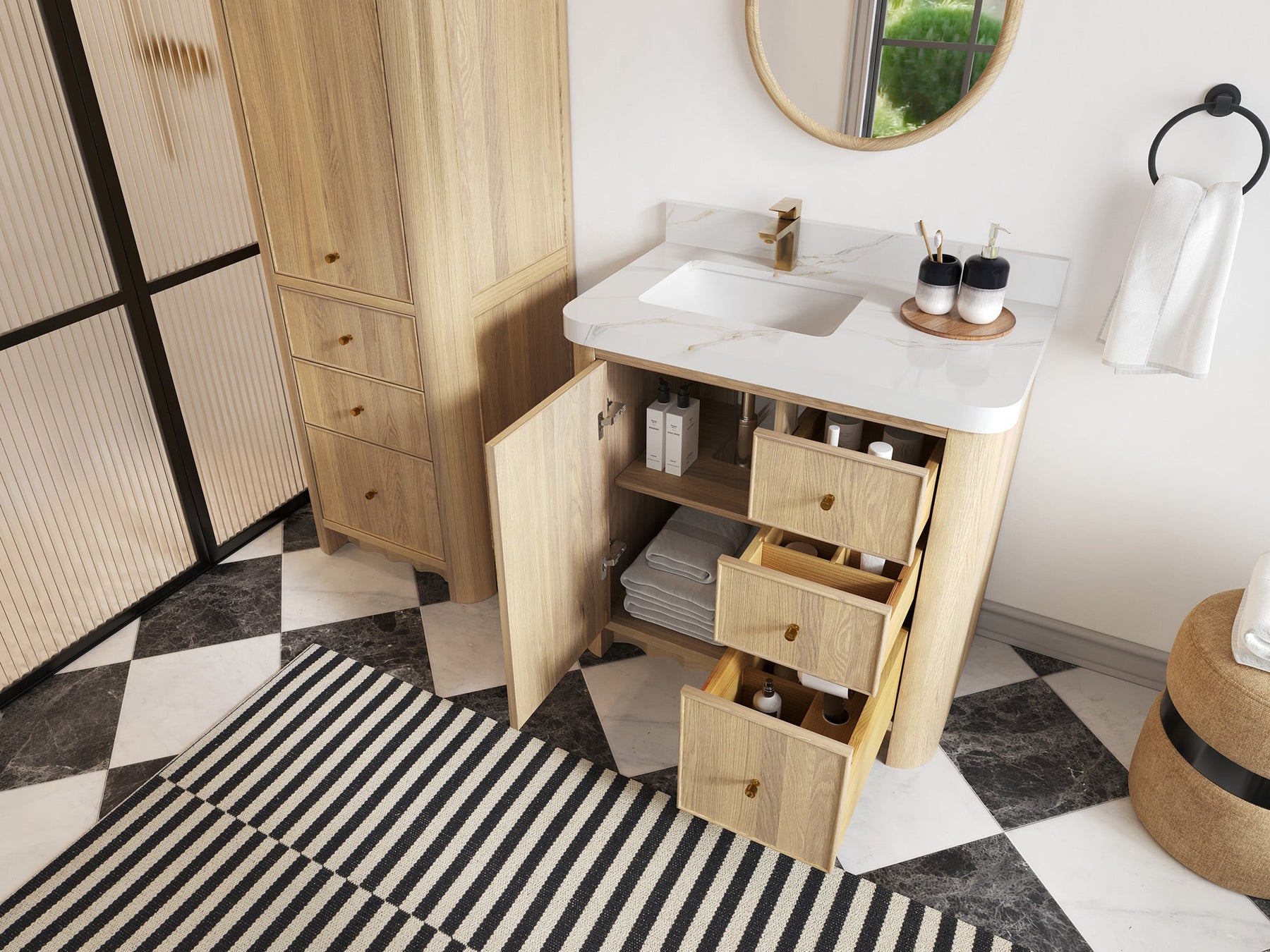 Built from solid white oak in a warm Nordic White Oak finish, Orlando highlights natural wood beauty with curved cabinet edges and a rounded countertop profile that bring a soft, organic flow to the design. Its dovetail joint construction ensures long-lasting durability, while the fluted kick plate adds a refined architectural detail.