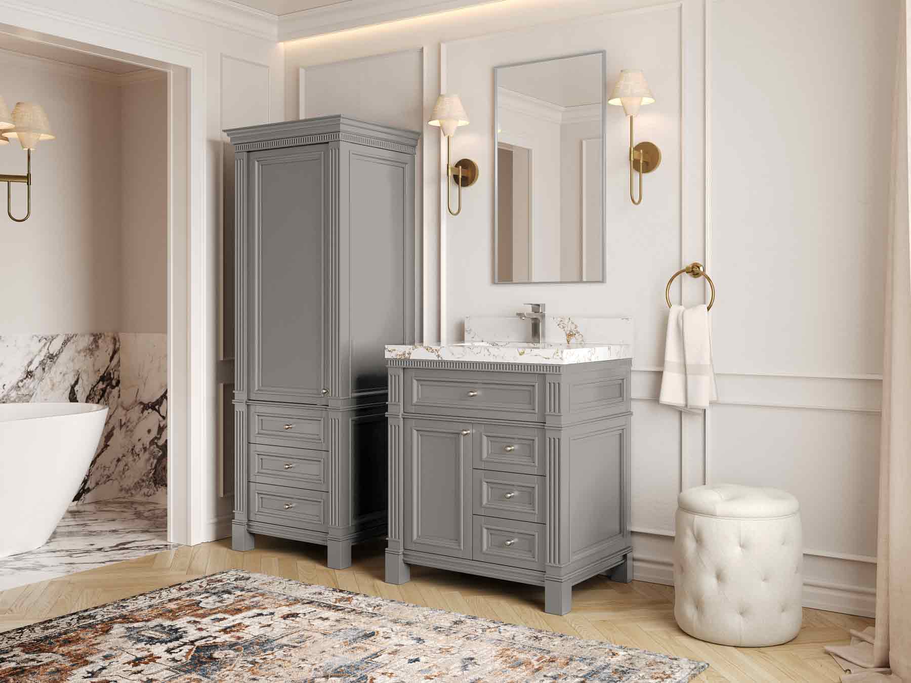 The Paris Cabinet Collection exudes elegance and sophistication, offering a refined touch to any bathroom space. Crafted with meticulous attention to detail, these cabinets showcase a stunning combination of classic design and modern functionality. The deep, rich finishes are complemented by intricate molding and hardware, bringing a sense of timeless beauty to your home. Each piece is designed not just for aesthetics, but for practicality, ensuring ample storage and easy organization for all your bathroom essentials. Whether you're looking to elevate a master suite or add a touch of luxury to a guest bathroom, the Paris Cabinet Collection stands as the epitome of style and craftsmanship.