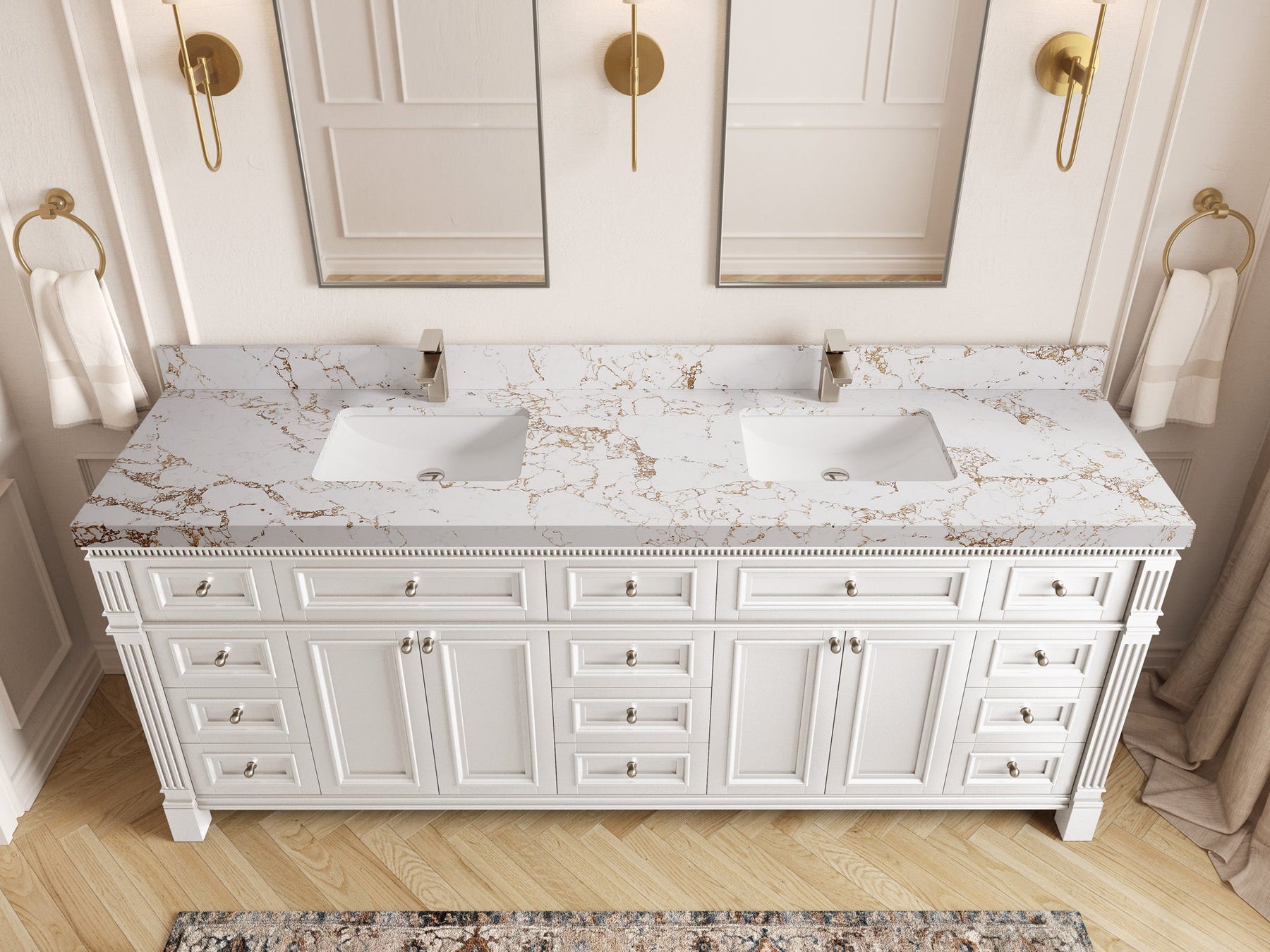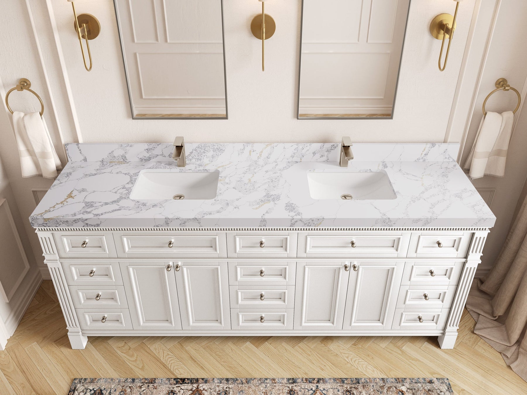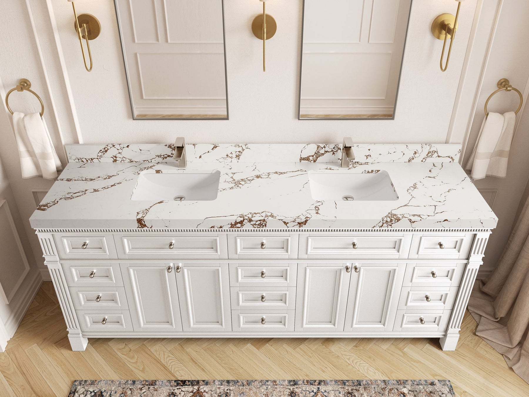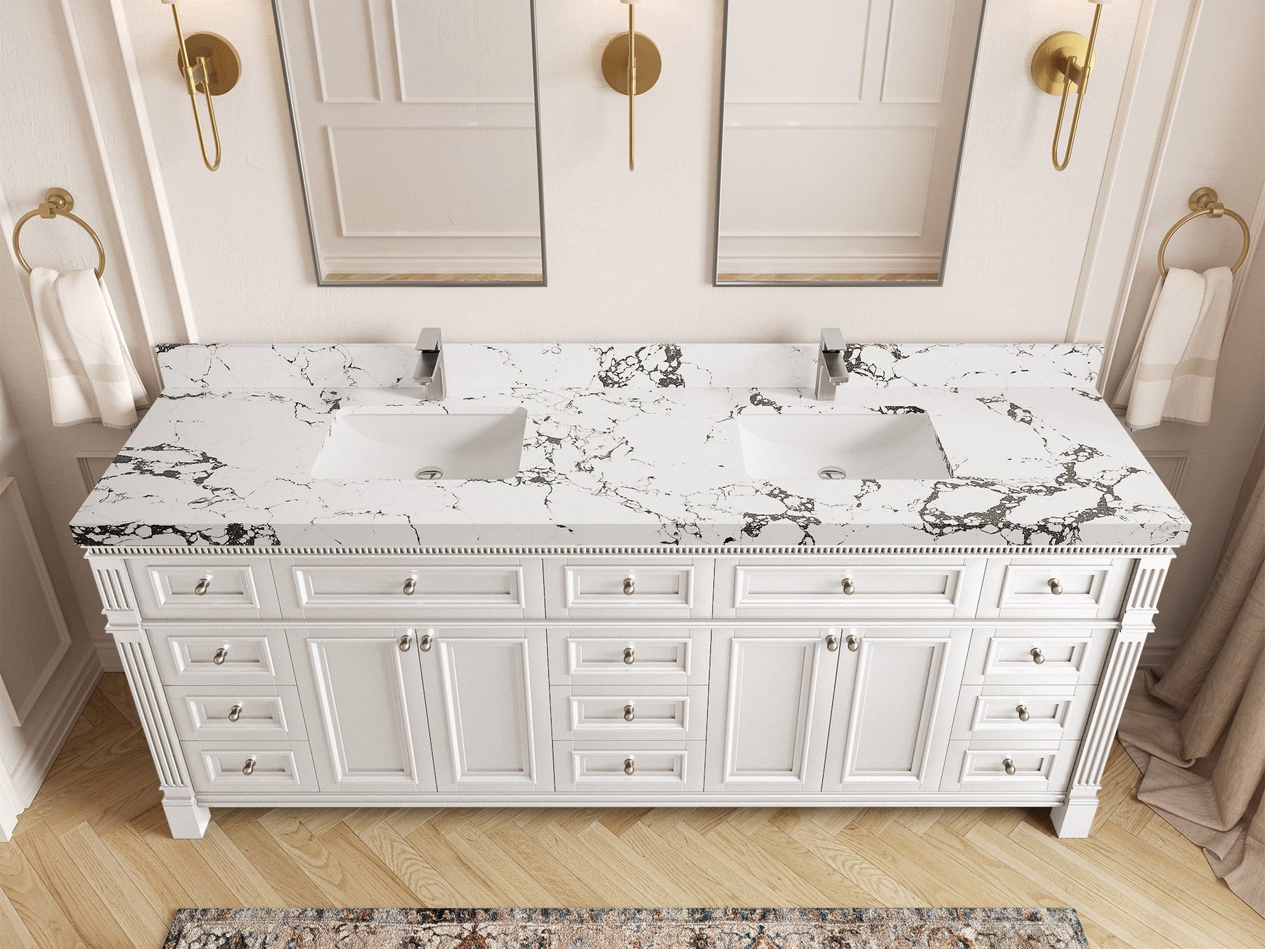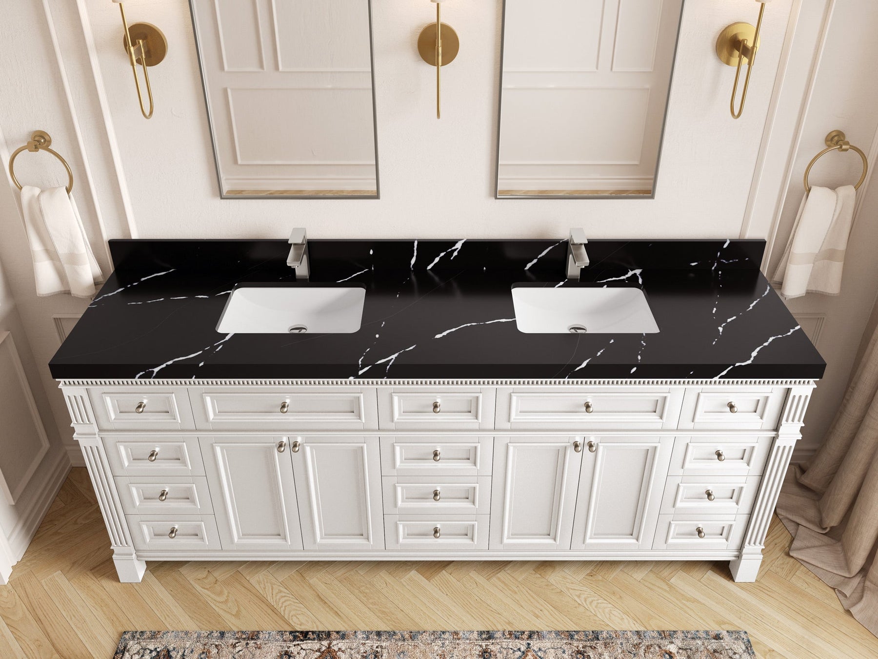 Vanity Countertops options: For Calacatta Laza Quartz, Empira White Quartz, Pure White Quartz we have 2 options Straight-Mitered Edge and Double Cove Edge; For Calacatta Nuvo Quartz, Carrara Marble, Carrara Quartz, Piatra Gray Quartz, Calacatta Black, Calacatta Gold, Venatino Quartz, Pearl Light Gray, Viola Brown, Viola Gold, Viola Night, Viola Biagio, Calacatta Sienna, Calacatta Poanazzo we only have Straight - Mitered Edge option.