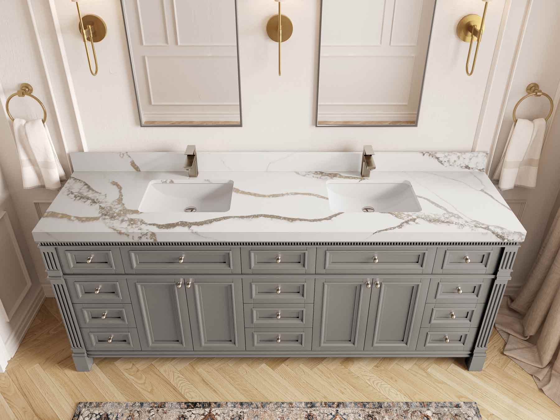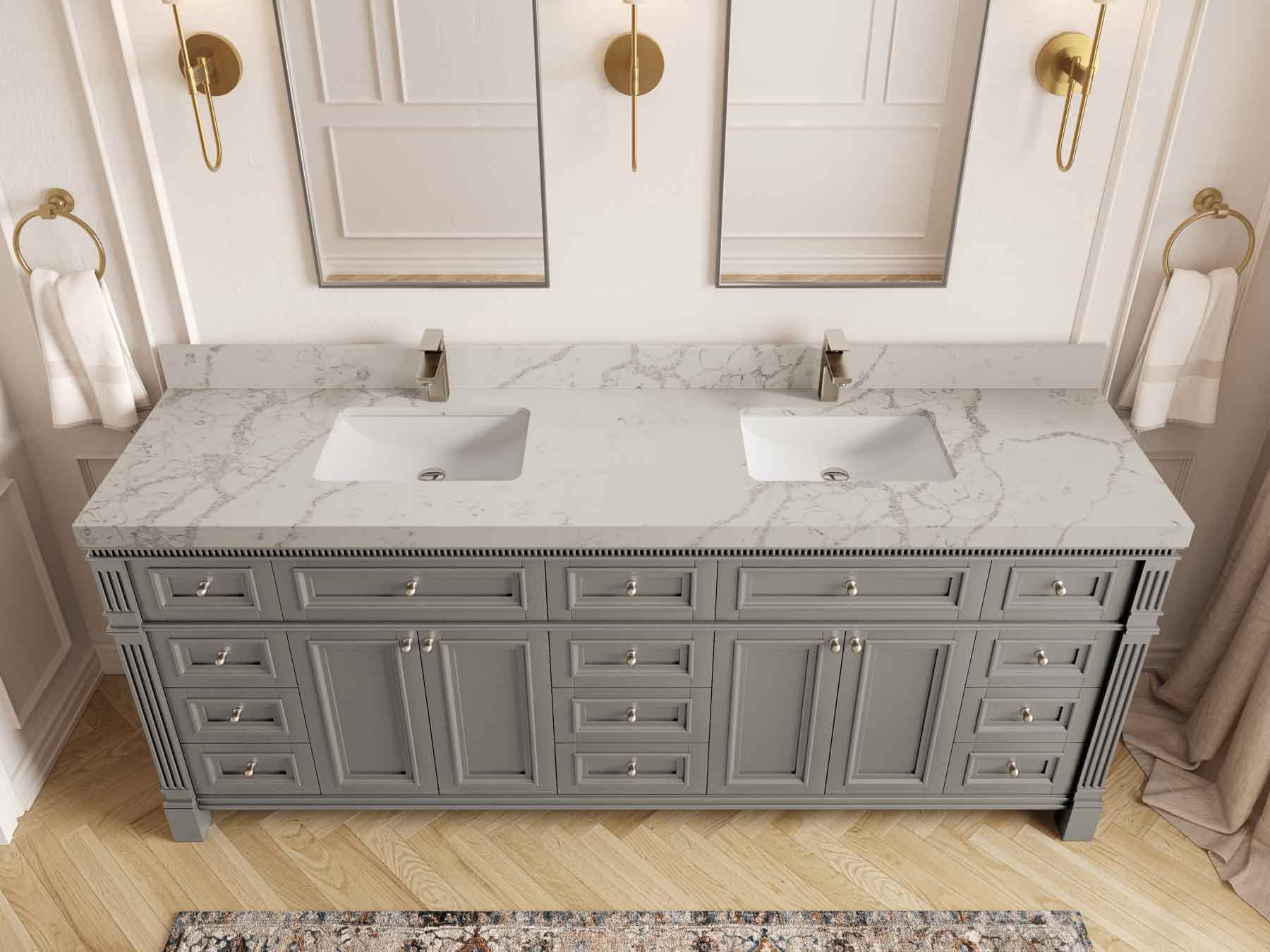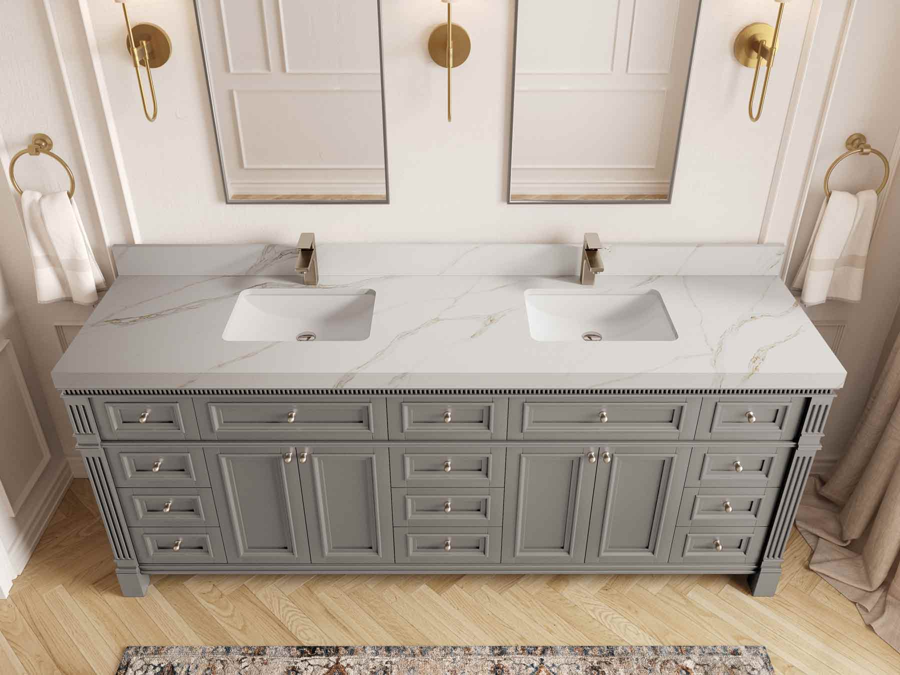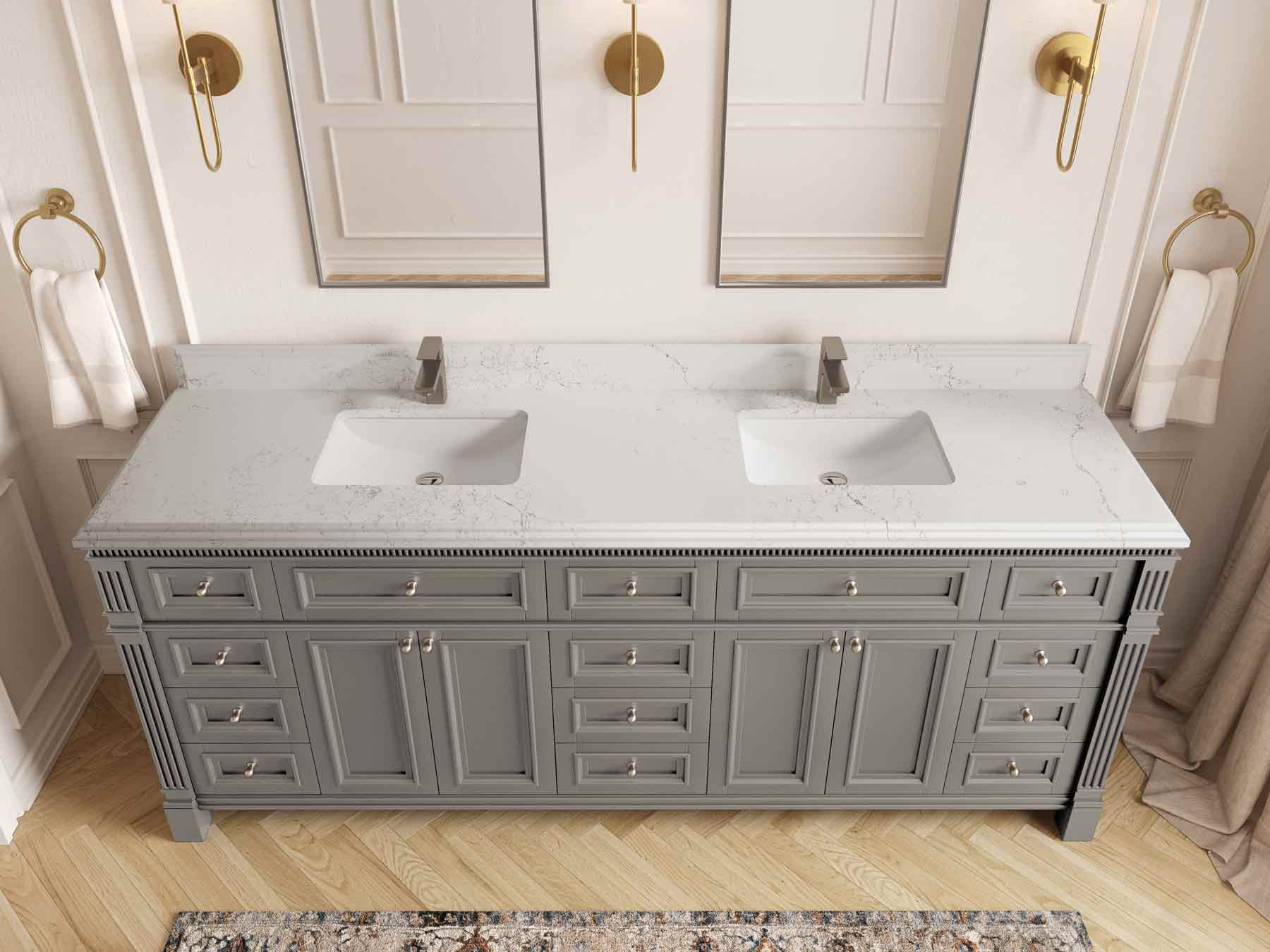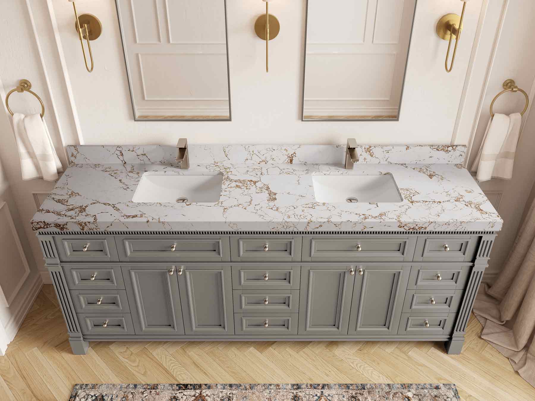 Vanity Countertops options: For Calacatta Laza Quartz, Empira White Quartz, Pure White Quartz we have 2 options Straight-Mitered Edge and Double Cove Edge; For Calacatta Nuvo Quartz, Carrara Marble, Carrara Quartz, Piatra Gray Quartz, Calacatta Black, Calacatta Gold, Venatino Quartz, Pearl Light Gray, Viola Brown, Viola Gold, Viola Night, Viola Biagio, Calacatta Sienna, Calacatta Poanazzo we only have Straight - Mitered Edge option.