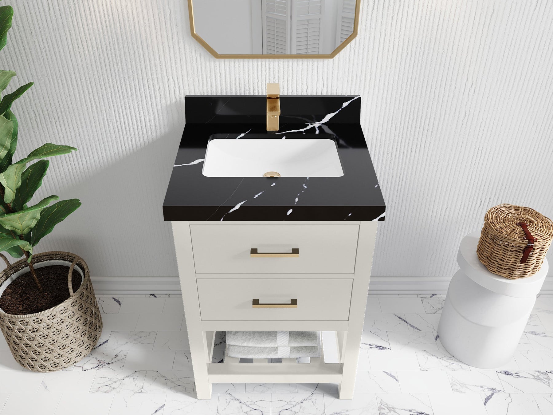 1. Traditional style with a modern twist - made from birch tree and plywood, this bathroom vanity features a clean, contemporary design with soft-close hardware and gold and nickel brushed hardware.