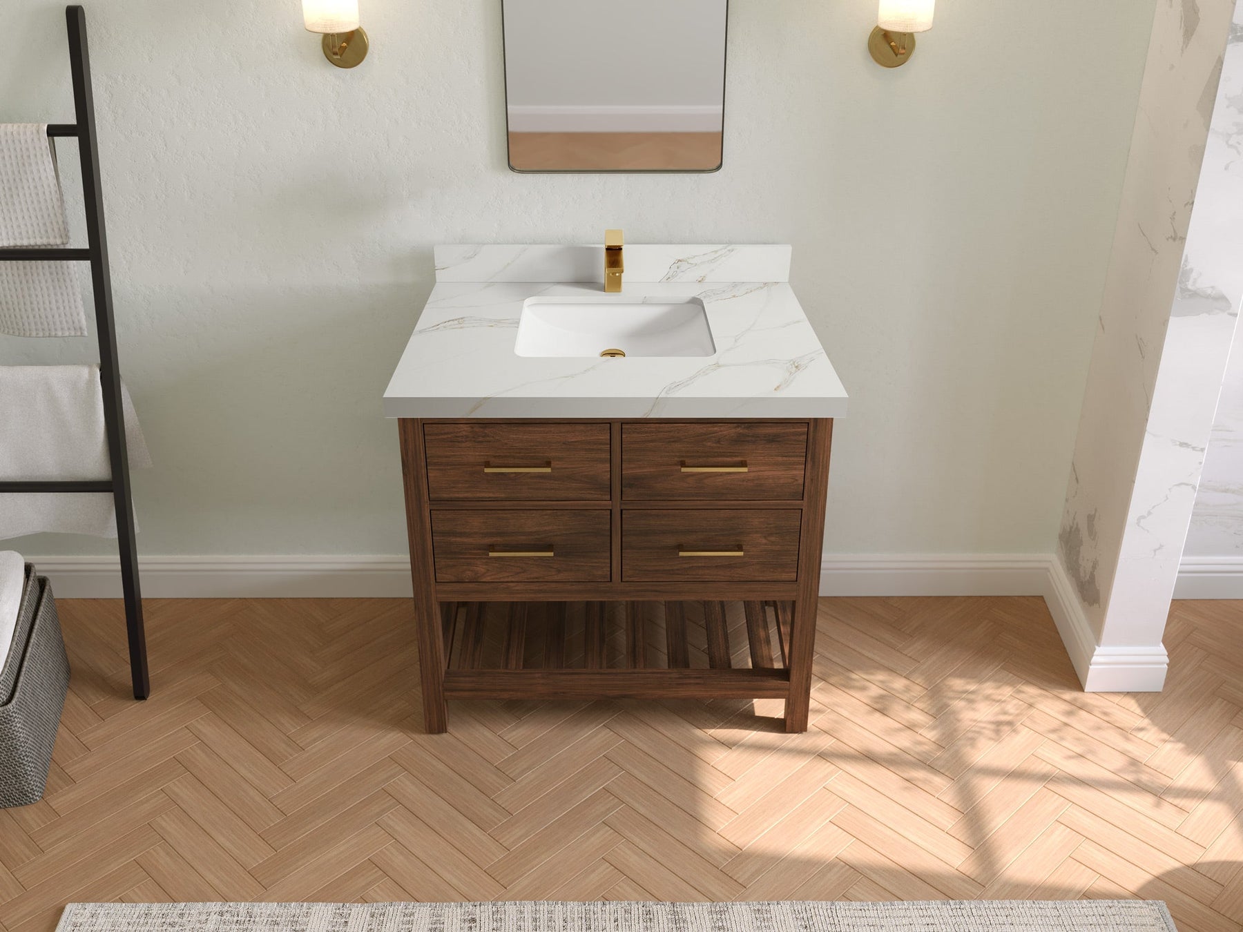 1. Traditional style with a modern twist - made from teak wood, this bathroom vanity features a clean, contemporary design with soft-close hardware and antique brass hardware.