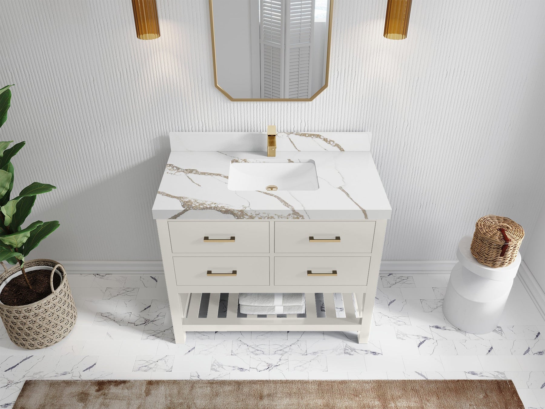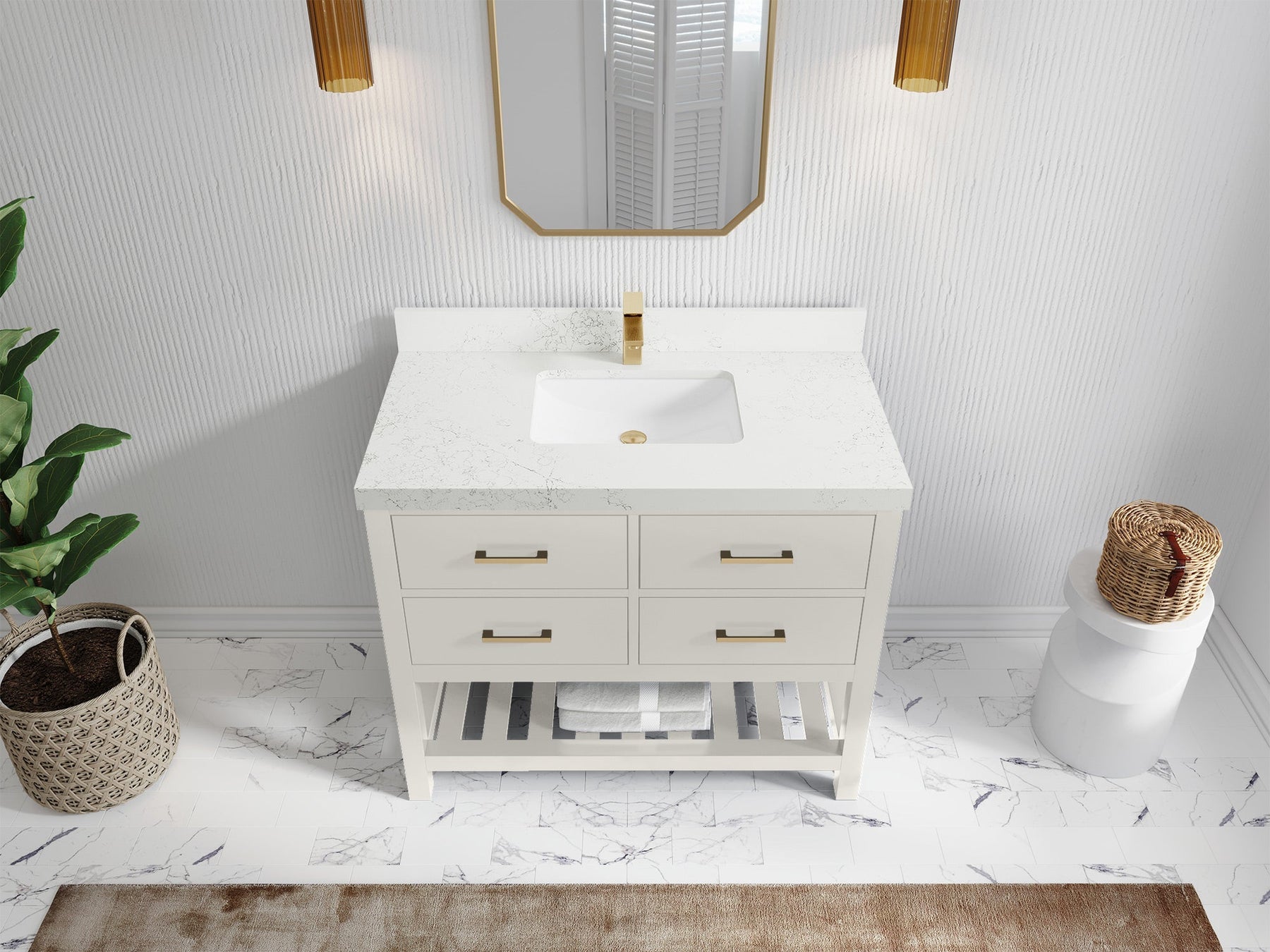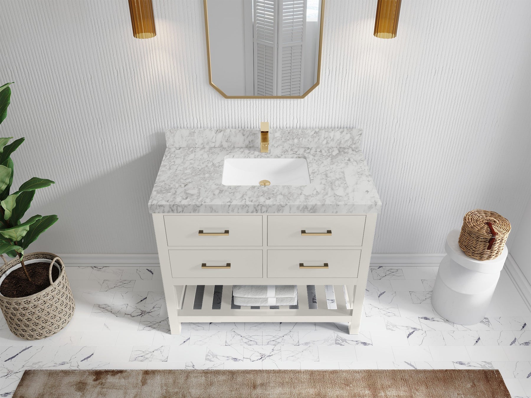 1. Traditional style with a modern twist - made from birch tree and plywood, this bathroom vanity features a clean, contemporary design with soft-close hardware and gold and nickel brushed hardware.