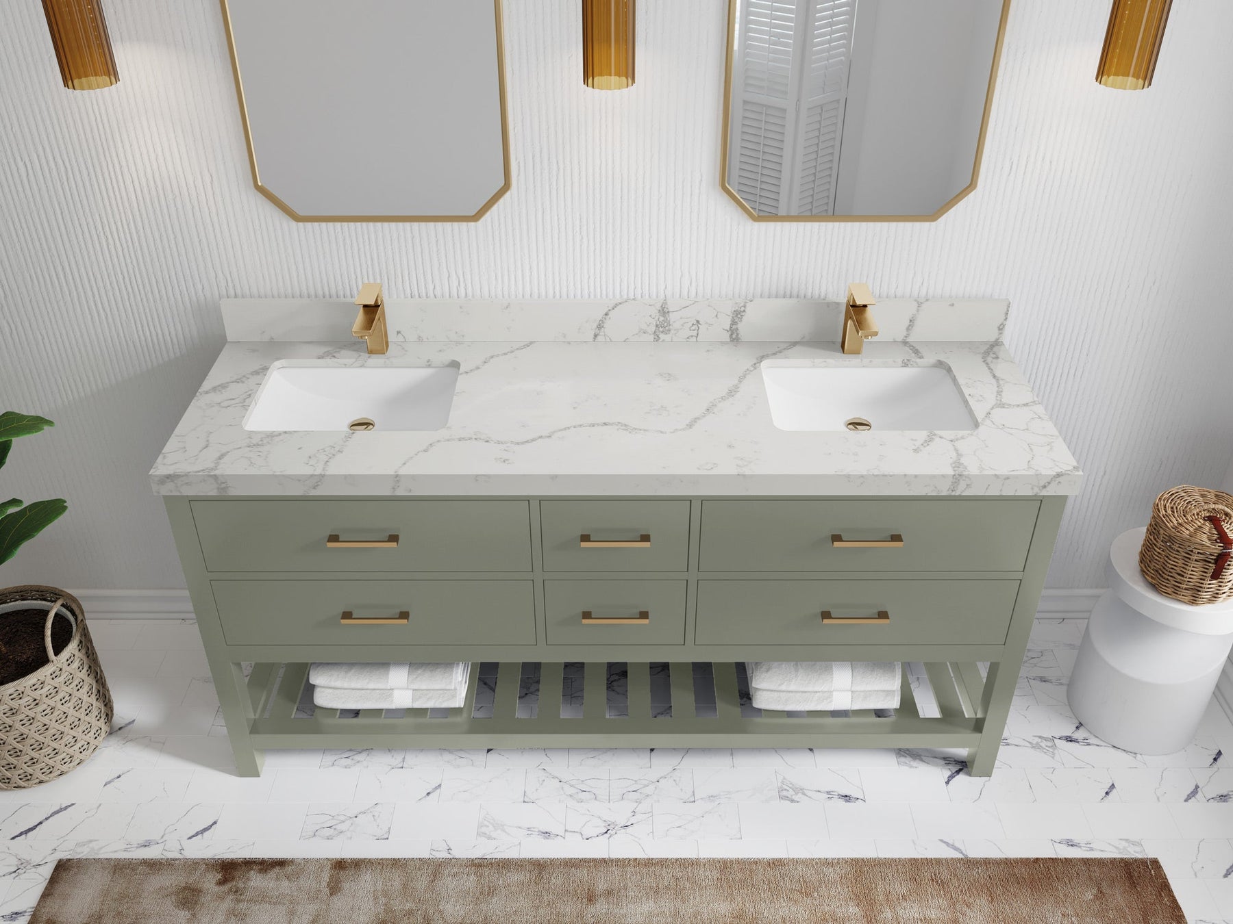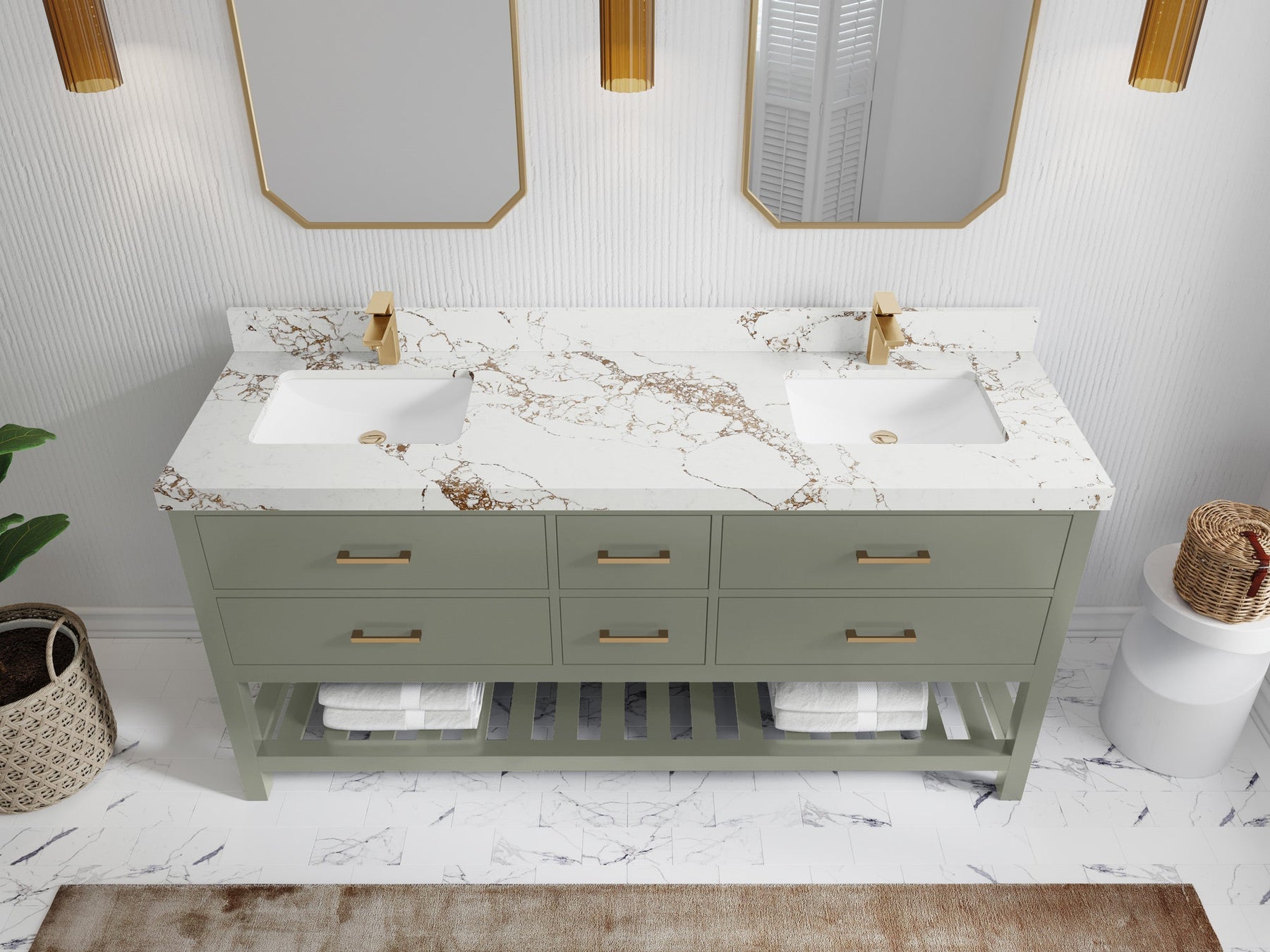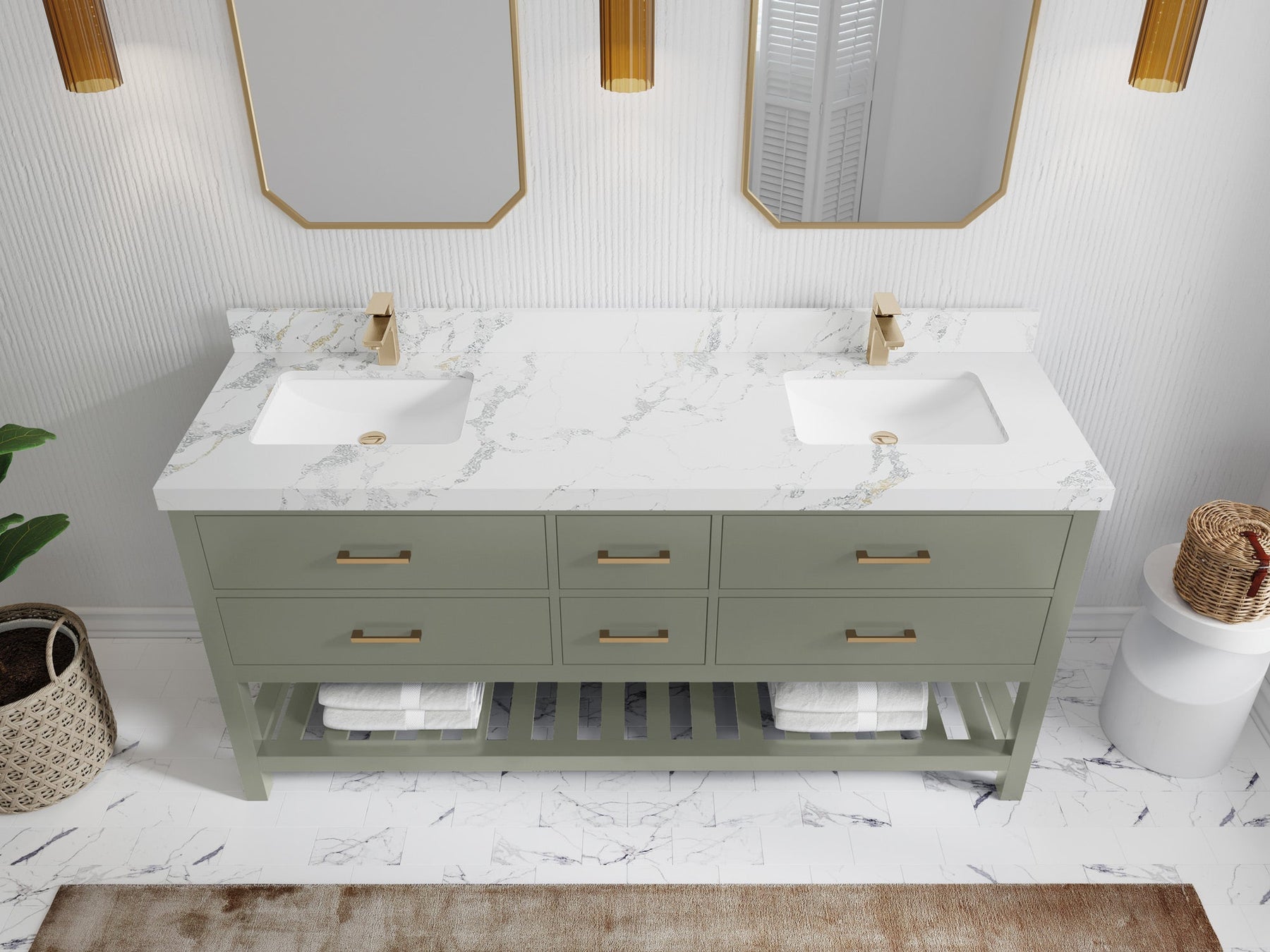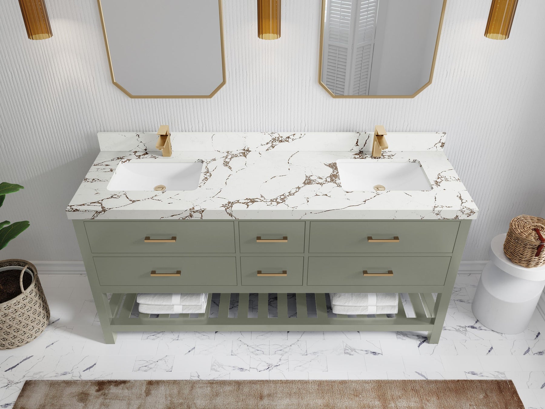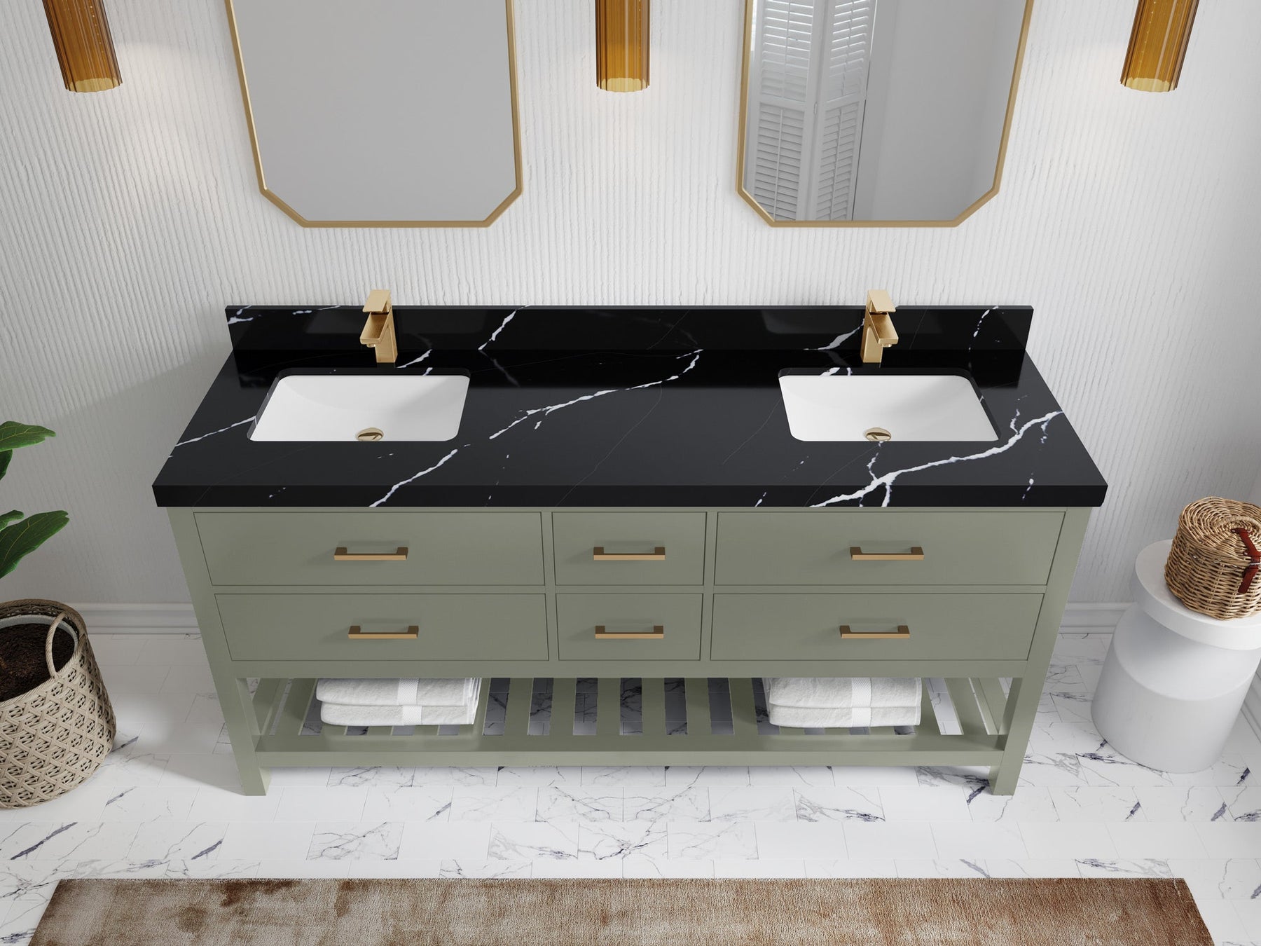 1. Traditional style with a modern twist - made from birch tree and plywood, this bathroom vanity features a clean, contemporary design with soft-close hardware and gold and nickel brushed hardware.