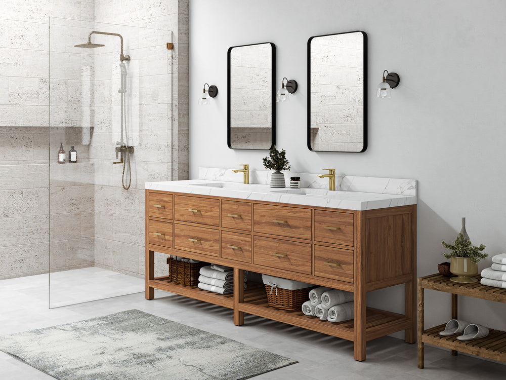 Parker Teak 84 in. W x 22 in. D double Sink Bathroom Vanity in Golden with 2 in Carrara Quartz Countertop