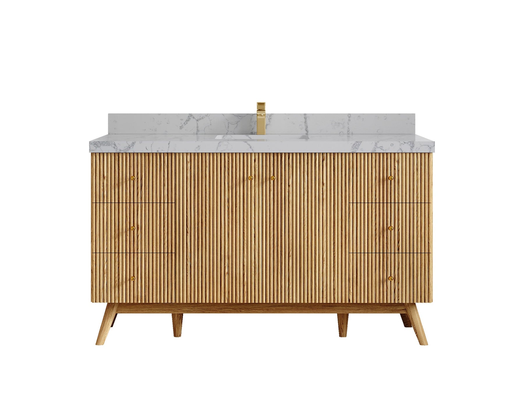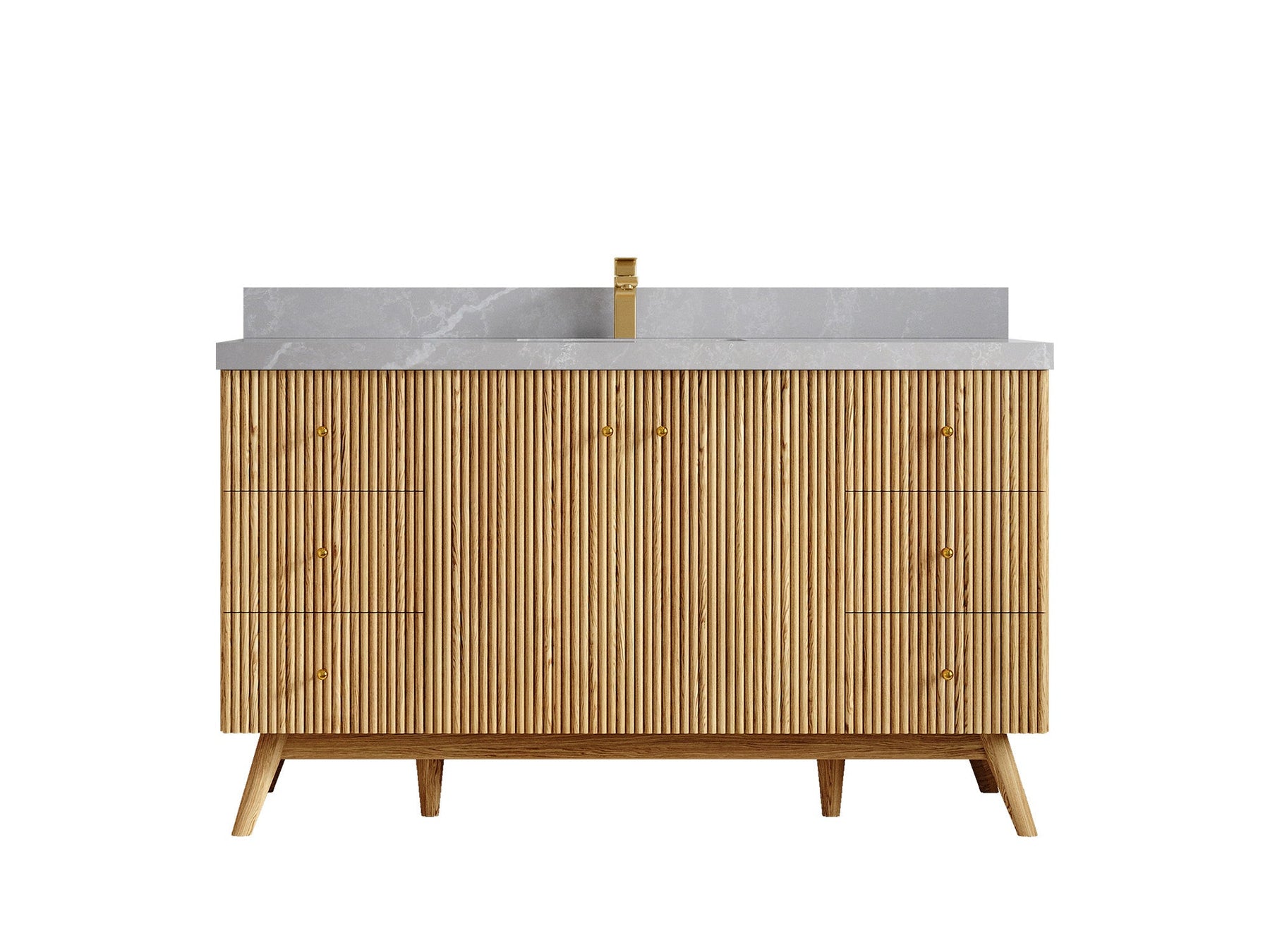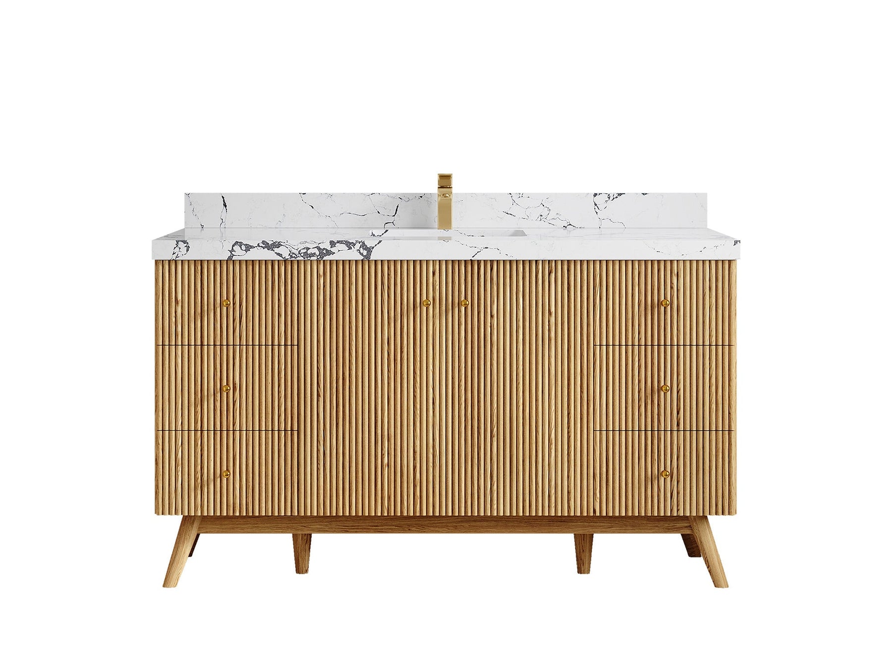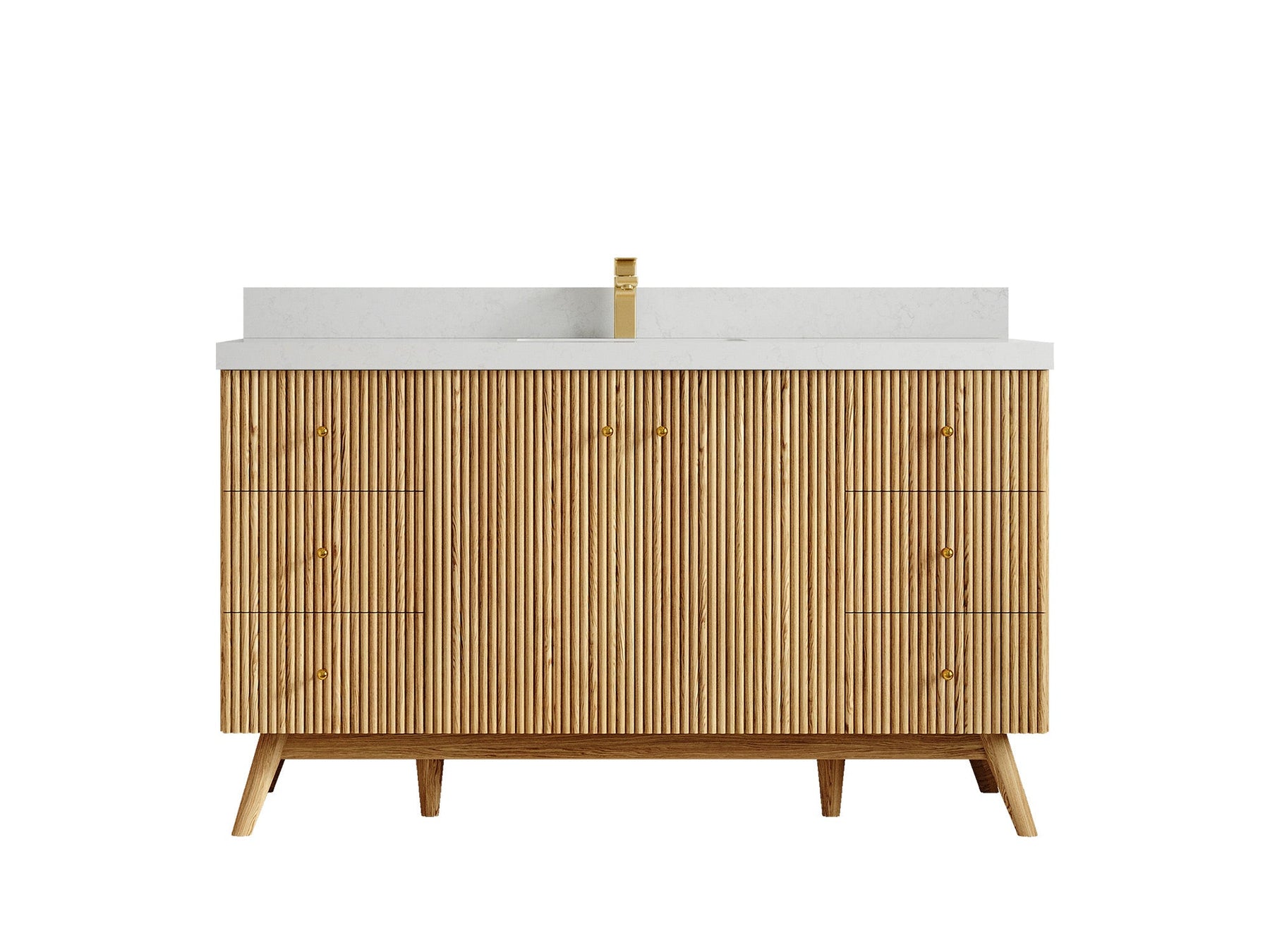 The Pasadena Oak Cabinet Collection offers a beautiful fusion of modern design and natural textures, perfect for bringing warmth and elegance to any bathroom. With its distinct ribbed oak finish, this vanity embodies both sophistication and functionality. Its spacious design is complemented by ample storage solutions, making it a stylish and practical addition to contemporary bathrooms.