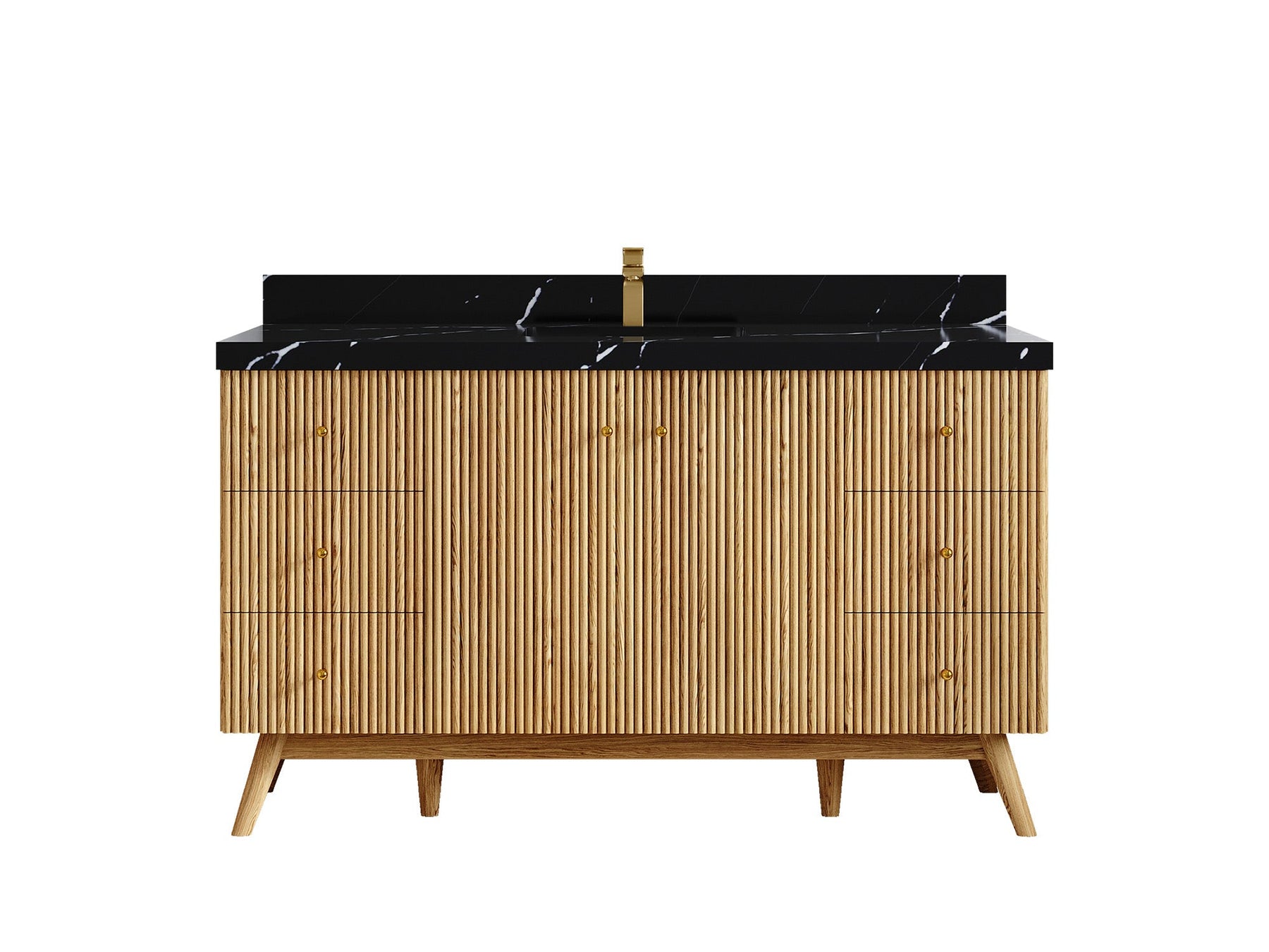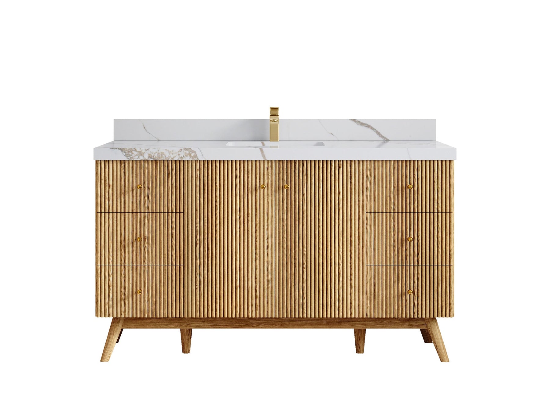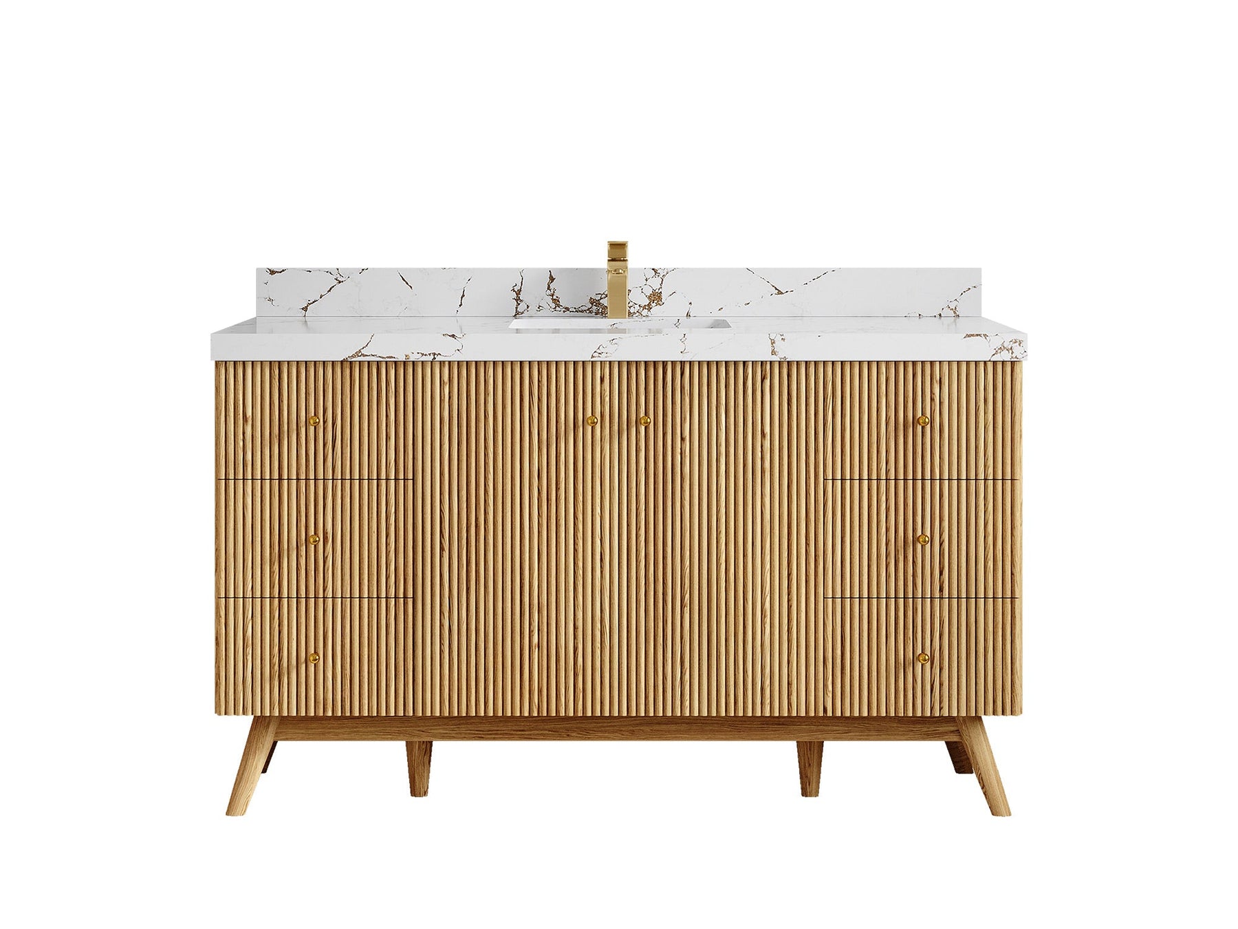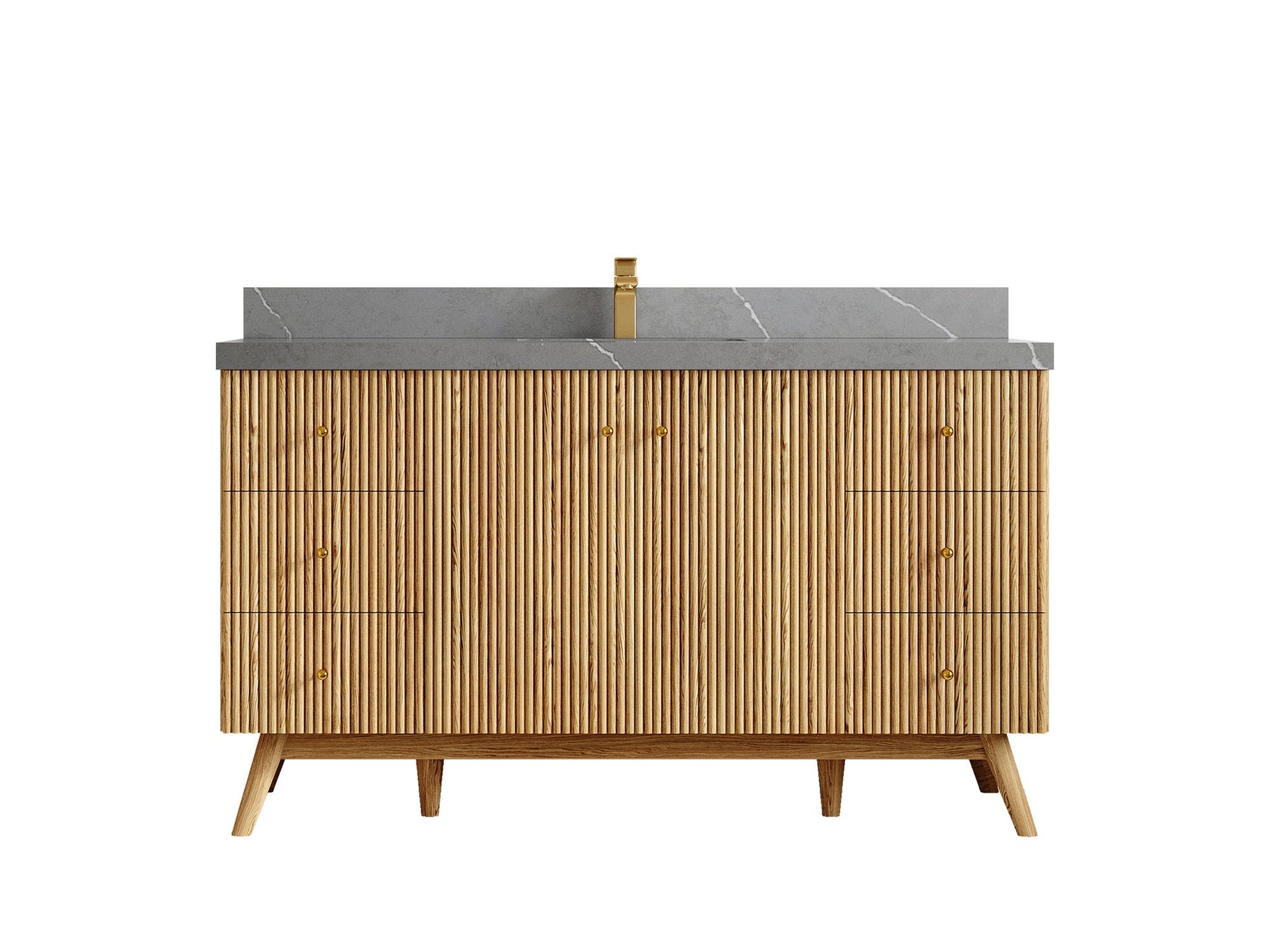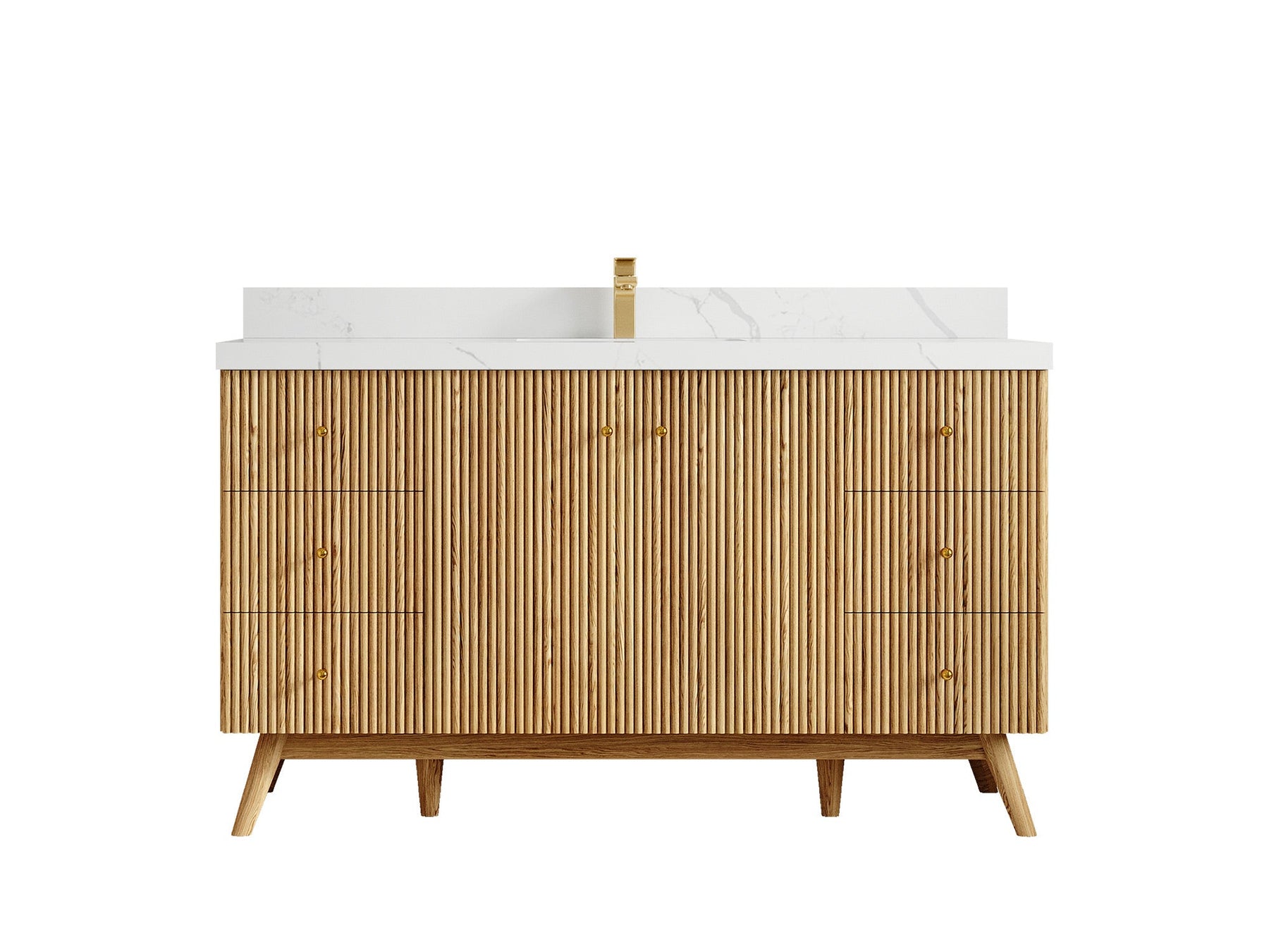 The Pasadena Oak Cabinet Collection offers a beautiful fusion of modern design and natural textures, perfect for bringing warmth and elegance to any bathroom. With its distinct ribbed oak finish, this vanity embodies both sophistication and functionality. Its spacious design is complemented by ample storage solutions, making it a stylish and practical addition to contemporary bathrooms.