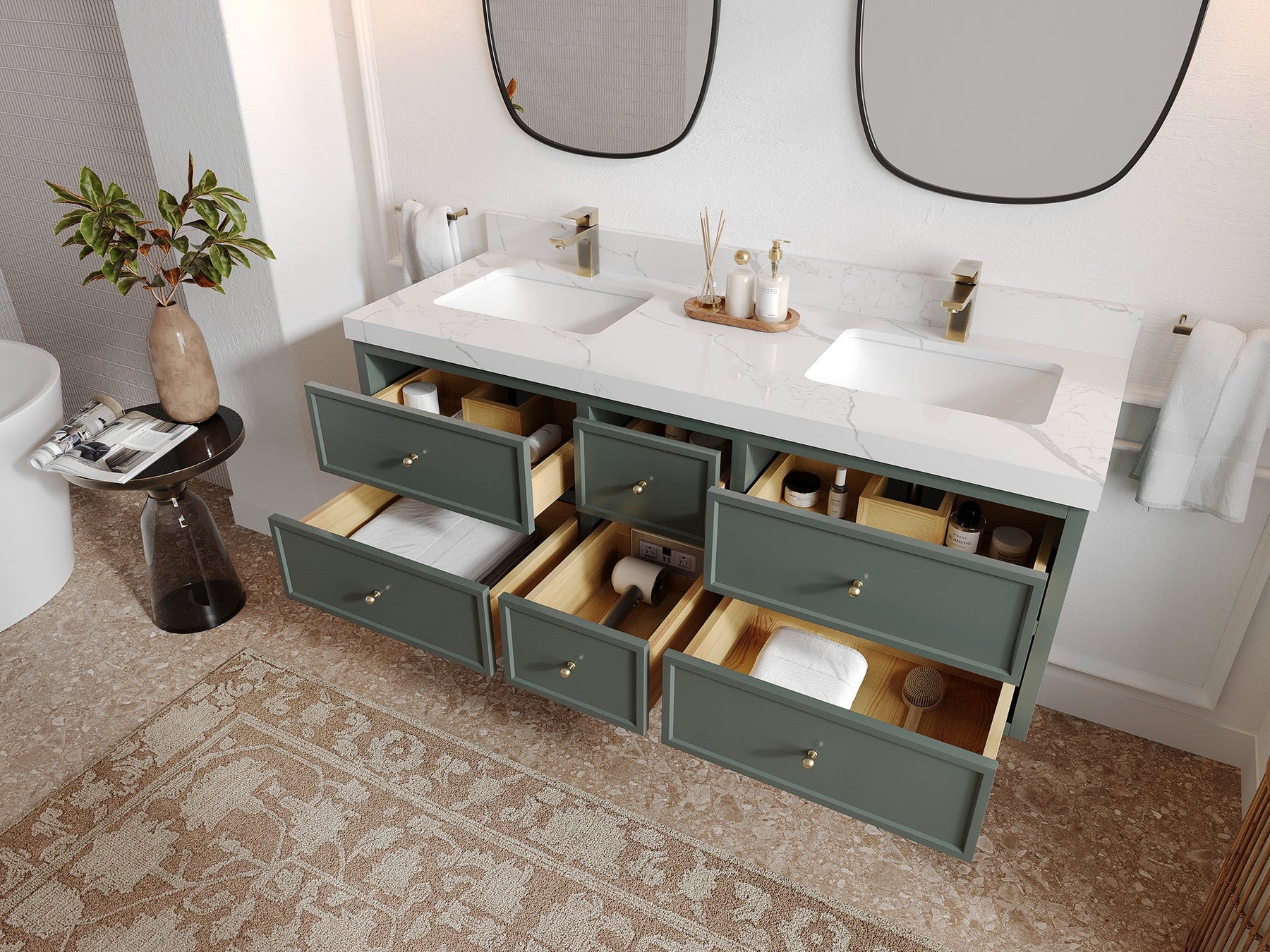 3. Soft-Close Drawers - Equipped with two spacious drawers, this vanity provides ample storage for all your bathroom essentials. The soft-close mechanism ensures a quiet and smooth operation, adding to the vanity’s premium feel.