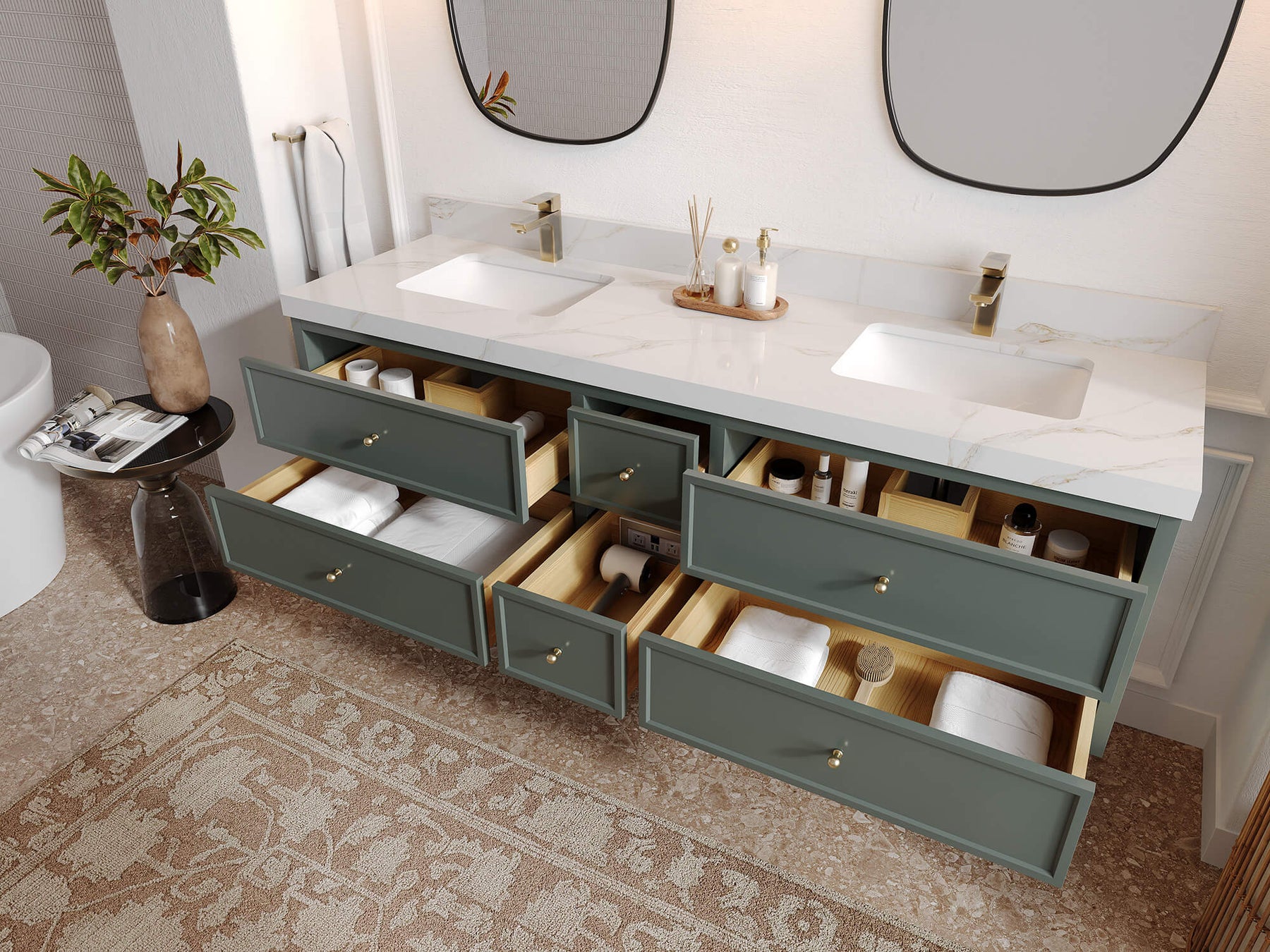 3. Soft-Close Drawers - Equipped with two spacious drawers, this vanity provides ample storage for all your bathroom essentials. The soft-close mechanism ensures a quiet and smooth operation, adding to the vanity’s premium feel.
