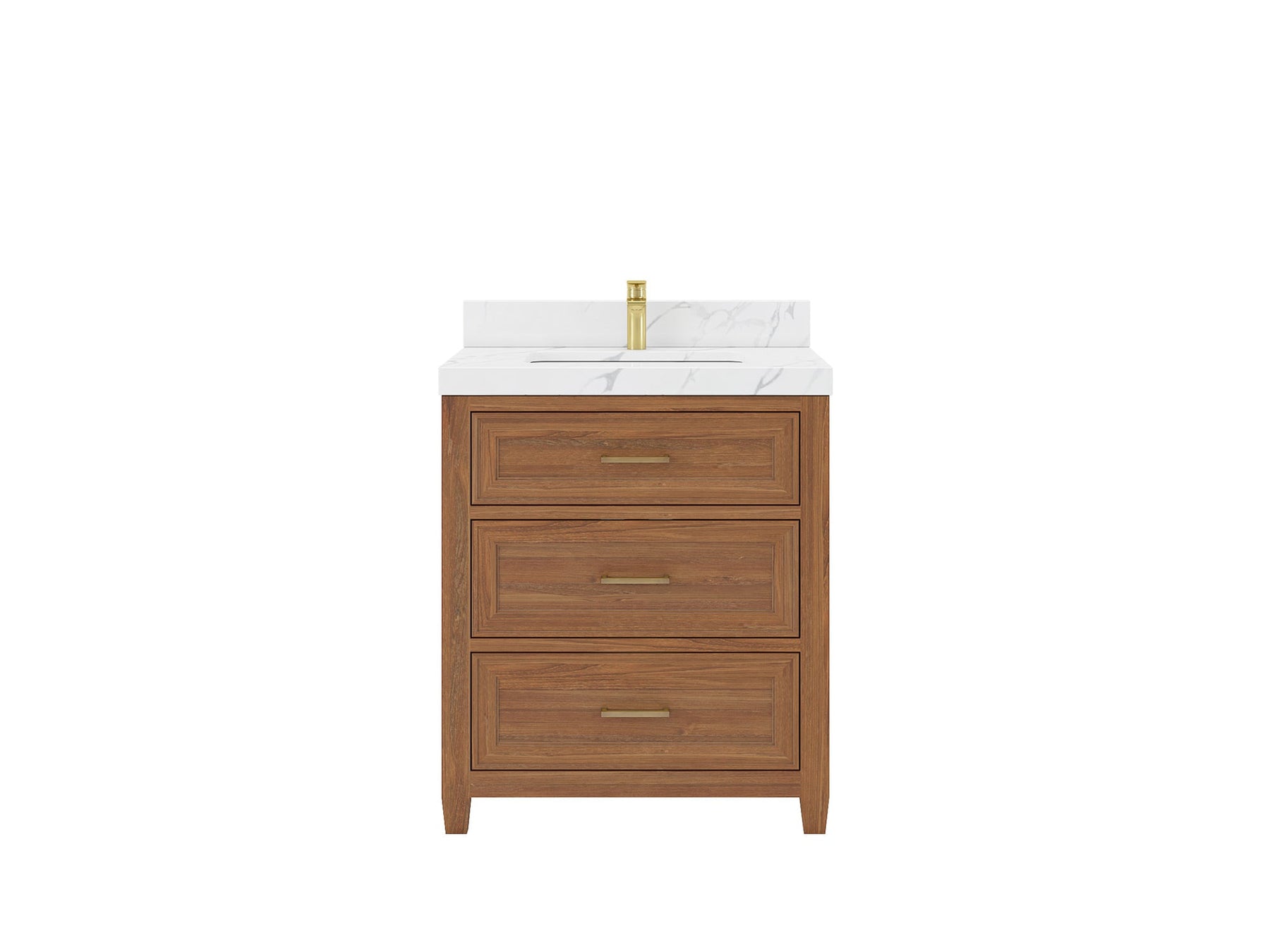 Santa Monica Teak 30 in. W x 22 in. D Single Sink Bathroom Vanity in Dark Natural with 2 in Calacatta Poanazzo Quartz Countertop