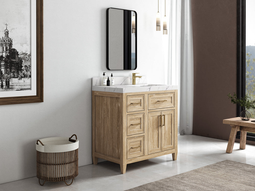 1. Traditional style with a modern twist - made from teak wood, this bathroom vanity features a clean, contemporary design with soft-close hardware and antique brass hardware.