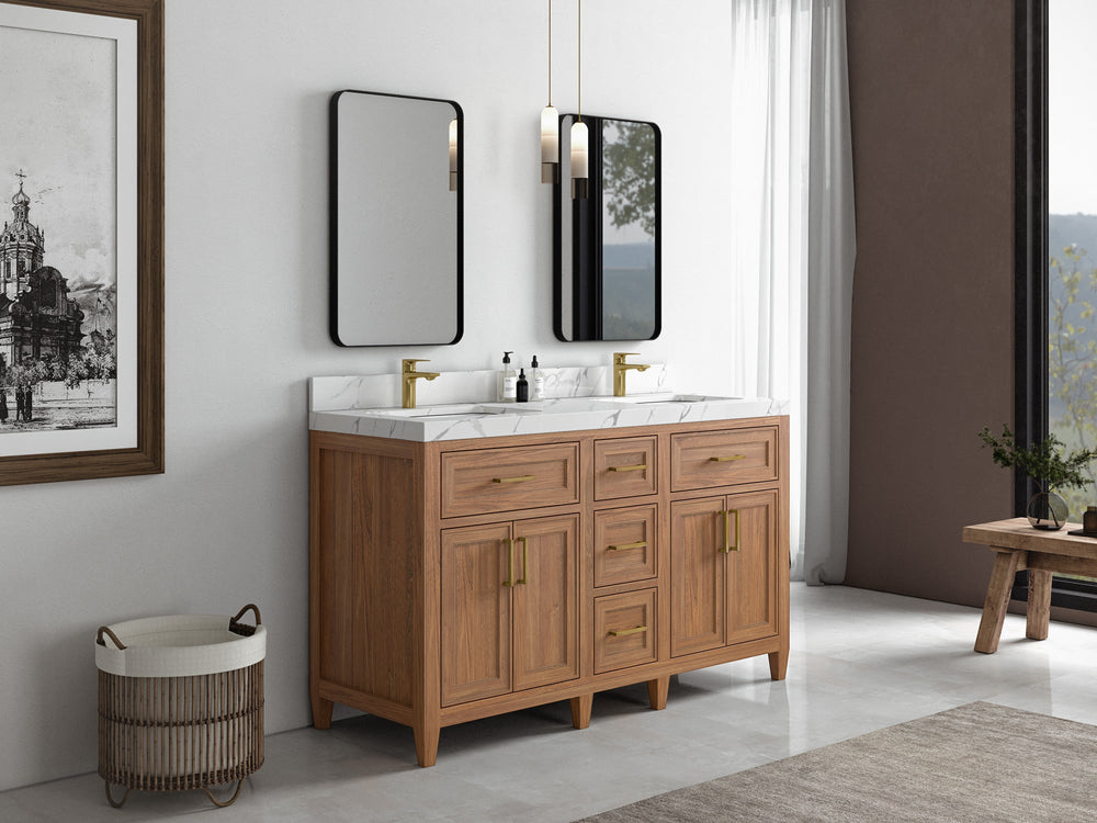 1. Traditional style with a modern twist - made from teak wood, this bathroom vanity features a clean, contemporary design with soft-close hardware and antique brass hardware.