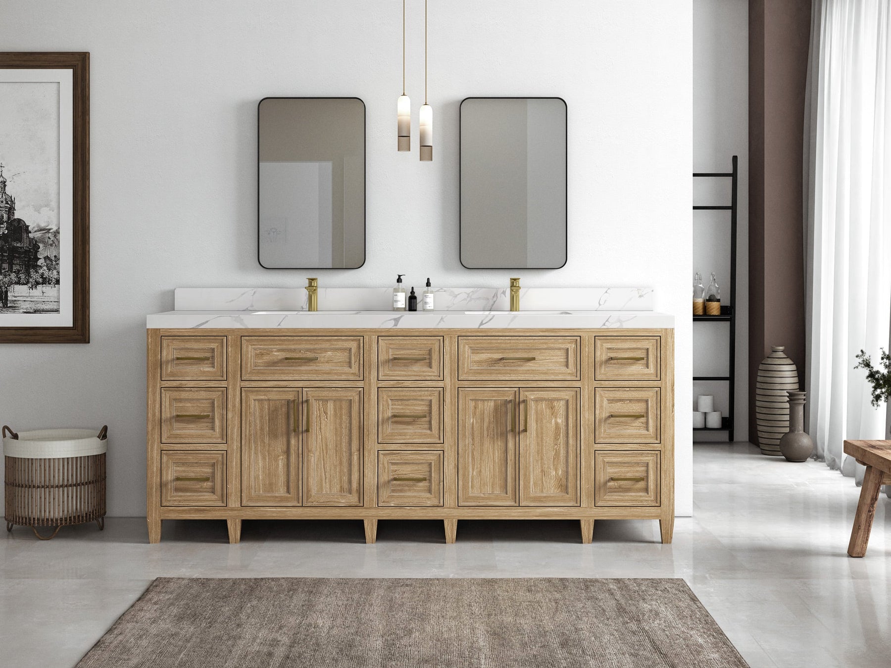 Santa Monica Teak Wood 84 in. W x 22 in. D Double Sink Bathroom Vanity | Whitewashed Teak