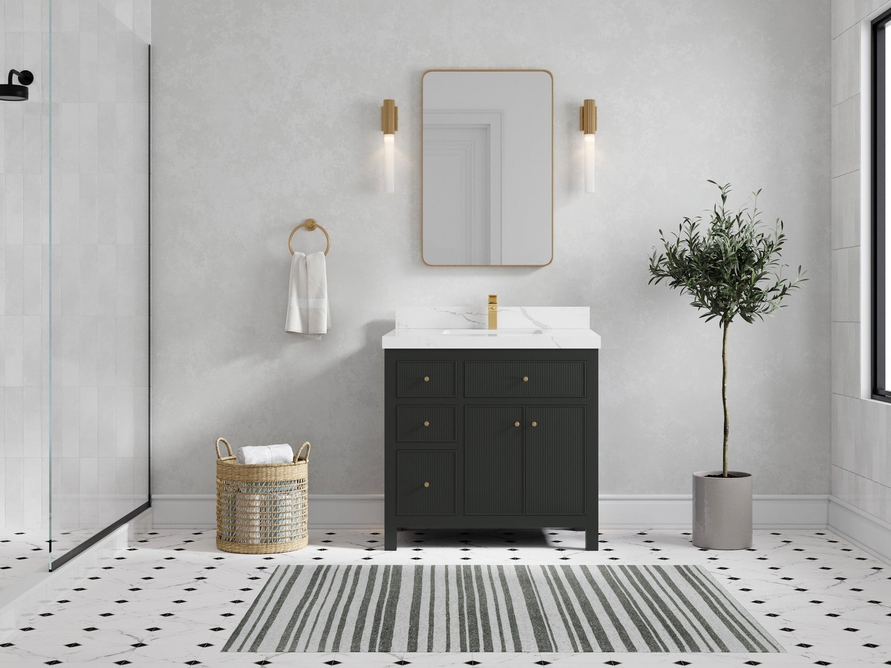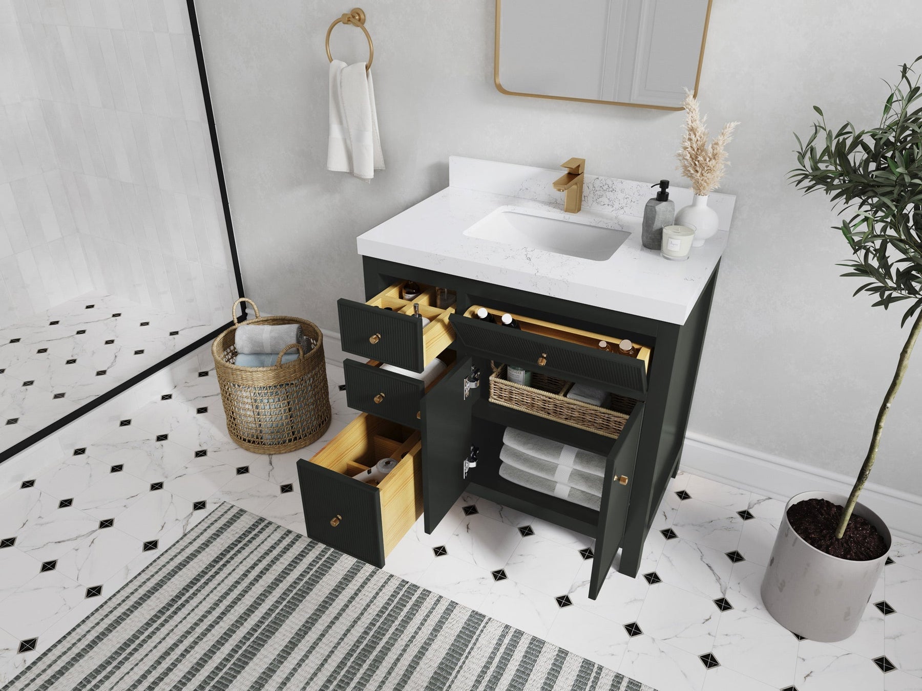 In addition to the Sonoma Collection’s vast array of stunning color options, from Navy Blue to Forest Green, this expansive reeded vanity unit features power cord integration and a built-in hairdryer holder to make your bathroom experience as convenient as it is aesthetic.