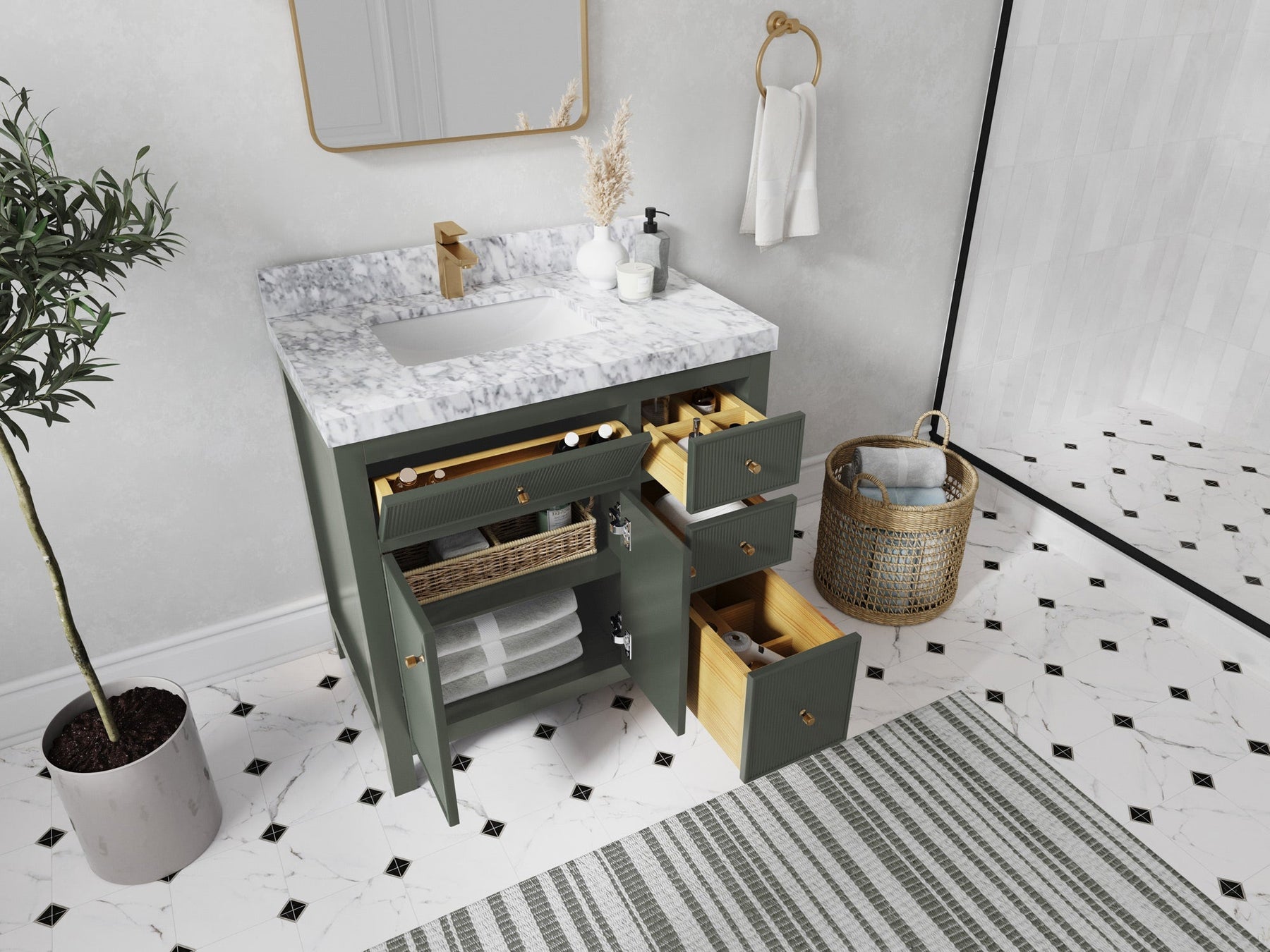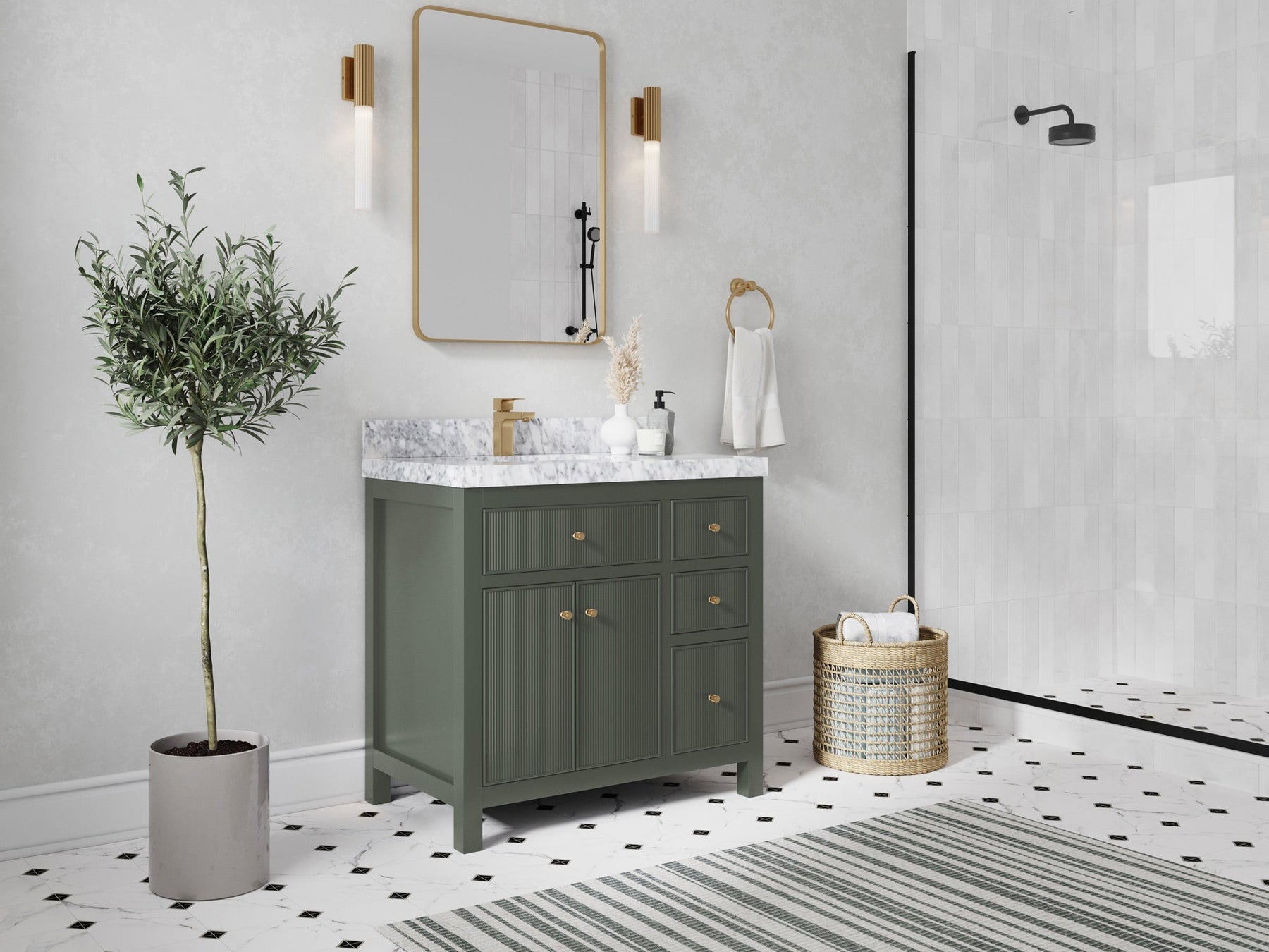In addition to the Sonoma Collection’s vast array of stunning color options, from Navy Blue to Forest Green, this expansive reeded vanity unit features power cord integration and a built-in hairdryer holder to make your bathroom experience as convenient as it is aesthetic.
