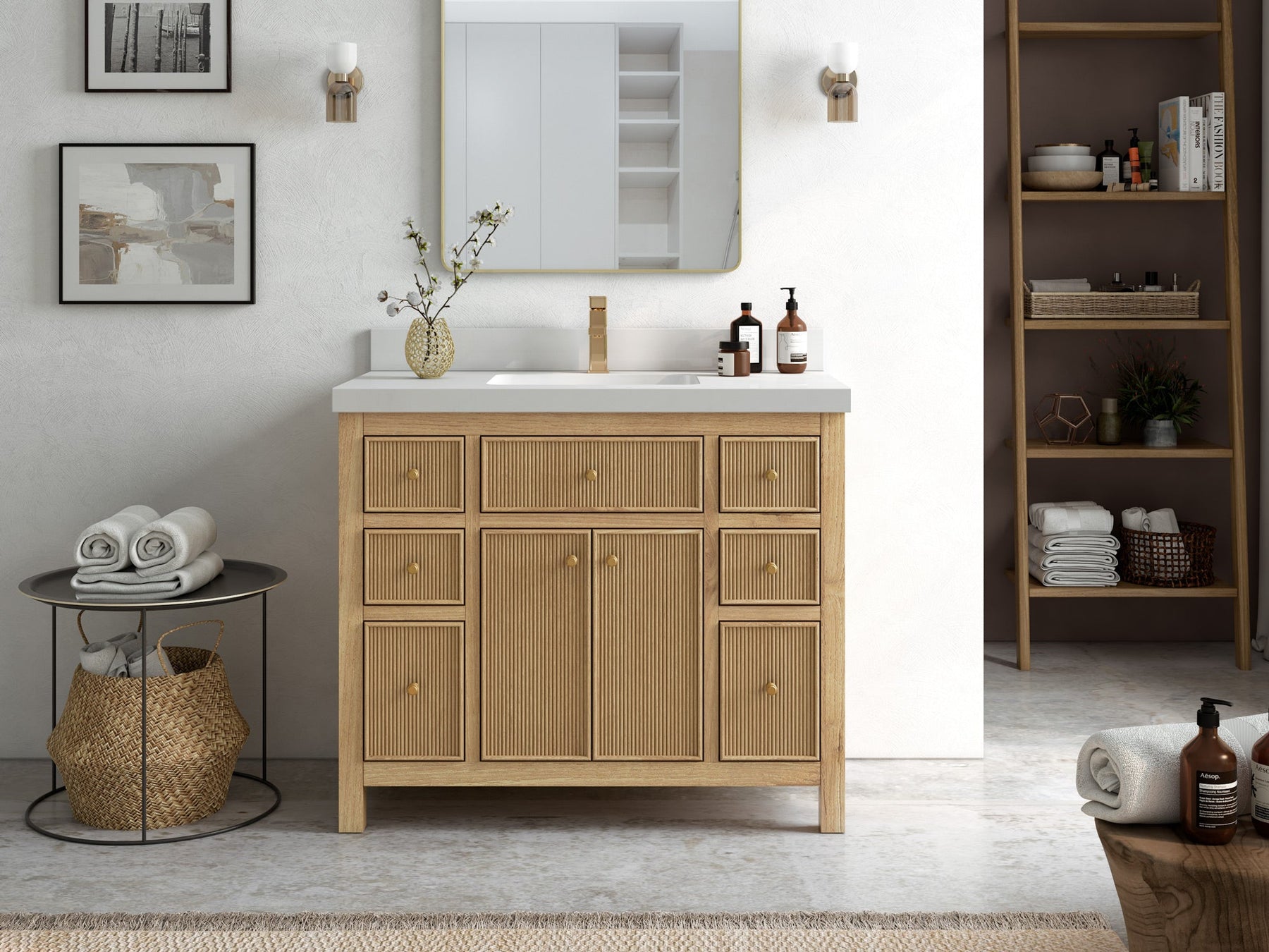 1. Crafted from premium teak wood with reeded design, this vanity showcases a sleek build, complemented by soft-close hardware for quiet and effortless operation. Add antique brass hardware for a touch of vintage charm!