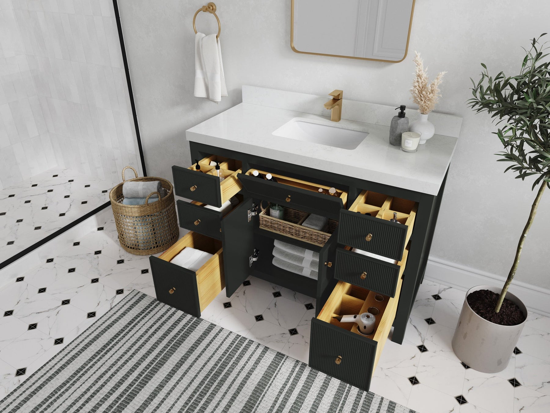4. Function and form – featuring no less than fifteen front-facing doors and drawers in a reeded design, this vanity unit offers extensive storage and convenience for busy households. Never again will you hunt through a jungle of bottles to find what you are looking for.