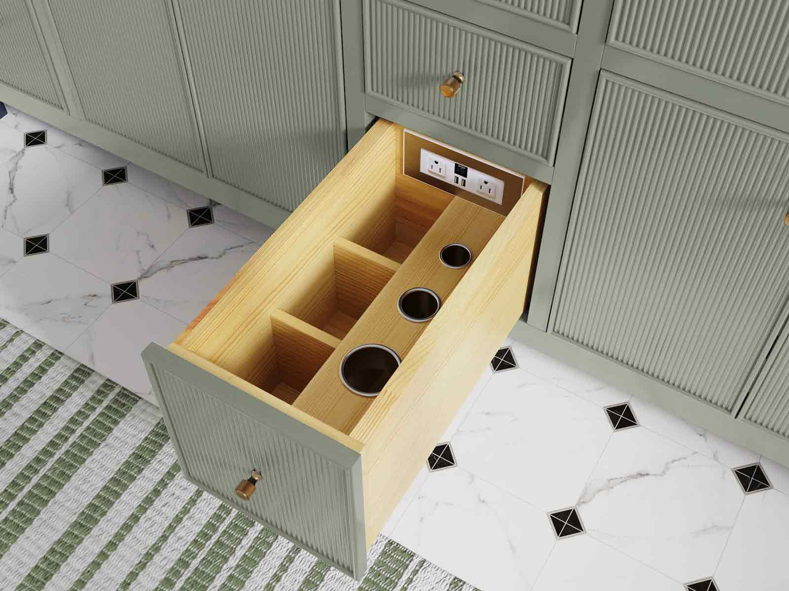In addition to the Sonoma Collection’s vast array of stunning color options, from Navy Blue to Forest Green, this expansive reeded vanity unit features power cord integration and a built-in hairdryer holder to make your bathroom experience as convenient as it is aesthetic.