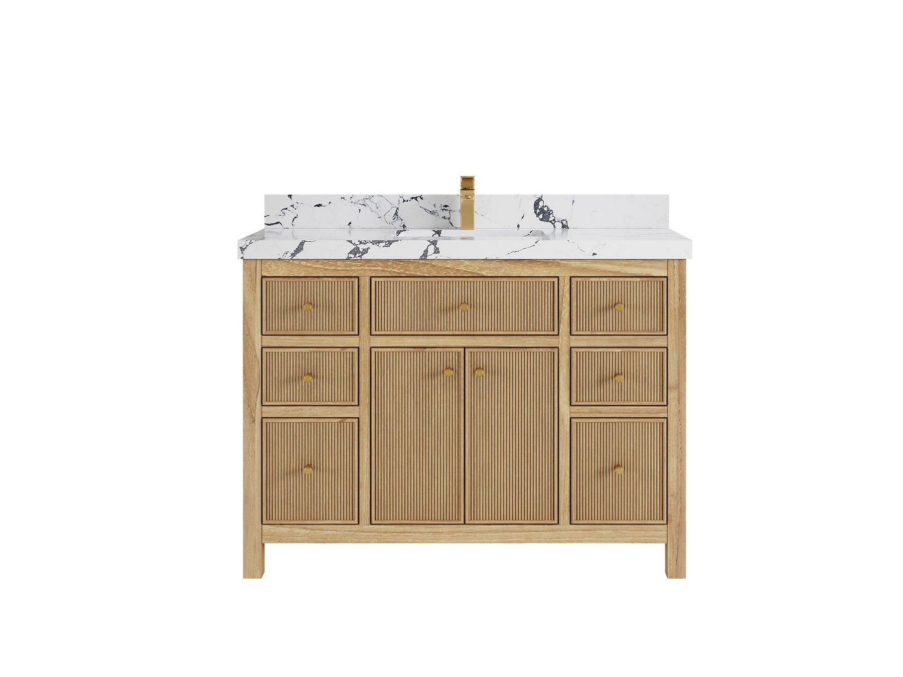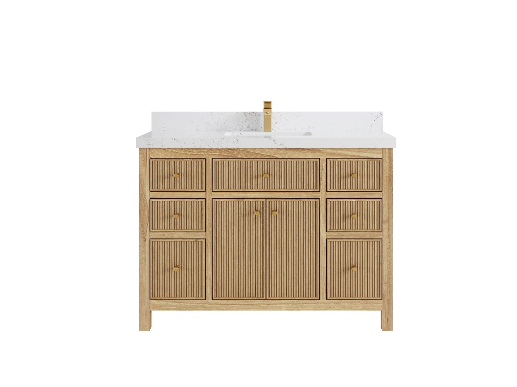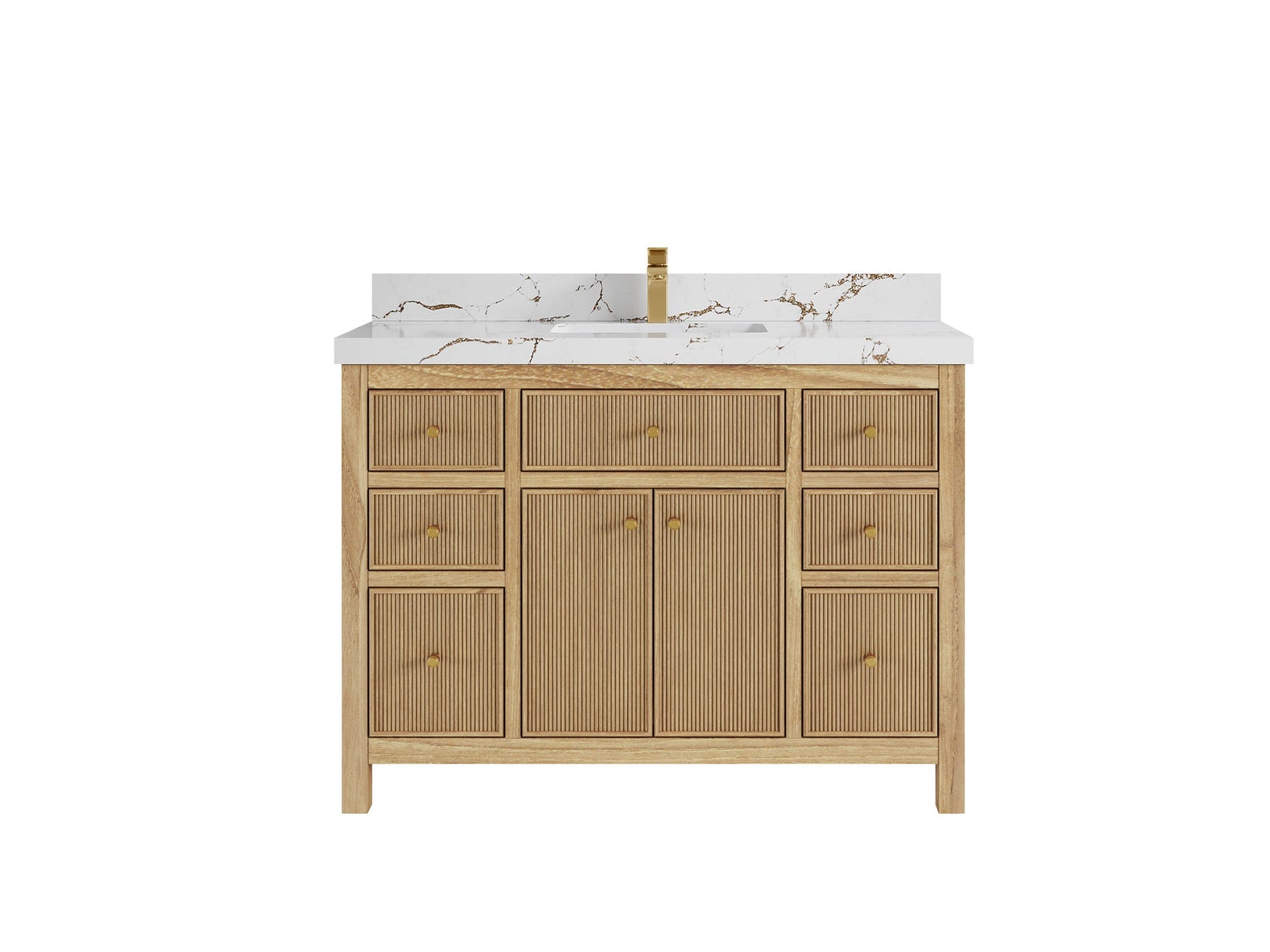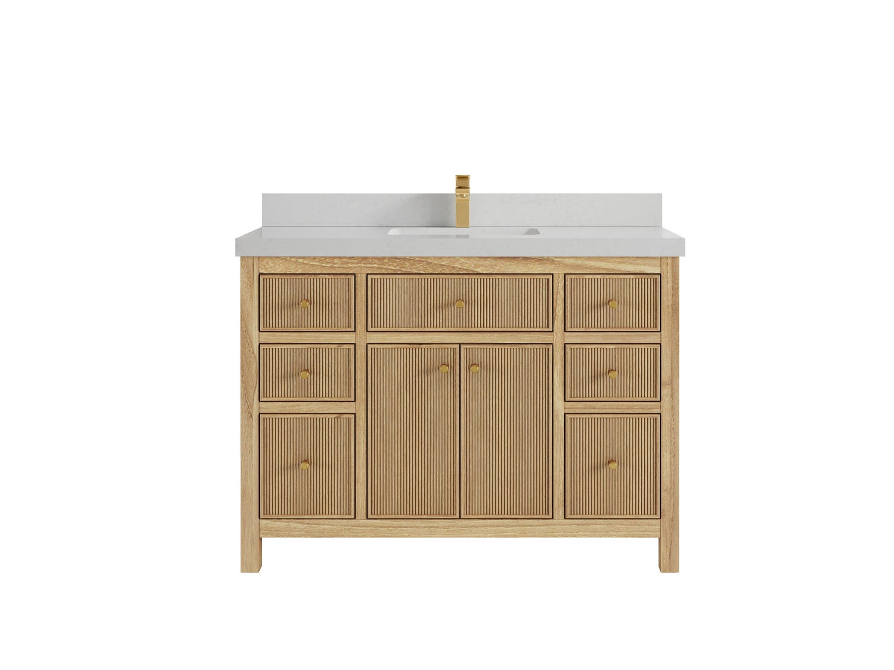 1. Crafted from premium teak wood with reeded design, this vanity showcases a sleek build, complemented by soft-close hardware for quiet and effortless operation. Add antique brass hardware for a touch of vintage charm!