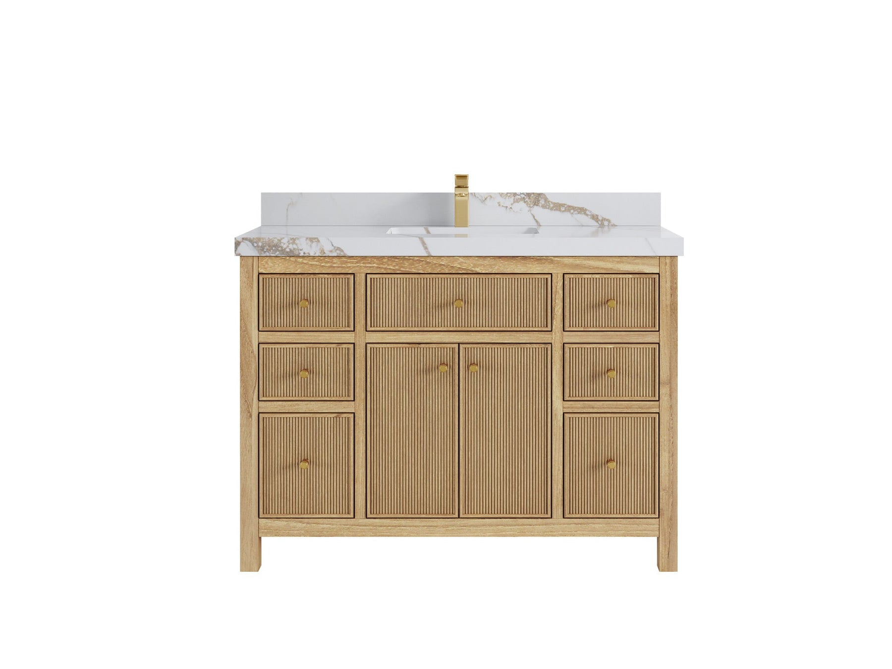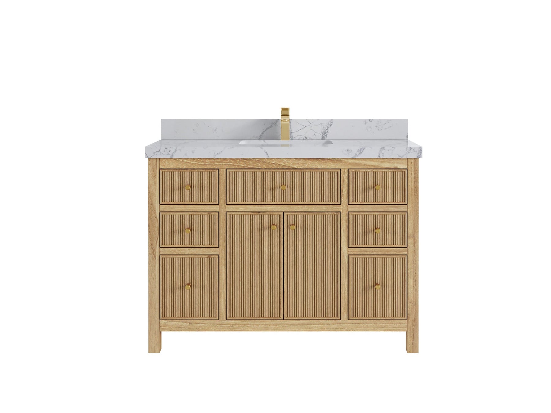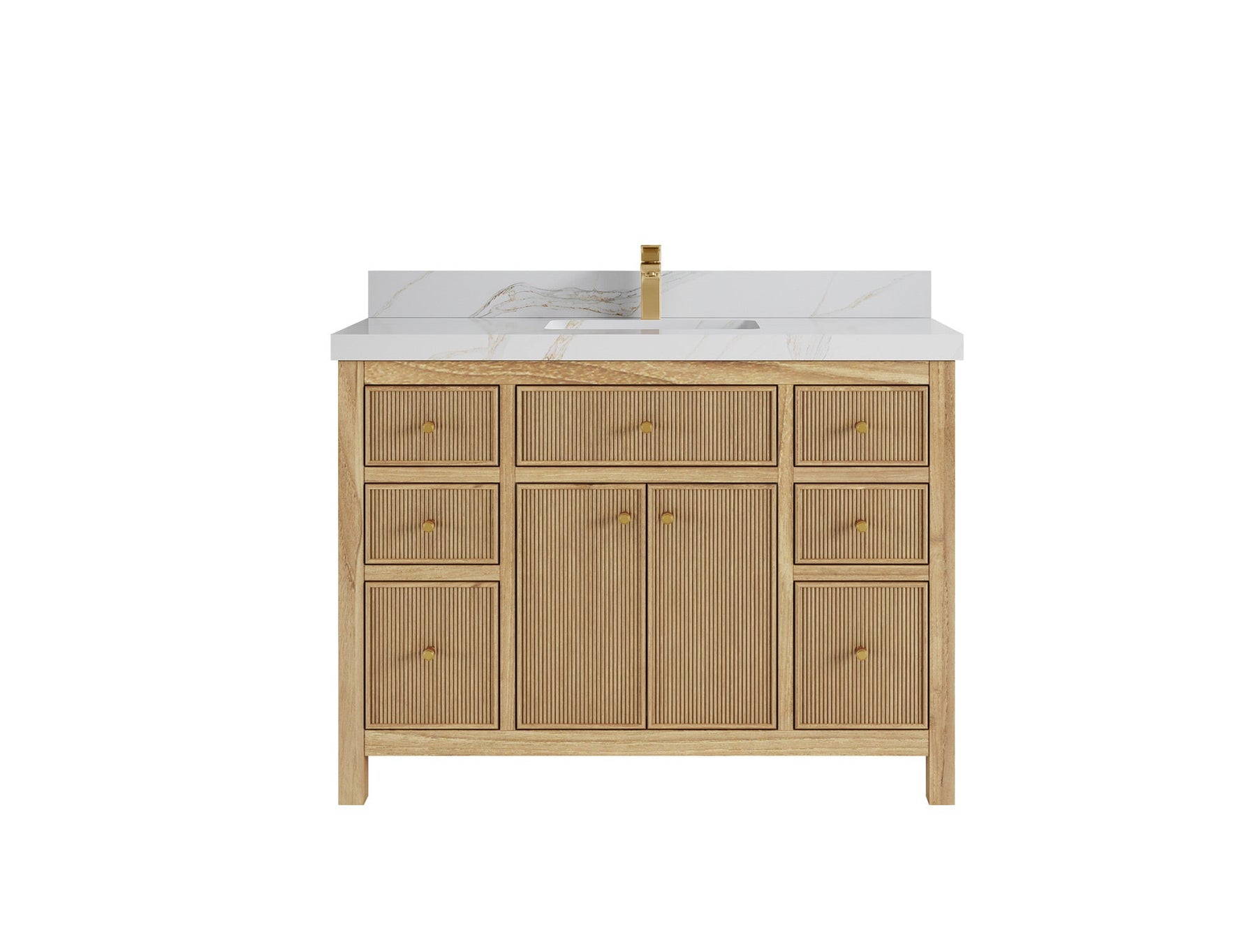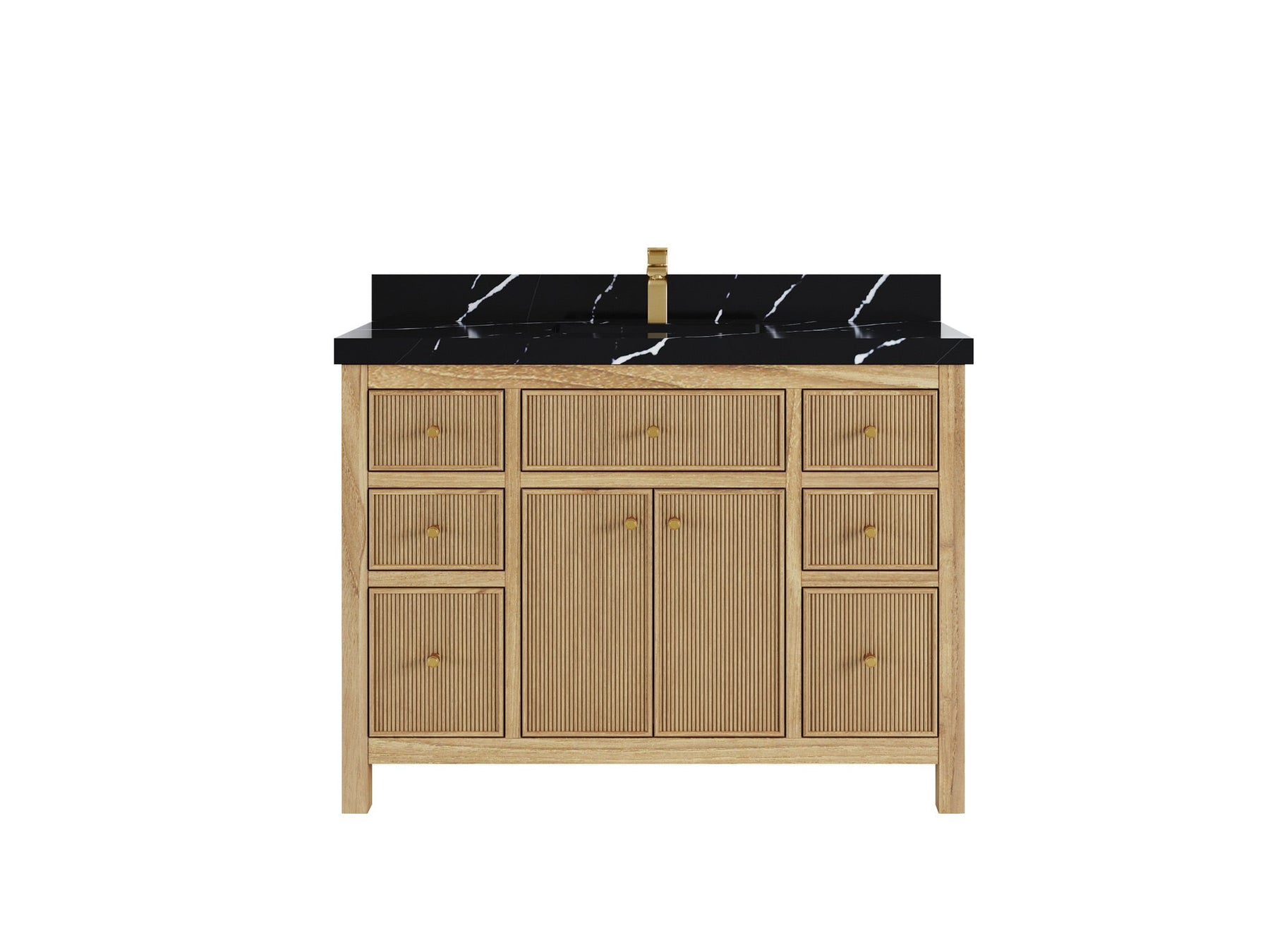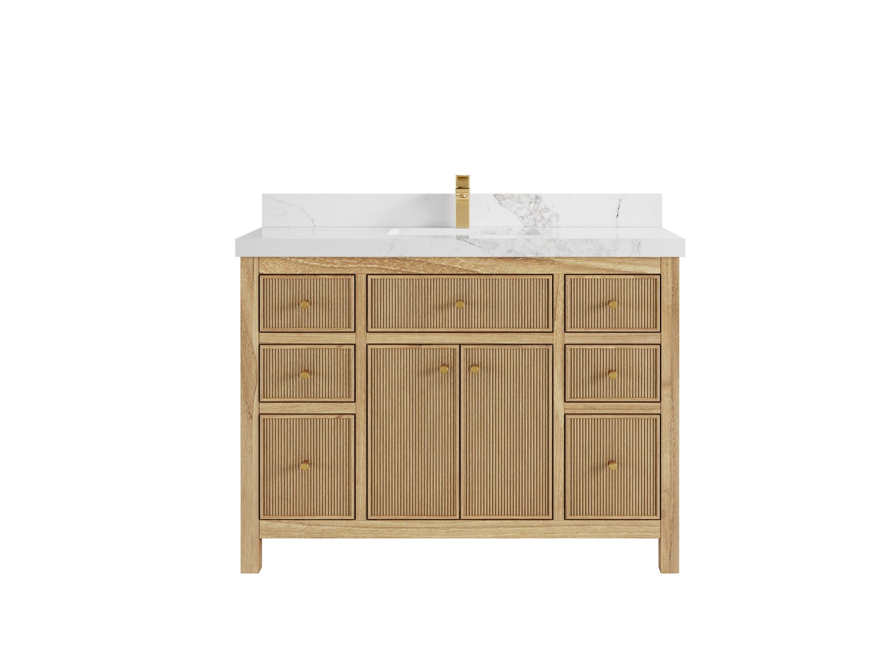 1. Crafted from premium teak wood with reeded design, this vanity showcases a sleek build, complemented by soft-close hardware for quiet and effortless operation. Add antique brass hardware for a touch of vintage charm!
