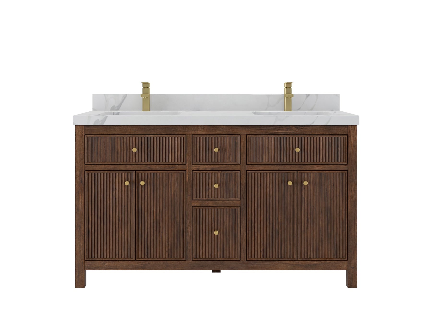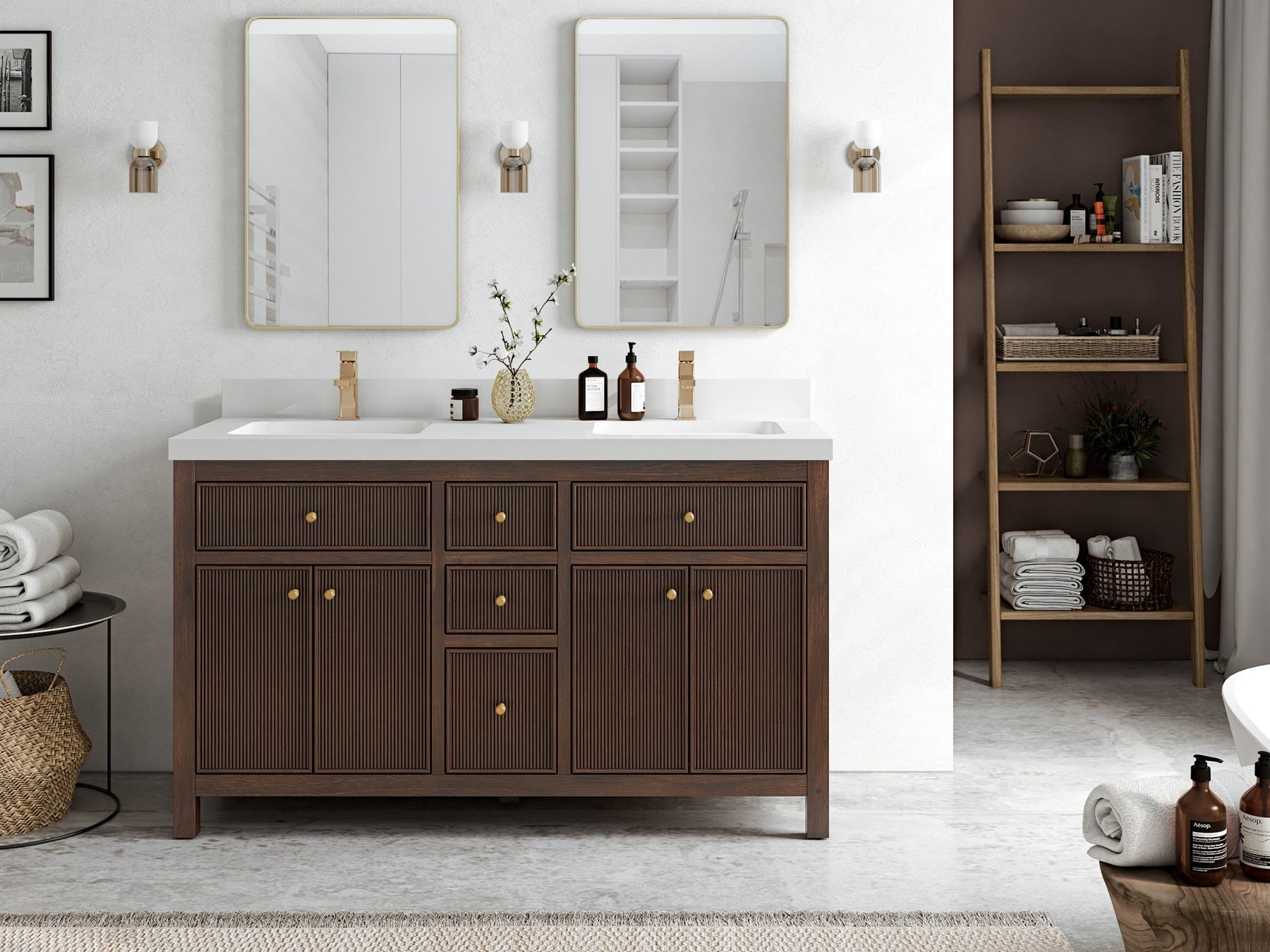 1. Crafted from premium teak wood with reeded design, this vanity showcases a sleek build, complemented by soft-close hardware for quiet and effortless operation. Add antique brass hardware for a touch of vintage charm!