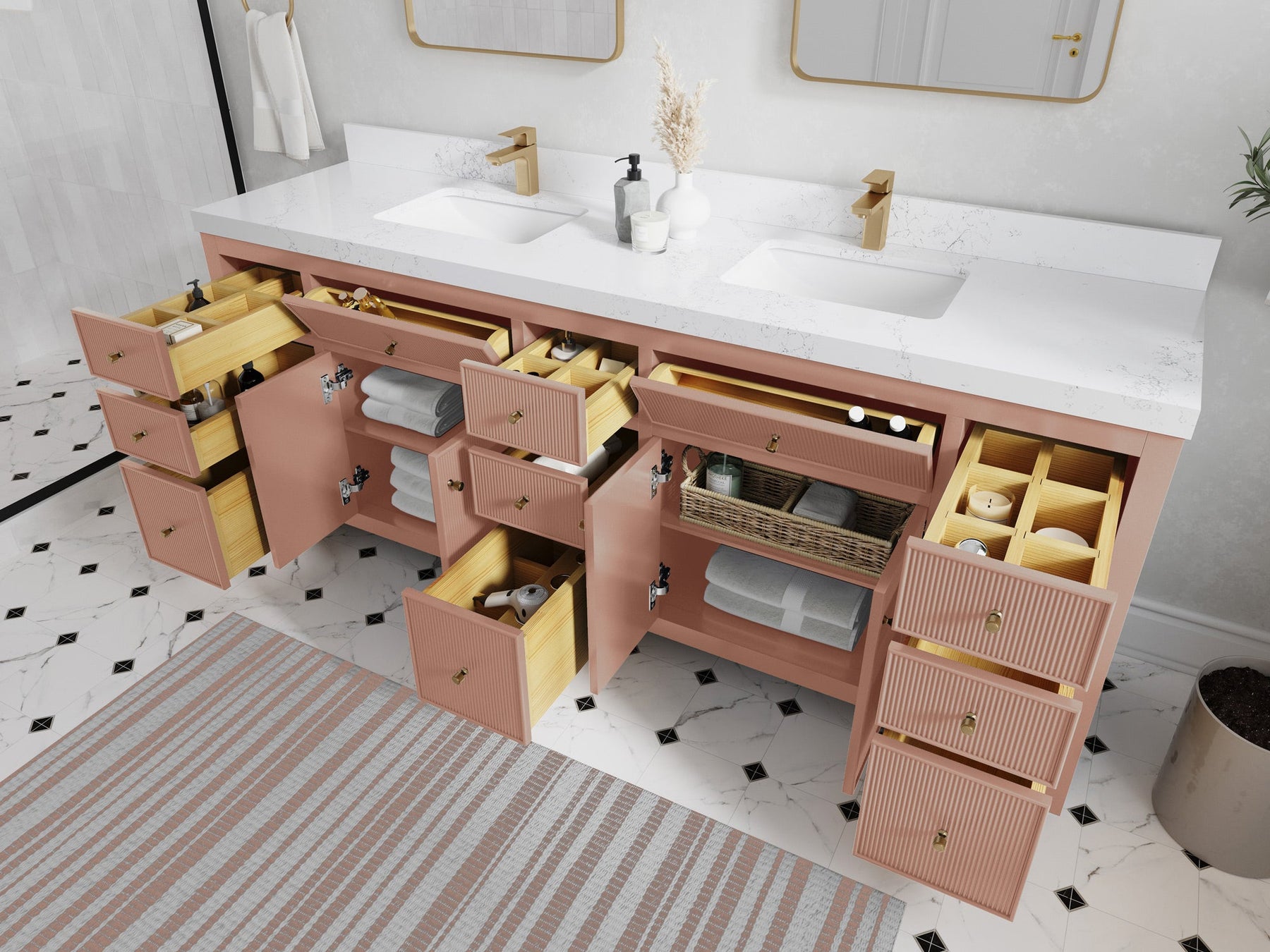 4. Function and form – featuring no less than fifteen front-facing doors and drawers in a reeded design, this vanity unit offers extensive storage and convenience for busy households. Never again will you hunt through a jungle of bottles to find what you are looking for.