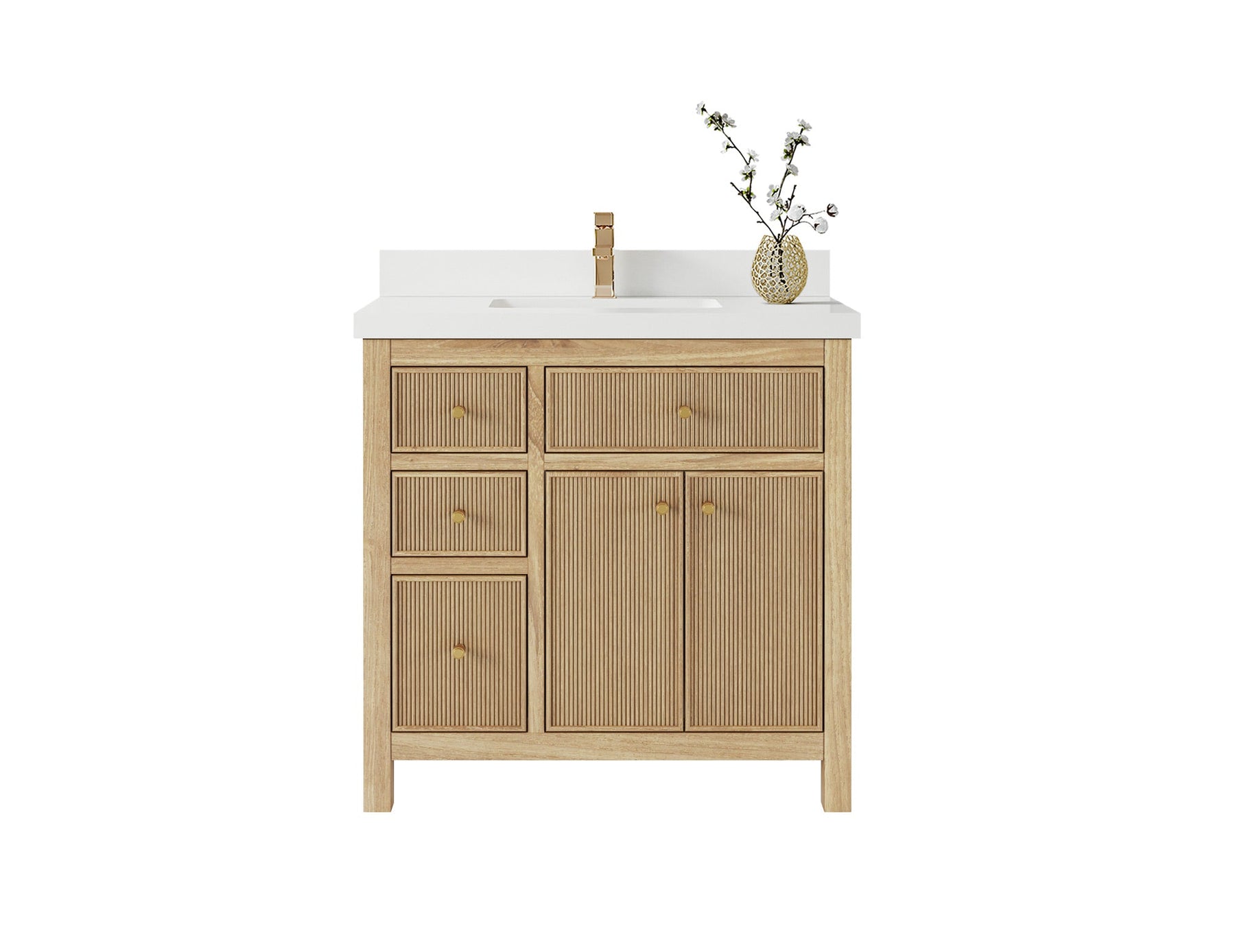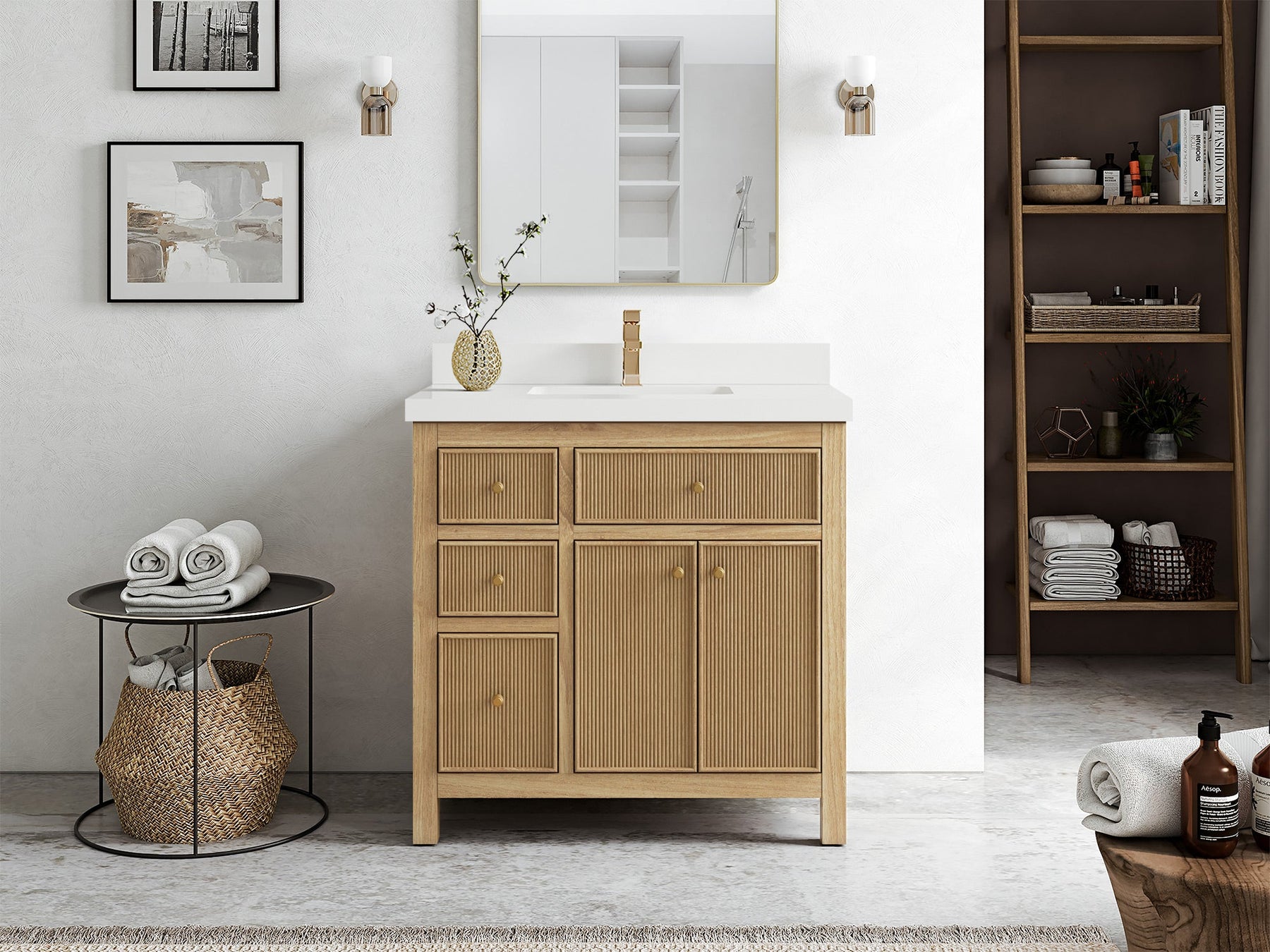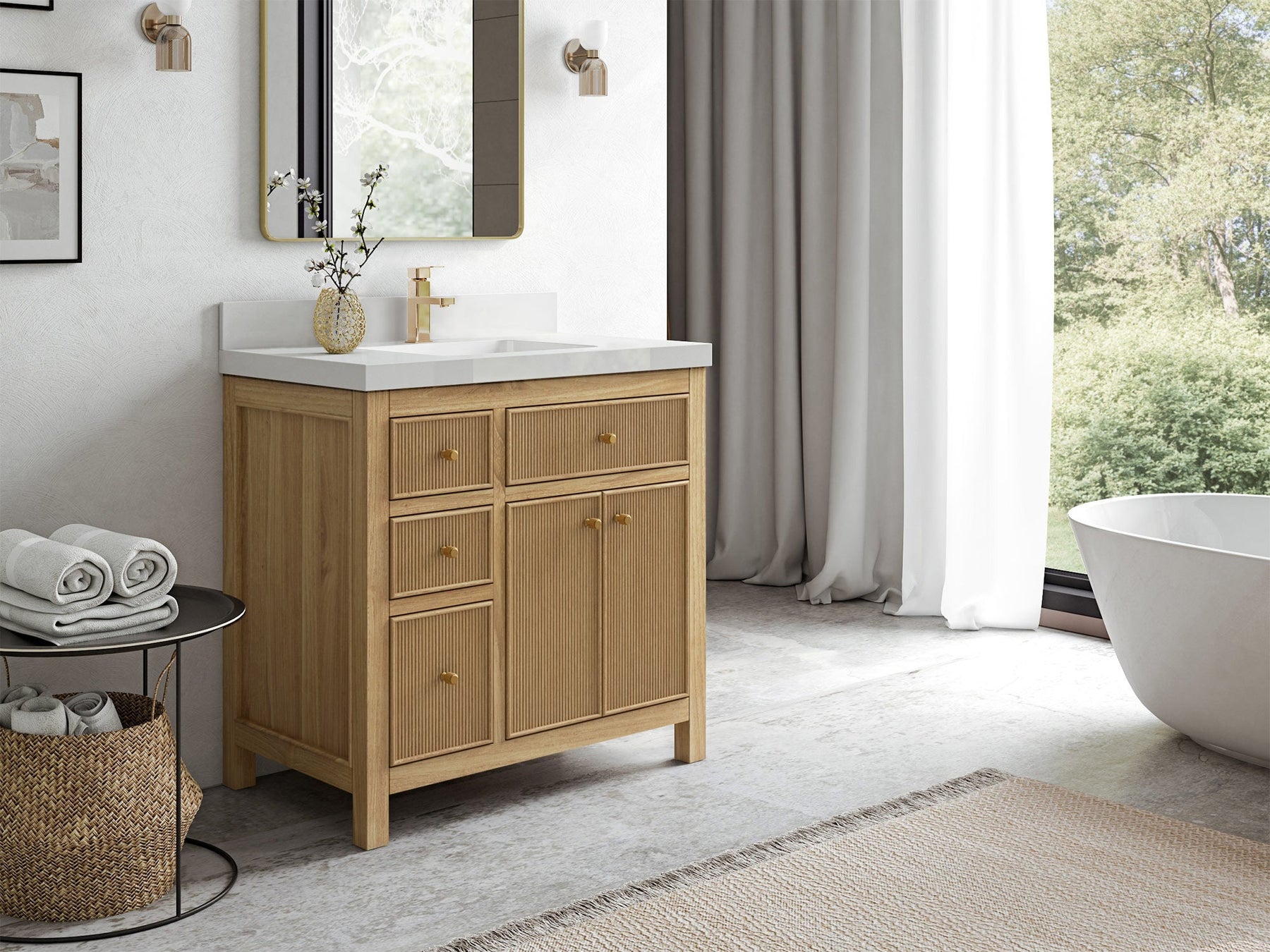1. Crafted from premium teak wood with reeded design, this vanity showcases a sleek build, complemented by soft-close hardware for quiet and effortless operation. Add antique brass hardware for a touch of vintage charm!